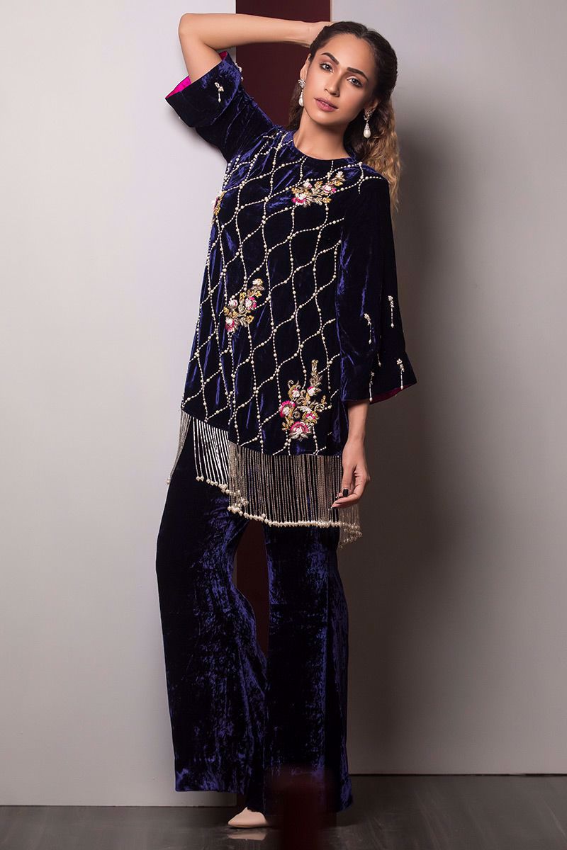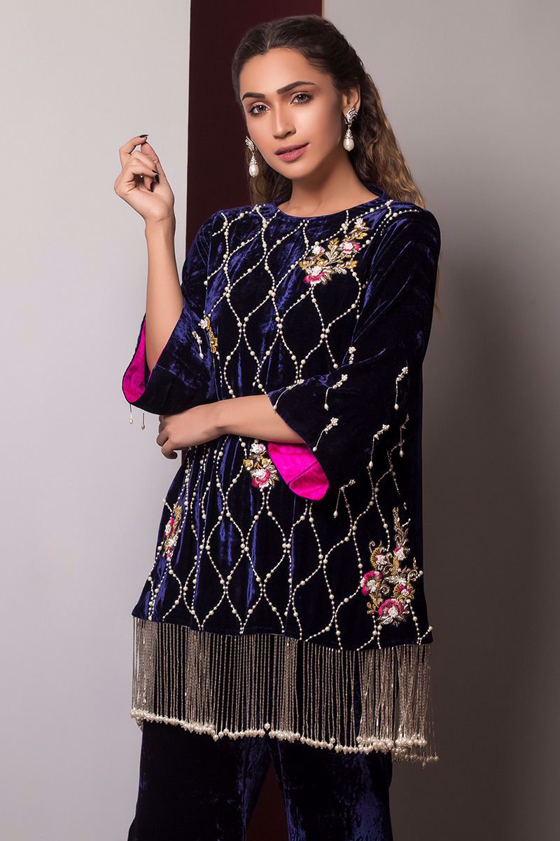 Color: BLUE Fabric: Velvet Work Details: Dabka naqshi, sequins and 3D motifs