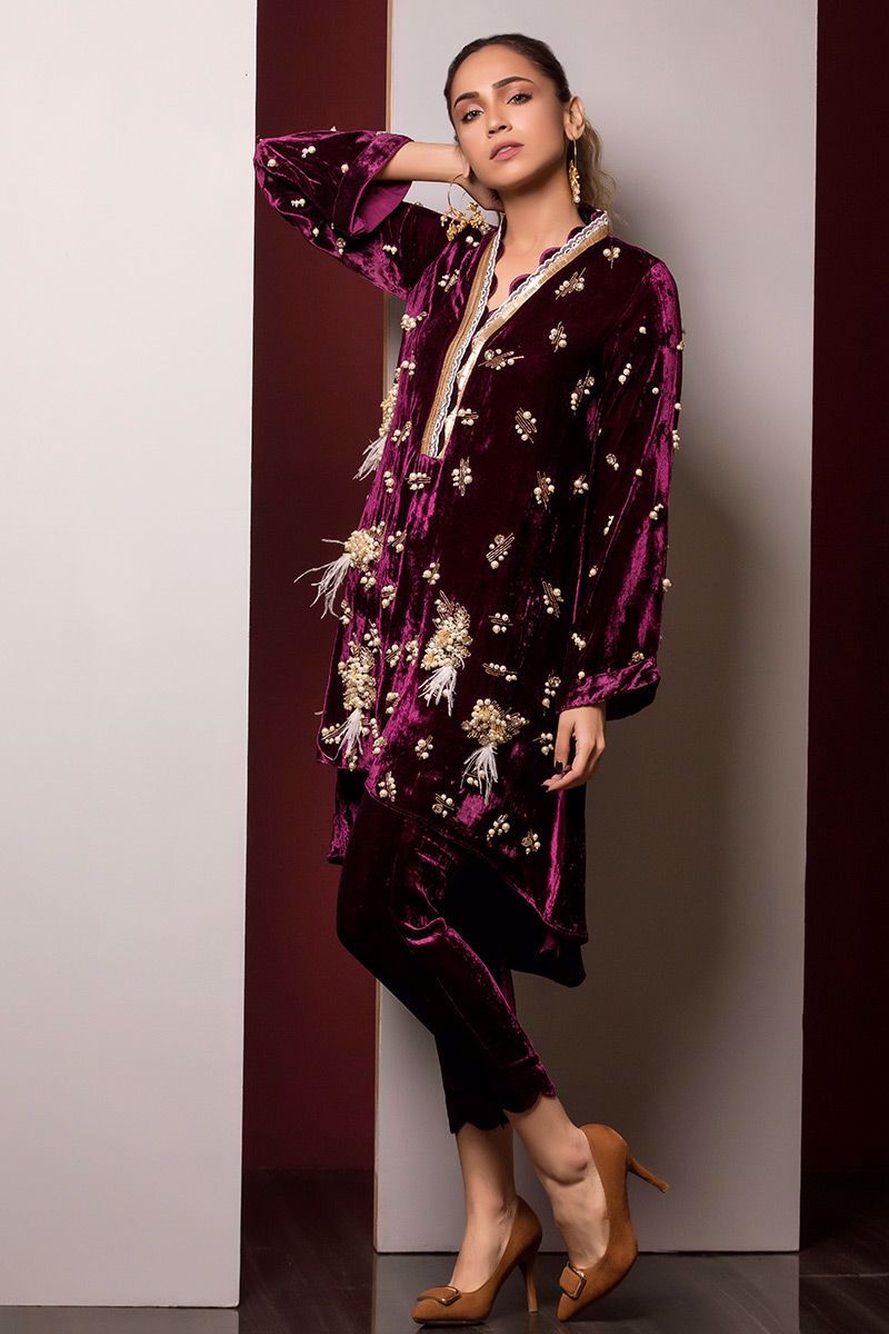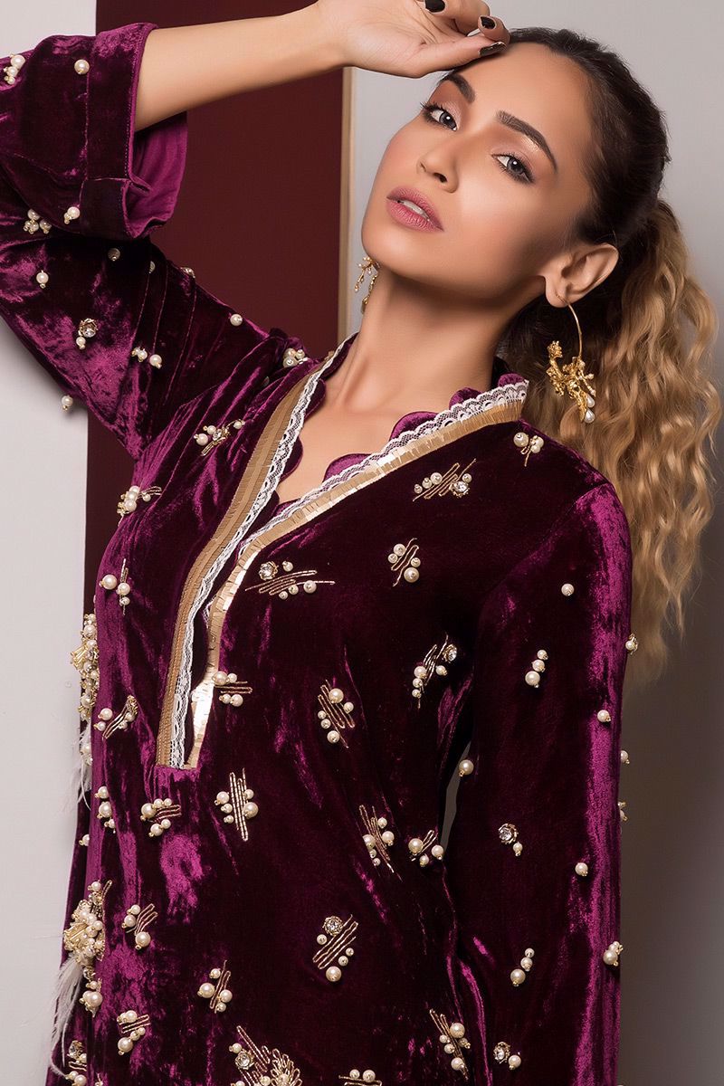 Pure Velvet Plum Top with all over hand worked bunches and chain of cut dana, pearls, stones, feathers and naqshi.