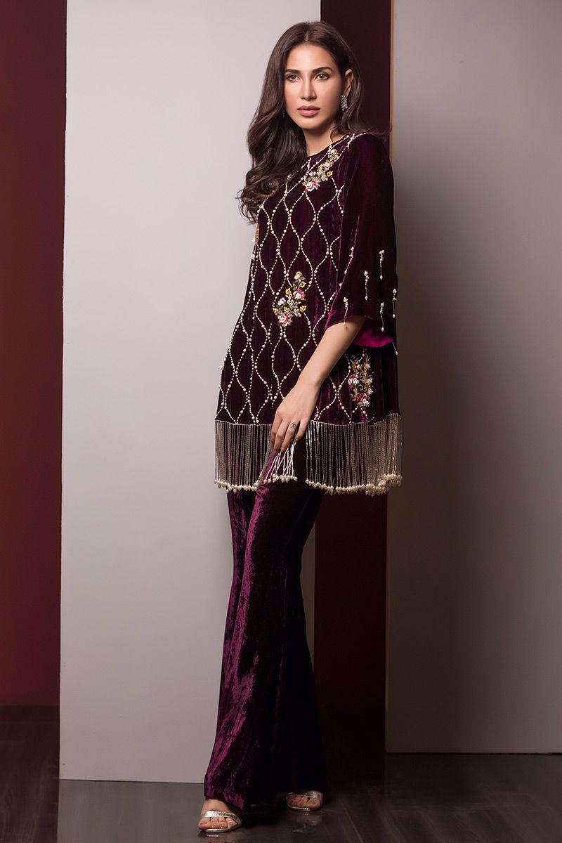 Pure velvet Plum colored Top intricately hand worked with pearls, kora, dabka, naqshi, zari, sequins, tikki stones, 3D flower, cut dana and Resham.