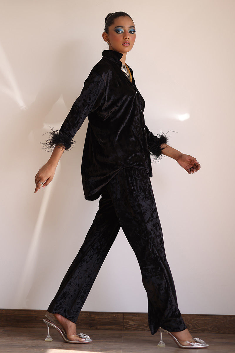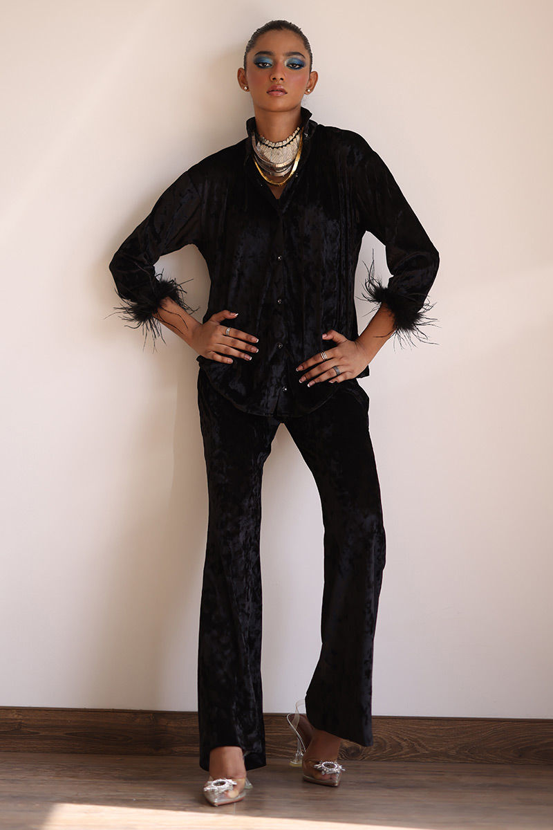 Indulge in the epitome of elegance with Black Velvet ensemble crafted from premium velvet. This outfit effortlessly combines classic style with luxurious comfort. The bell-bottom sleeves are adorned with lavish fur lace, adding an element of sophistication and charm to this ensemble. The bell-bottom pants complete the look with a touch of retro charm.