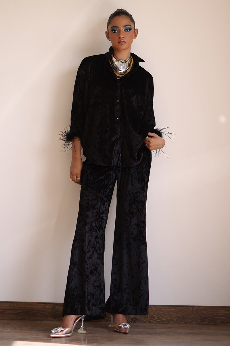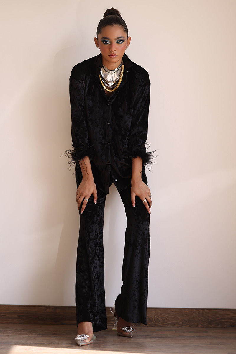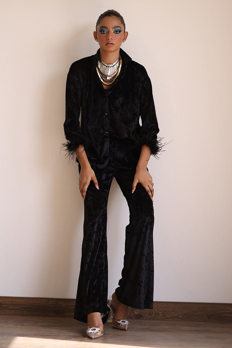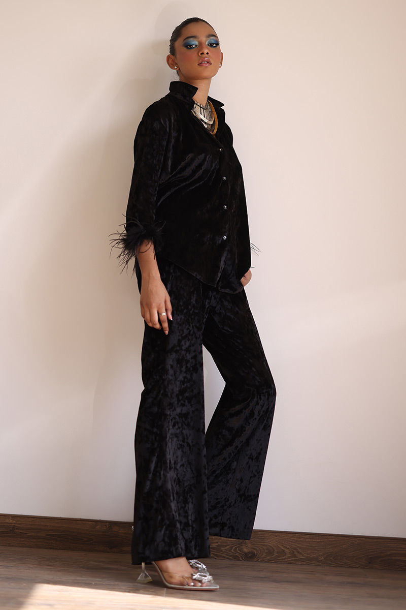 Suitable For XS to SvIndulge in the epitome of elegance with Black Velvet ensemble crafted from premium ice velvet. This outfit effortlessly combines classic style with luxurious comfort. The bell-bottom sleeves are adorned with lavish fur lace, adding an element of sophistication and charm to this ensemble. The bell-bottom pants complete the look with a touch of retro charm.