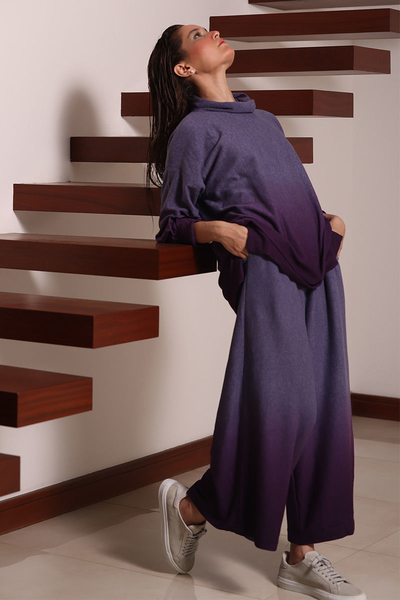 This purple ash ombre design that transitions from lighter purple to deep shade, creating a mesmerizing and dynamic element to your look. Embrace the cozy allure of knitwear and step out with confidence in this versatile ensemble that's perfect for embracing any day with style. The loose culottes offer a relaxed fit, allowing for ease and a touch of laid-back elegance.
