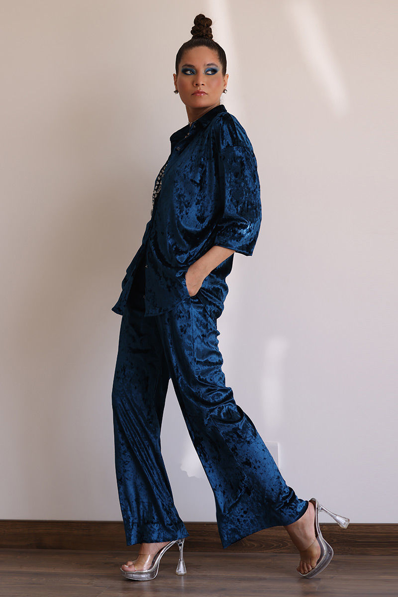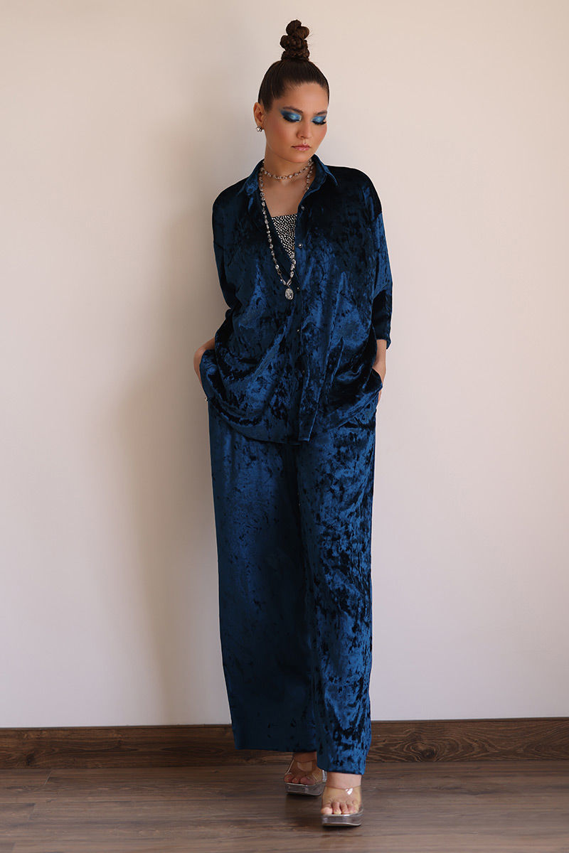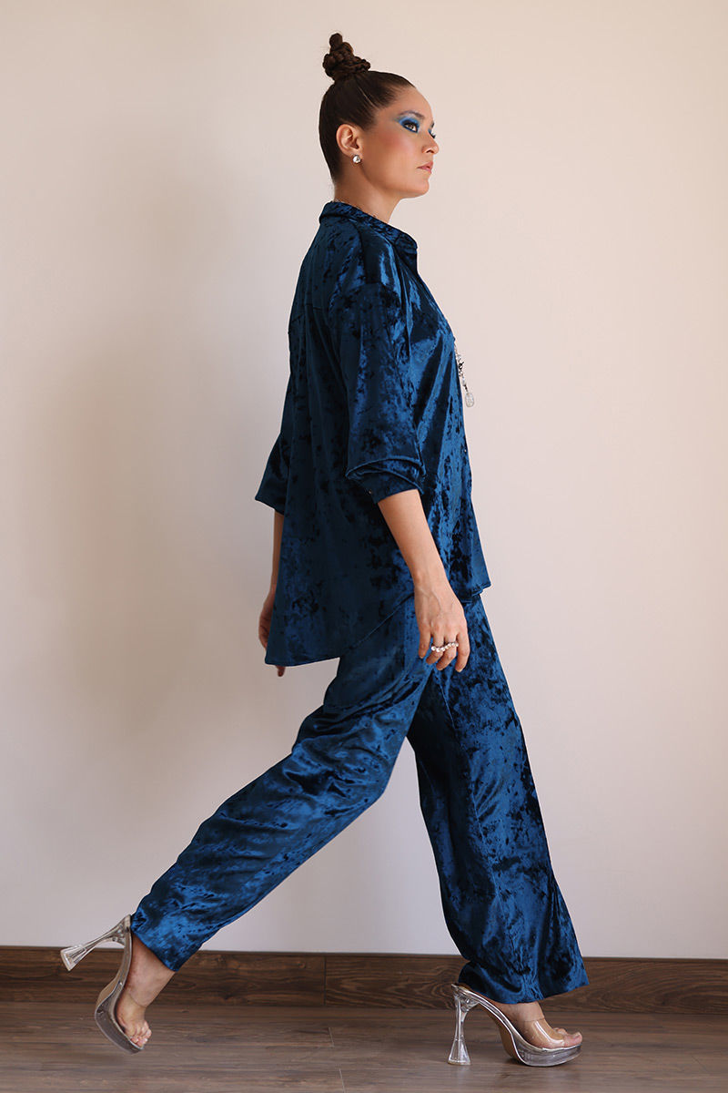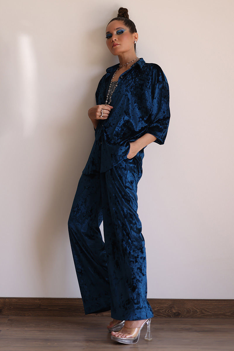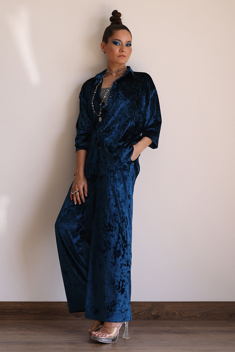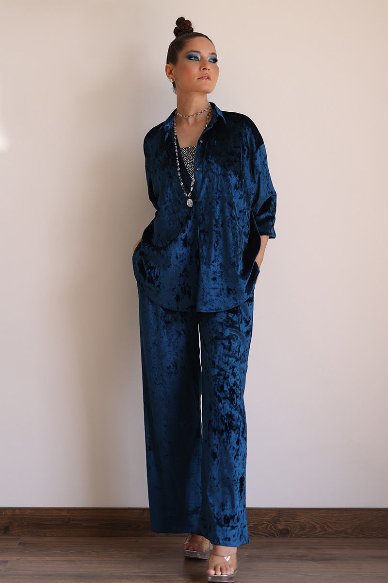 Elevate your style with our teal blue velvet ensemble. This outfit effortlessly blends sophistication with comfort, ensuring you shine in every setting. Crafted from velvet, this ensemble invites you to experience sheer opulence. The Culottes complete the look with a touch of retro charm. The loose culottes provide an easy and relaxed fit, perfect for both casual gatherings and formal occasions.