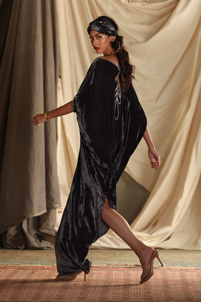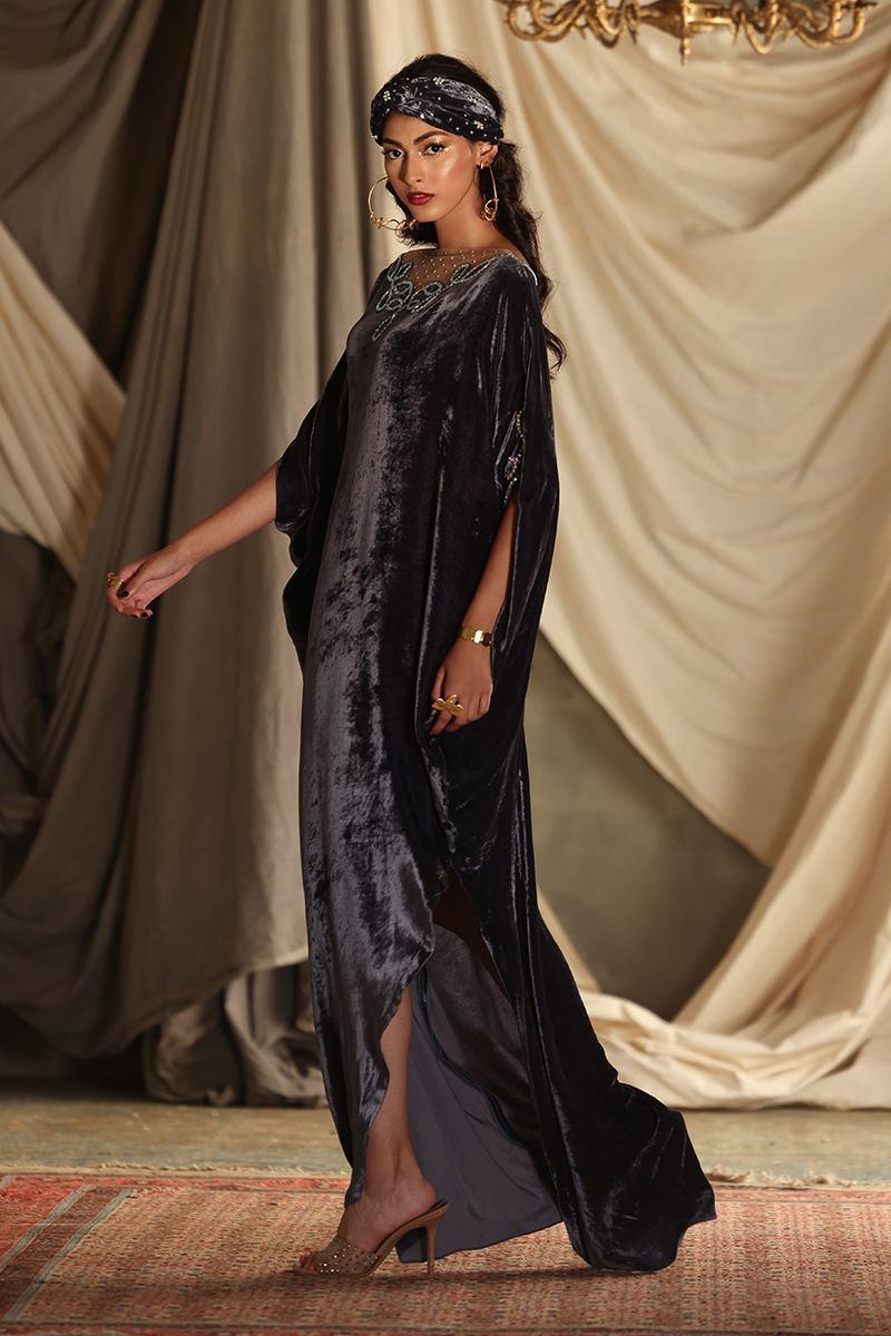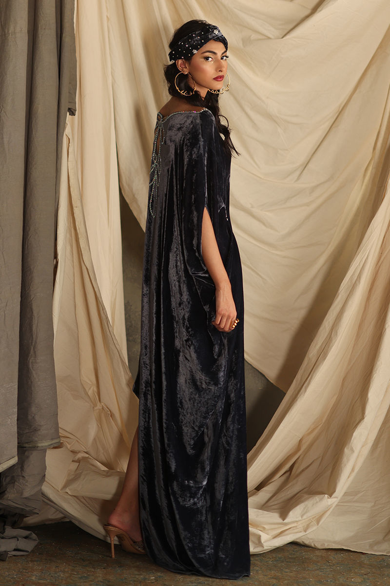 Elevate your wardrobe with our stunning Steeple Grey Velvet Kaftan, a perfect blend of elegance and comfort. Crafted from pure velvet, this luxurious kaftan features exquisite hand-stitched stone work that adorns the front, back, and sleeves, adding a touch of opulence to your look. With a generous length of 58 inches, this kaftan offers a flattering silhouette that drapes beautifully on all body types. The soft, rich texture of the velvet ensures you stay comfortable while making a bold fashion statement. Ideal for special occasions or evening events, this kaftan pairs beautifully with statement jewellery and heels, making it a versatile addition to your collection. Make the Steeple Grey Velvet Kaftan your go-to choice for sophistication and style—where timeless craftsmanship meets modern elegance!