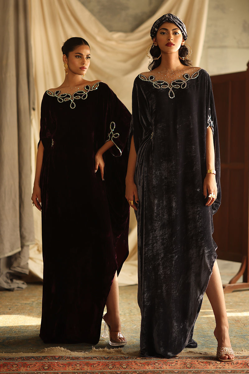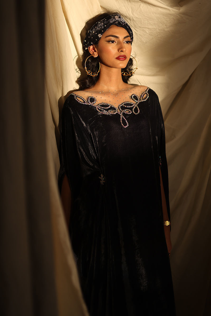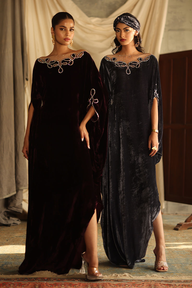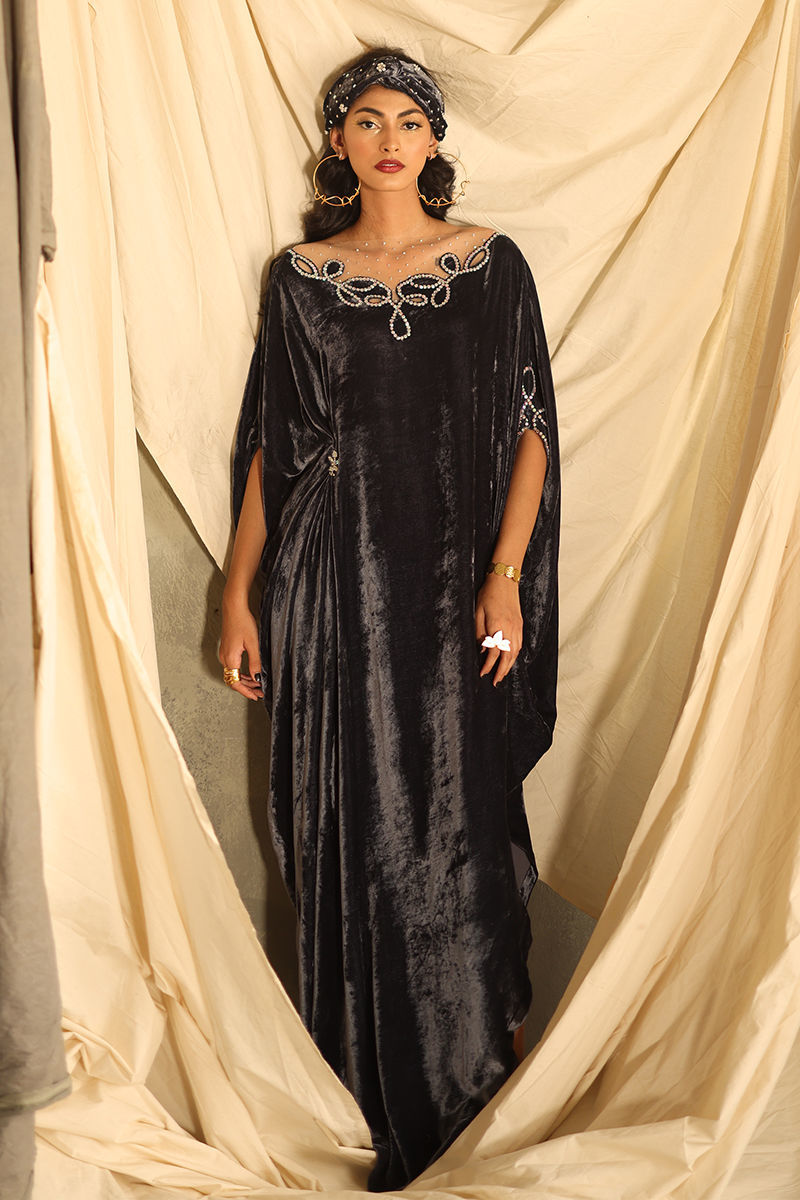 Elevate your wardrobe with our stunning Steeple Grey Velvet Kaftan, a perfect blend of elegance and comfort. Crafted from pure velvet, this luxurious kaftan features exquisite hand-stitched stone work that adorns the front, back, and sleeves, adding a touch of opulence to your look. With a generous length of 58 inches, this kaftan offers a flattering silhouette that drapes beautifully on all body types. The soft, rich texture of the velvet ensures you stay comfortable while making a bold fashion statement. Ideal for special occasions or evening events, this kaftan pairs beautifully with statement jewellery and heels, making it a versatile addition to your collection. Make the Steeple Grey Velvet Kaftan your go-to choice for sophistication and style—where timeless craftsmanship meets modern elegance!