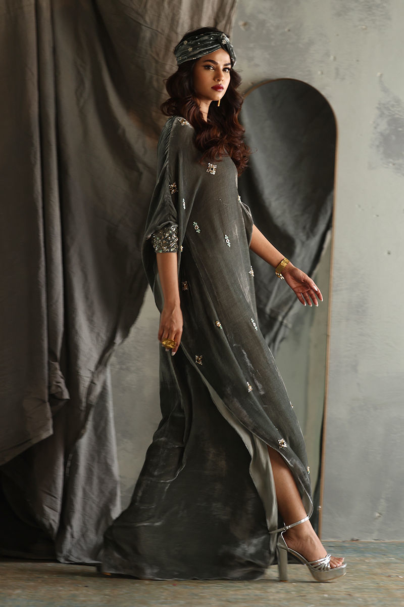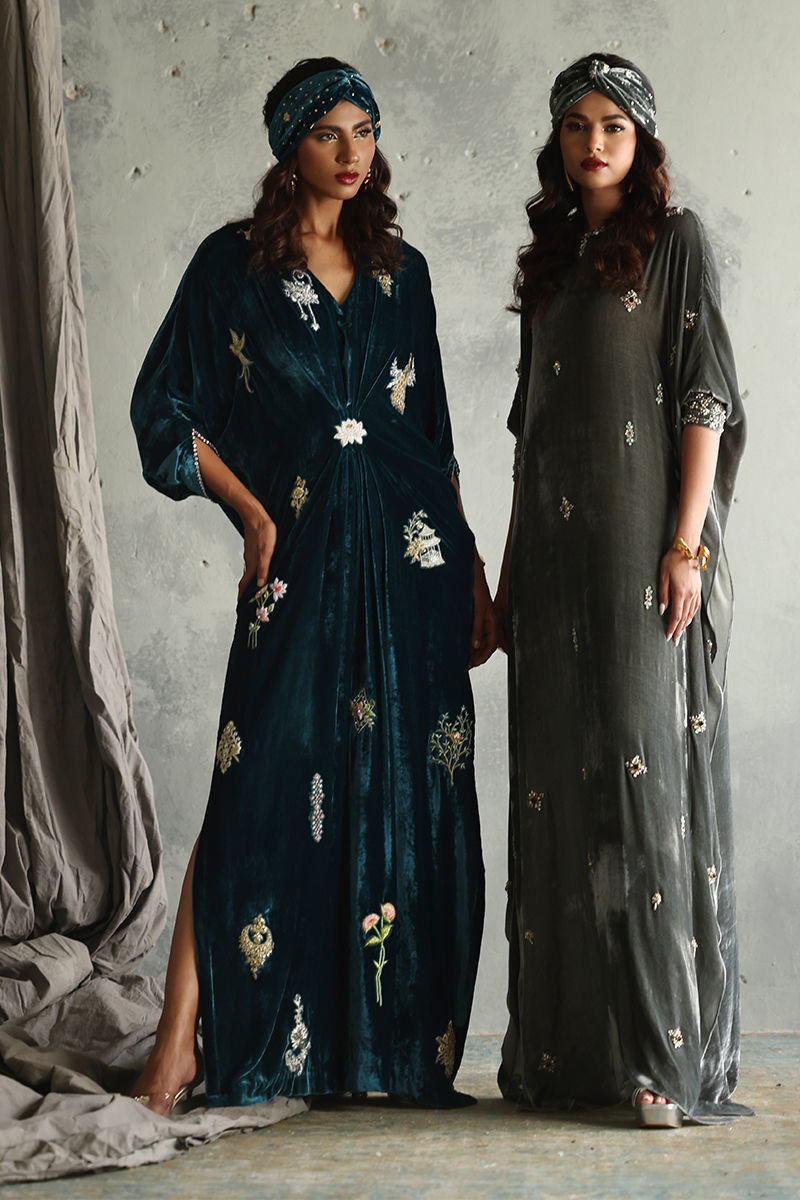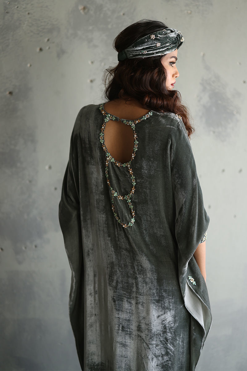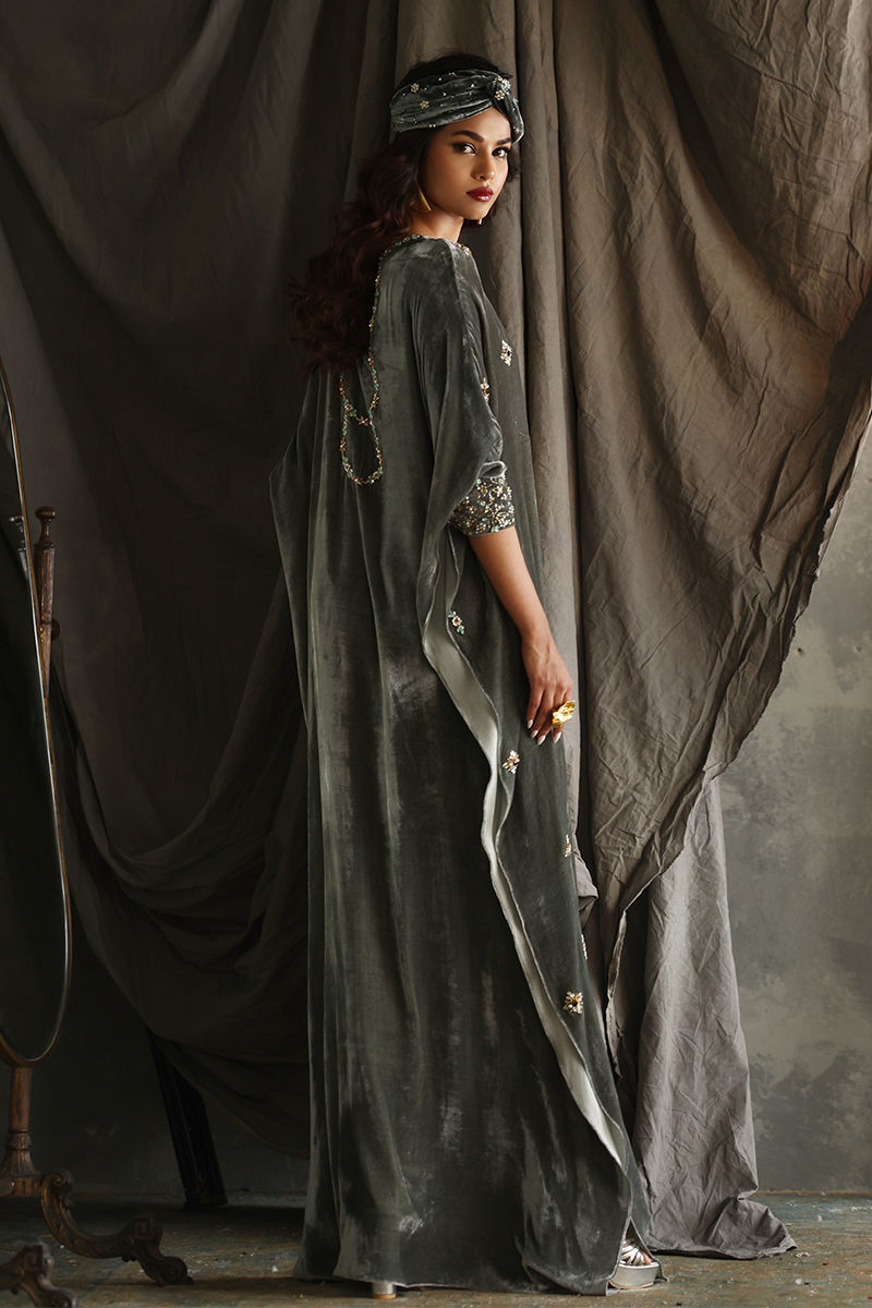Elevate your wardrobe with our stunning Granite Green Kaftan. Crafted from luxurious pure velvet, this kaftan features a length of 58 inches, designed to create a graceful silhouette. The allover botis design is intricately embellished with exquisite handwork, including tikki stones, crystals, colored stones, pearls, kora, and cutdana. Detailed handwork on the back and cuffs adds an extra layer of sophistication. Perfect for special occasions or elegant evenings, this kaftan pairs beautifully with the accompanying band for a cohesive look. Embrace timeless elegance and artistry with this captivating piece! It includes Kaftan and Pants.