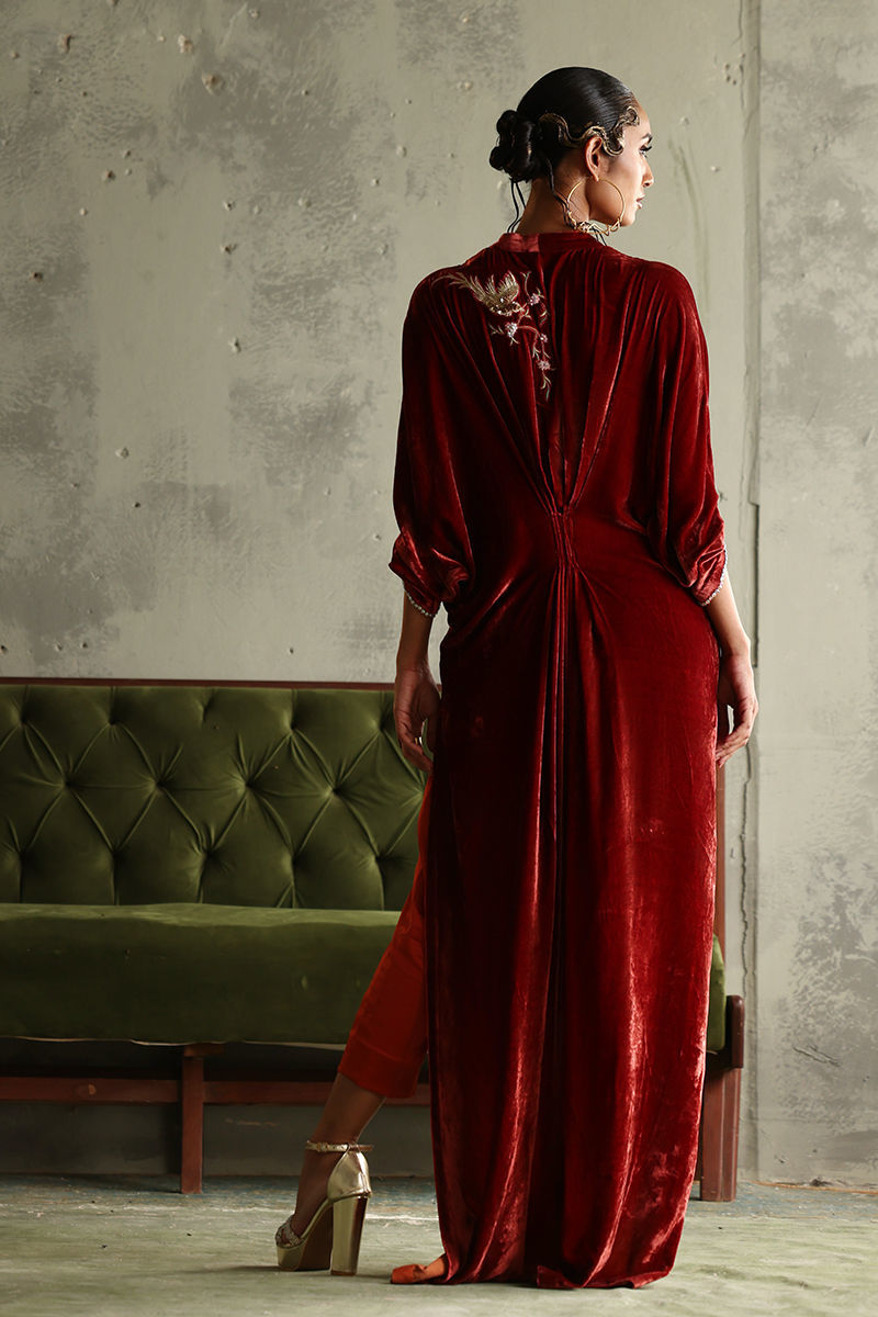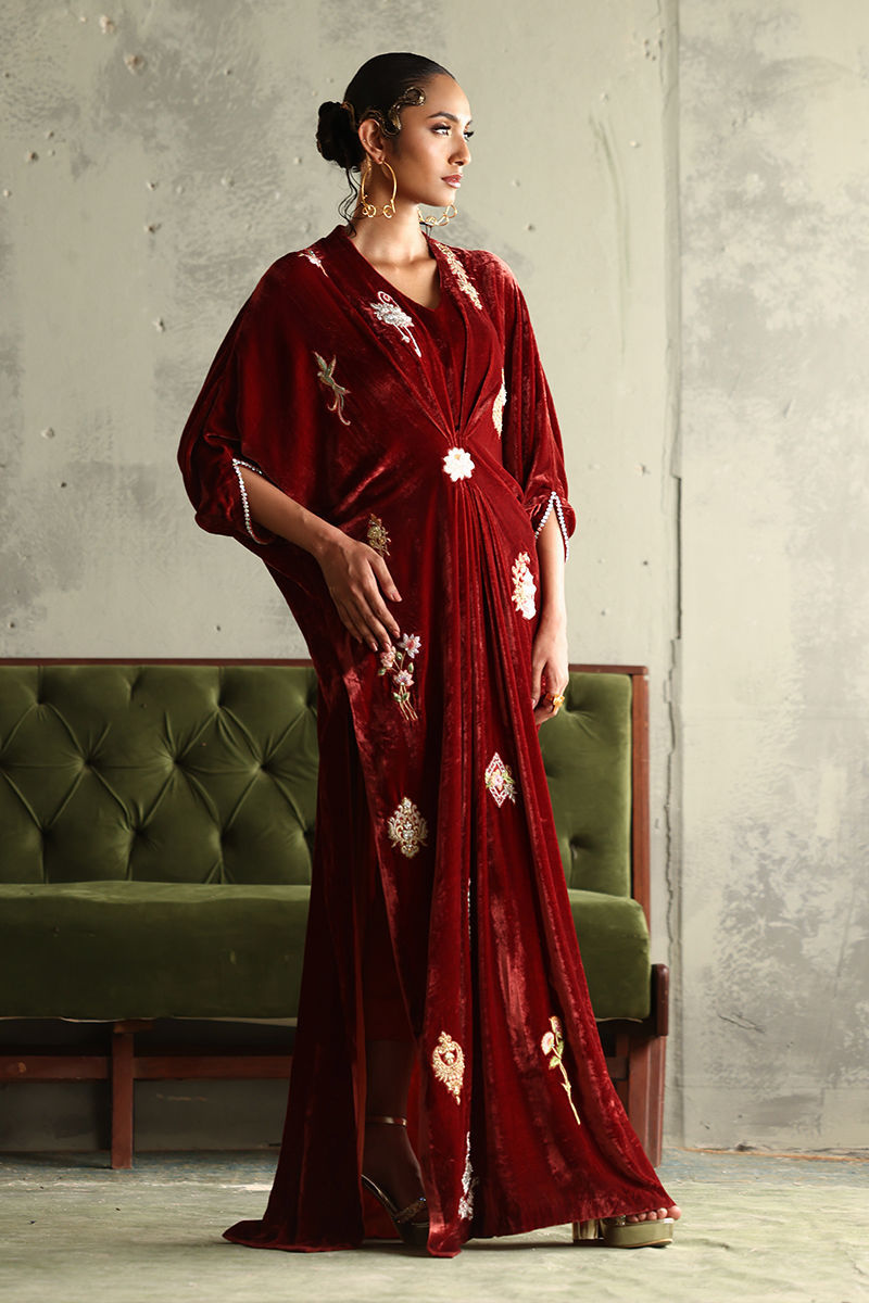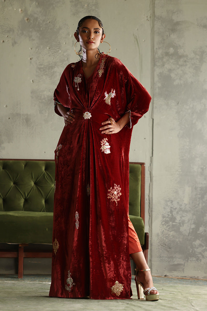 Introducing our stunning Burnt Orange Pleated Kaftan, crafted from luxurious pure velvet for a rich and sophisticated look. With a length of 58 inches, this kaftan features exquisite front and back embroidery in vibrant coloured resham, accented with silver and gold zari and lorex zari for a touch of glamour. The intricate handwork includes sparkling stones, sequins, and cutdana, adding layers of texture and elegance.