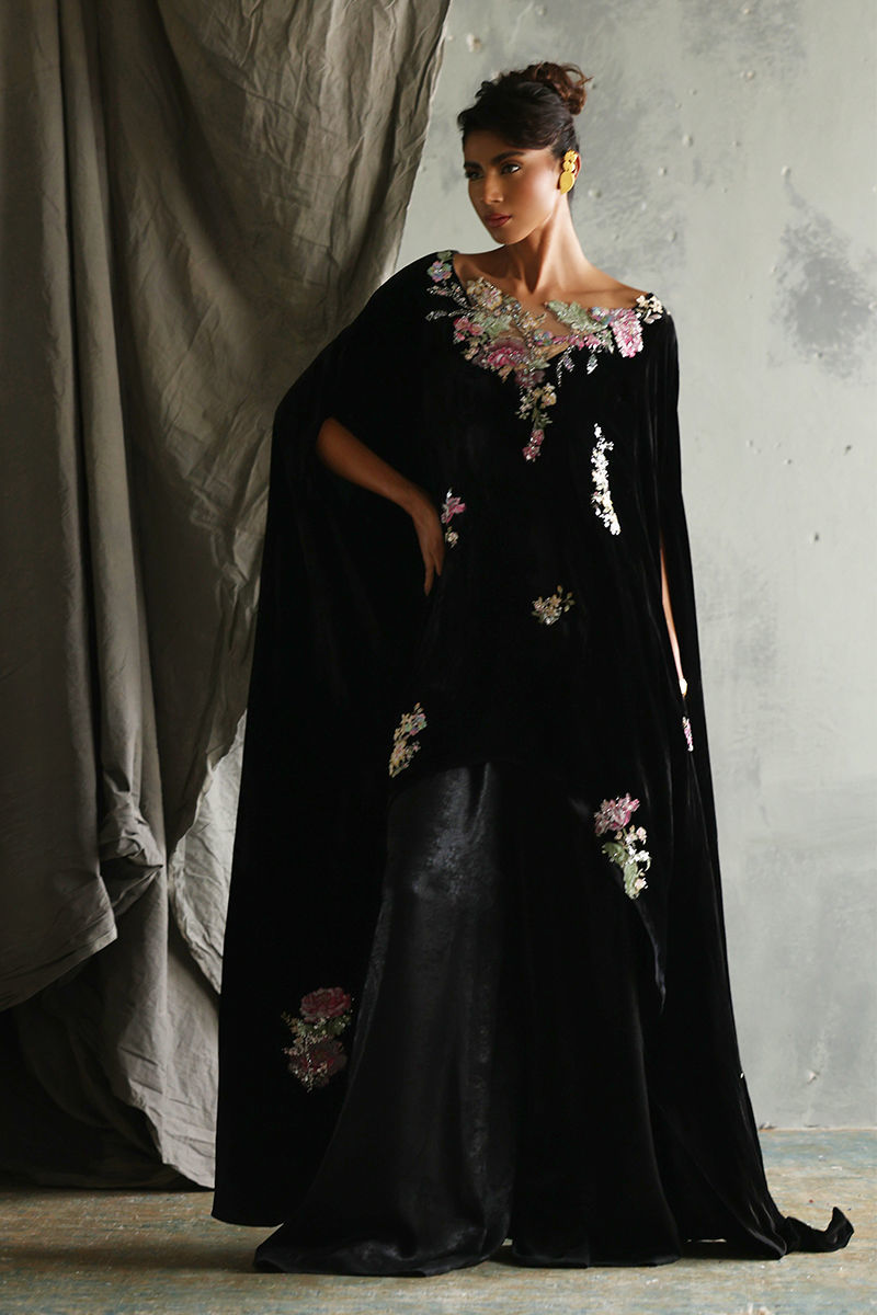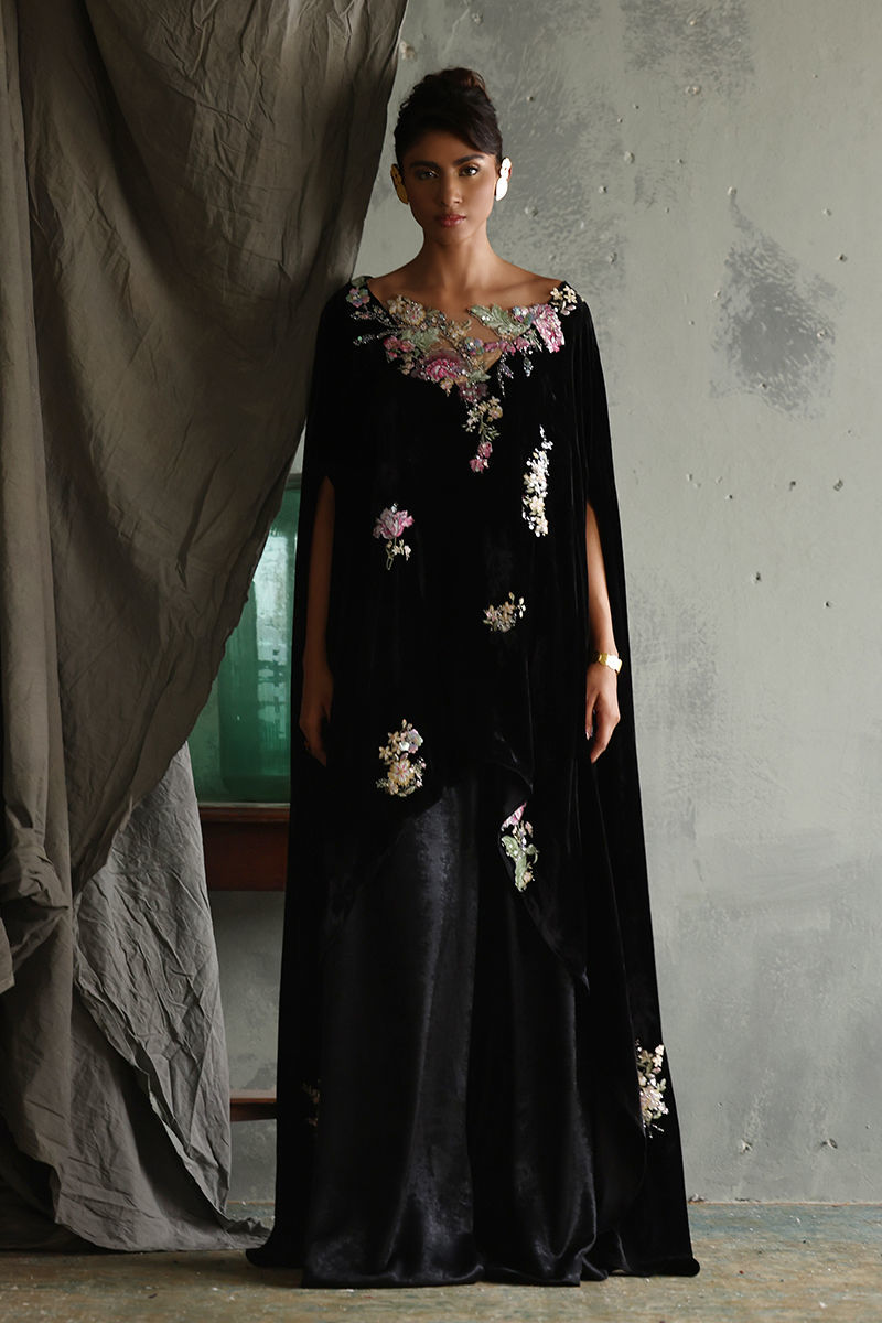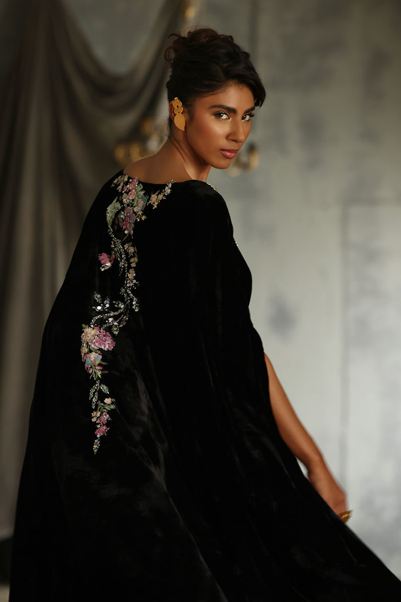 Discover our elegant Black Velvet Poncho, designed for those who appreciate luxury and style. This exquisite piece features a front length of 32 inches and a flowing back length of 58 inches, creating a dramatic silhouette. Crafted from pure velvet, it boasts stunning 3D printed and resham embroidered motifs, beautifully highlighted with sequins and cutdana work for an eye-catching effect. Perfect for layering over evening wear or making a statement at special events, this poncho is a versatile addition to your wardrobe. Embrace sophistication with this unique blend of artistry and comfort!