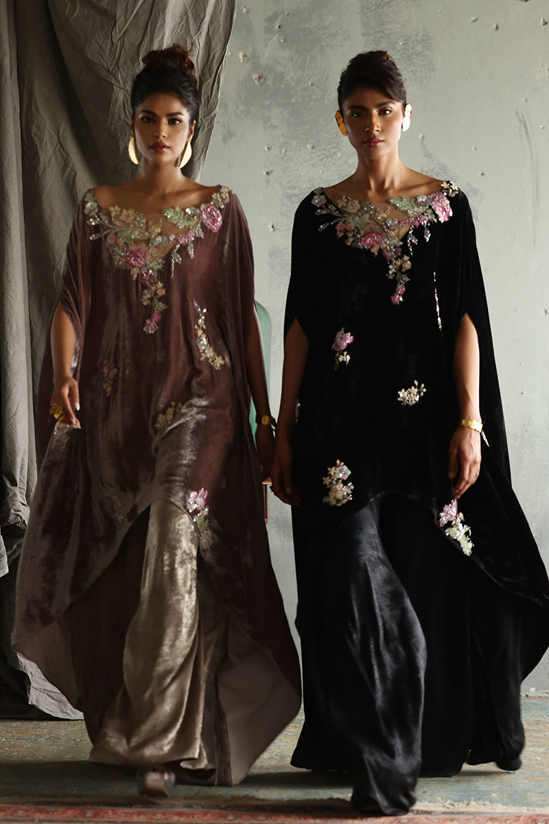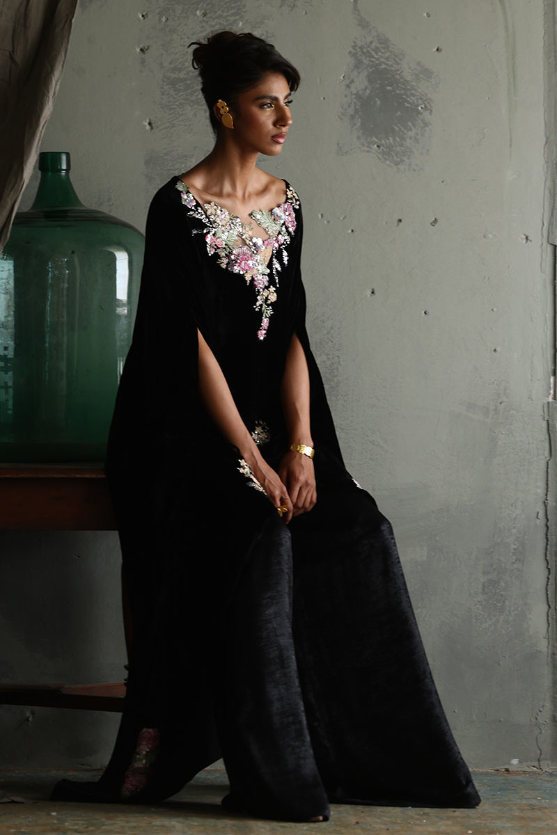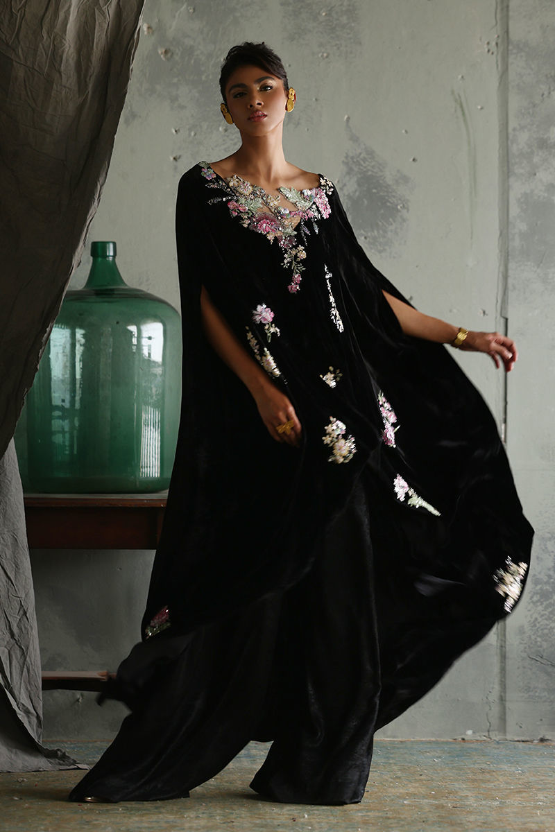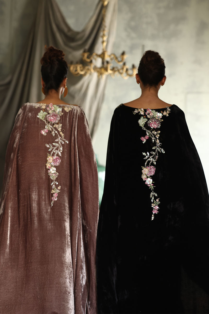 Discover our elegant Black Velvet Poncho, designed for those who appreciate luxury and style. This exquisite piece features a front length of 32 inches and a flowing back length of 58 inches, creating a dramatic silhouette. Crafted from pure velvet, it boasts stunning 3D printed and resham embroidered motifs, beautifully highlighted with sequins and cutdana work for an eye-catching effect. Perfect for layering over evening wear or making a statement at special events, this poncho is a versatile addition to your wardrobe. Embrace sophistication with this unique blend of artistry and comfort!