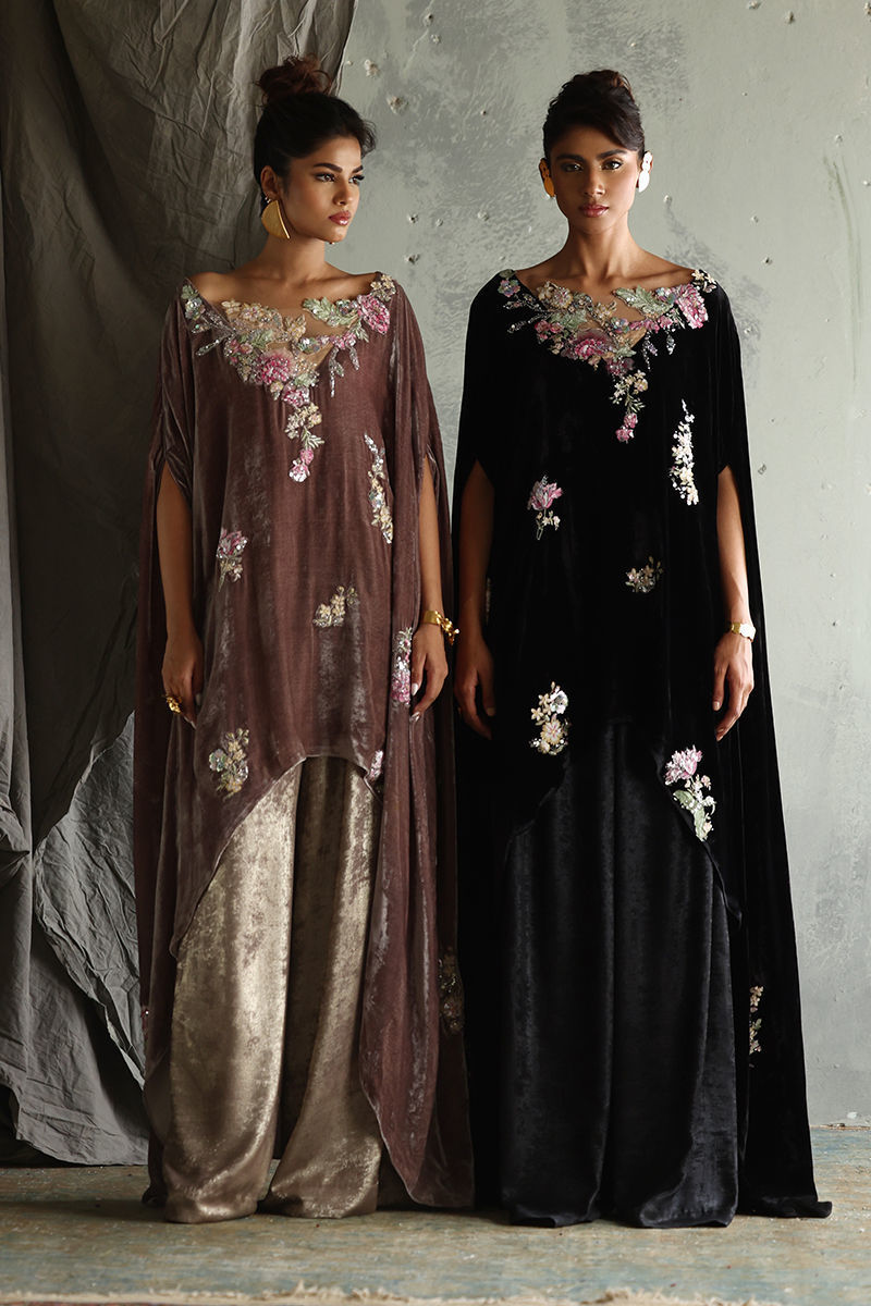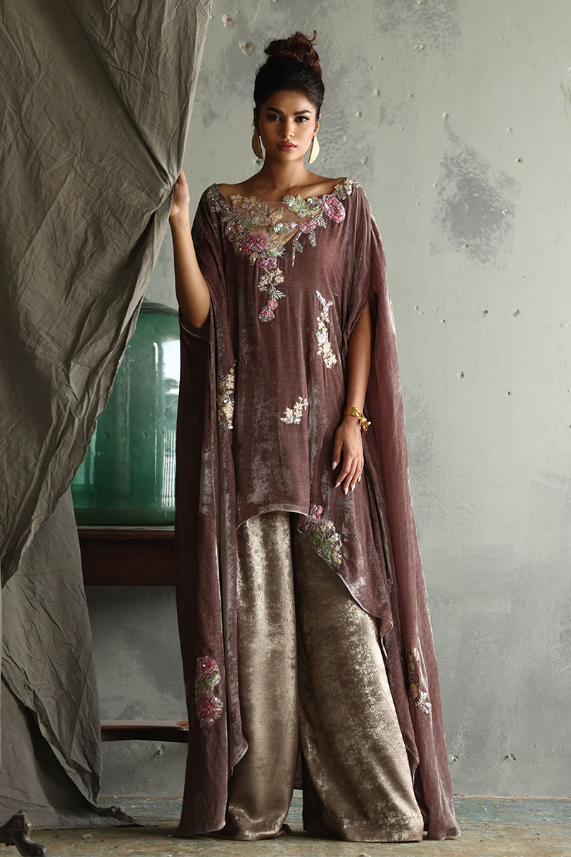Elevate your style with our stunning Light Taupe Velvet Poncho, a perfect blend of elegance and sophistication. This exquisite piece features a front length of 32 inches and a flowing back length of 58 inches, designed to create a graceful silhouette. Crafted from pure velvet, it showcases intricate 3D printed and resham embroidered motifs, beautifully enhanced with sequins and cutdana work for a touch of glamour. Ideal for layering over evening wear or adding flair to any outfit, this poncho is a versatile addition to your wardrobe. Embrace luxury and artistry with this unique statement piece! It includes Kaftan and Pants.