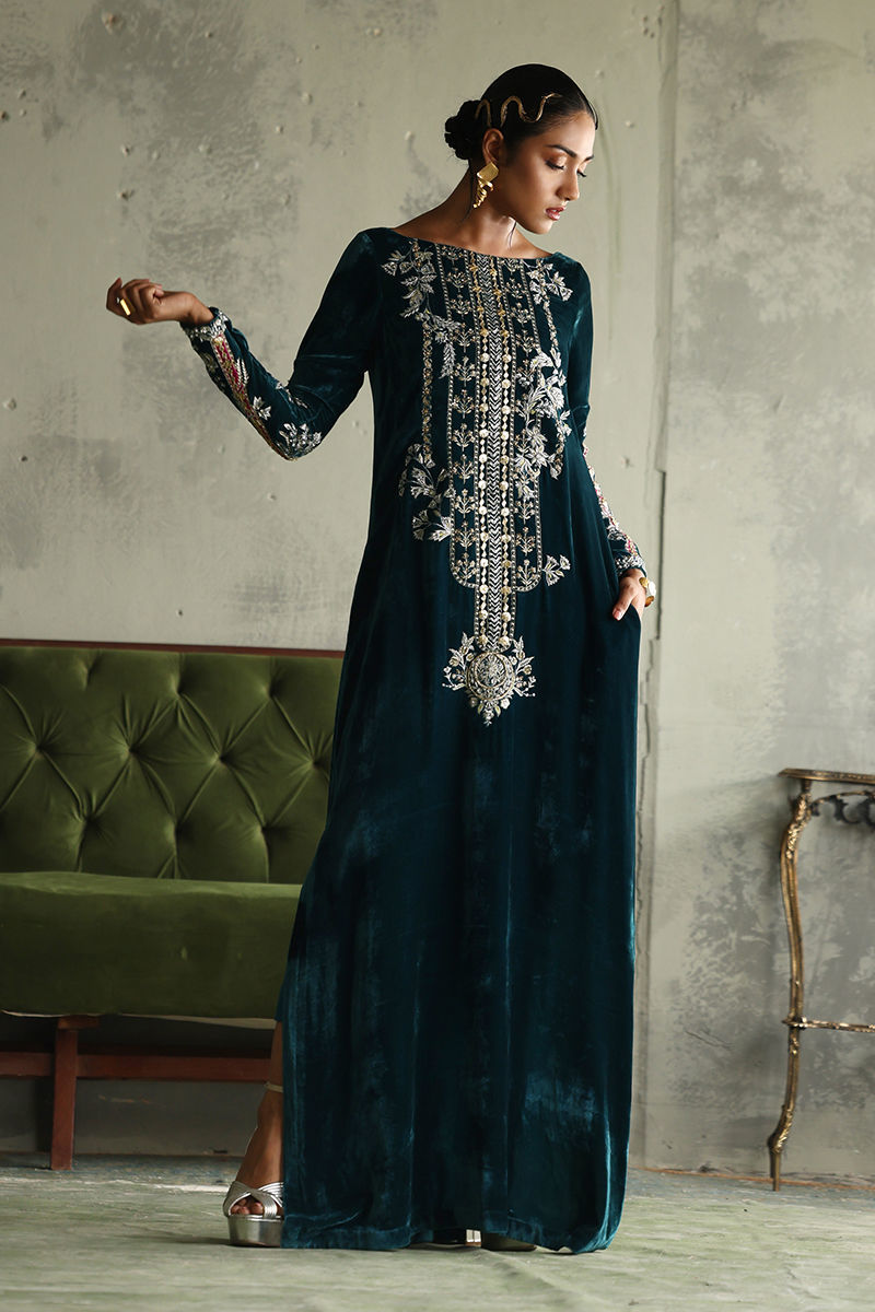 Elevate your elegance with our stunning Peacock Teal Straight Kaftan, crafted from pure velvet for a luxurious feel. This exquisite piece features a length of 58 inches, designed to create a flattering silhouette. The long neckline and sleeves are intricately adorned with a mesmerizing blend of silver and gold embellishments, including resham, zari, kora, dabka, naqshi, sequins, gota, moti, cutdana, tikki stones, and pearls, resulting in a truly opulent design. Perfect for special occasions or elegant evening events, this kaftan is a versatile addition to your wardrobe that showcases both style and sophistication. Embrace the beauty of artistry with this captivating kaftan!