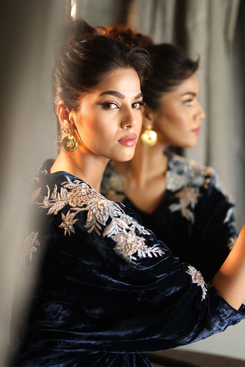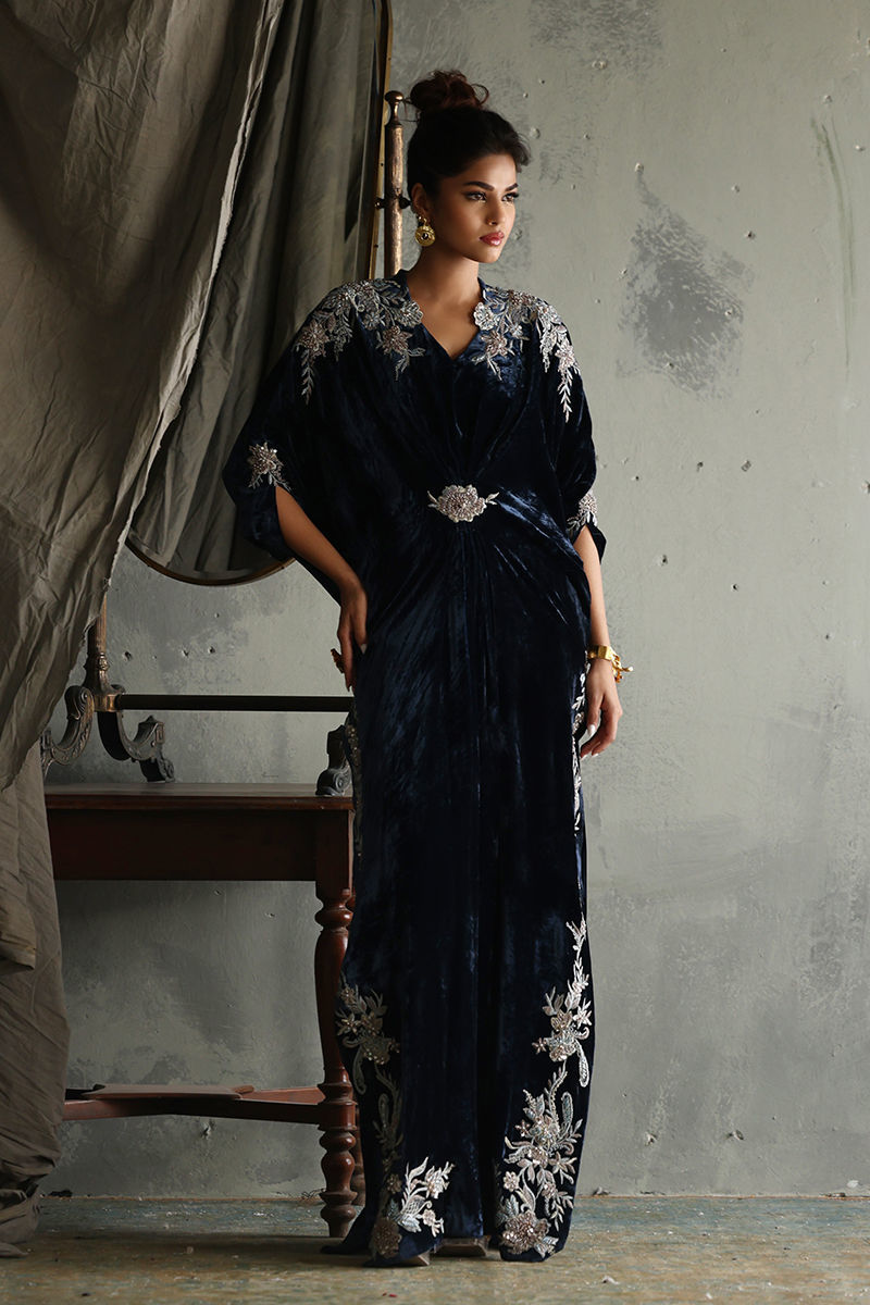 Discover the elegance of our Midnight Blue Pleated Kaftan, crafted from luxurious pure velvet for a rich and sophisticated feel. This stunning kaftan features a length of 58 inches, designed to create a graceful silhouette. The exquisite embellishments on the side slits, neckline, shoulders, and sleeves are intricately detailed with resham, zari, sequins, moti, cutdana, tikki stones, and pearls, adding a touch of opulence to the design. Perfect for special occasions or evening events, this pleated kaftan is a versatile and stylish addition to your wardrobe. Embrace the allure of timeless beauty with this captivating piece!