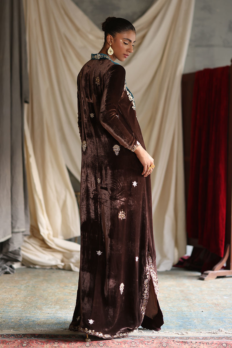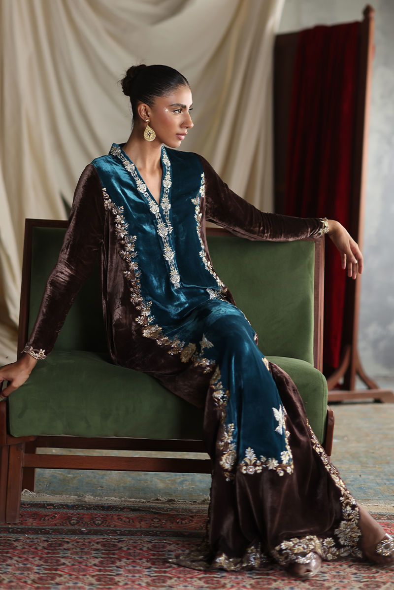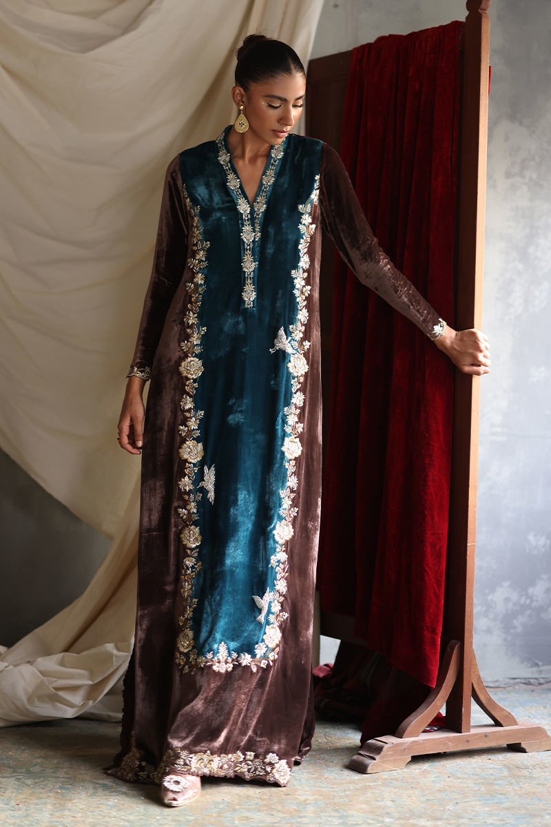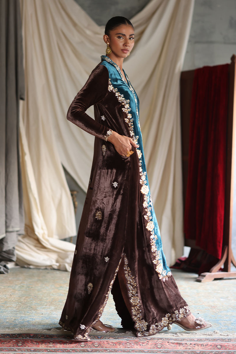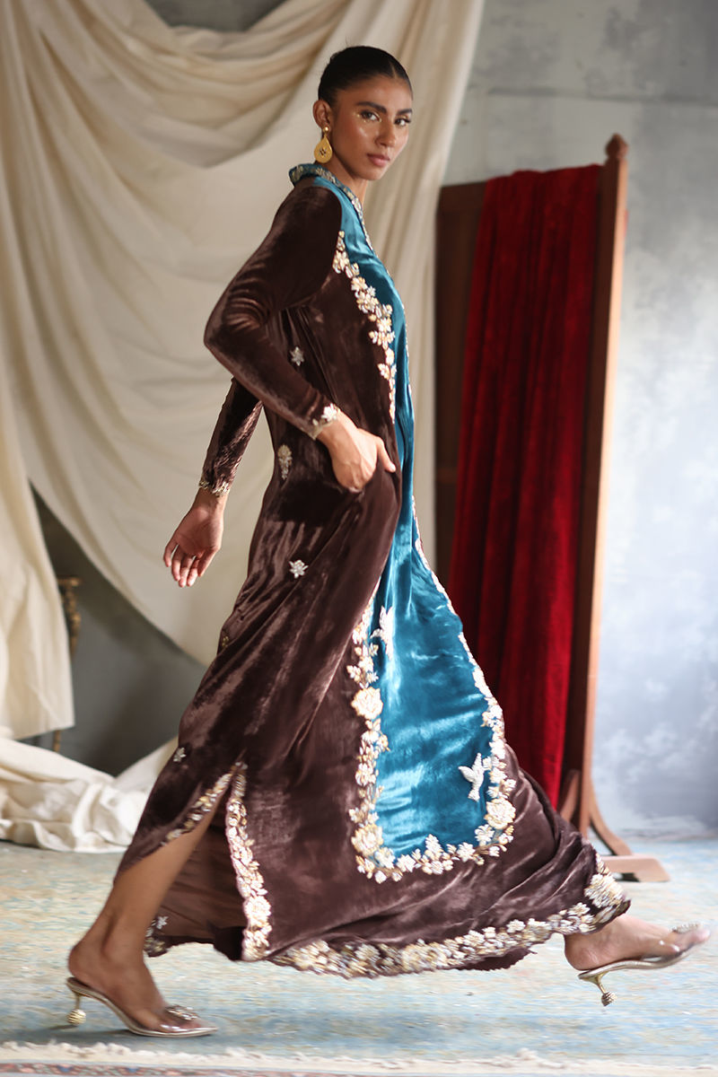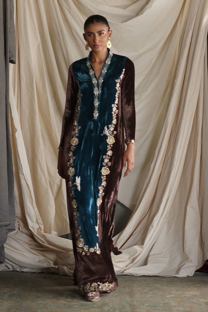 Introducing our stunning Colour Block Straight Kaftan, featuring a luxurious blend of peacock teal and dark taupe pure velvet. With a length of 58 inches, this kaftan offers a flattering silhouette that’s perfect for any occasion. The front, back, and sleeves are beautifully embroidered with intricate silver, gold, antique zari, and lorex zari, creating a captivating visual appeal. The front is further adorned with an array of handwork, including various types of stones, sequins, crystals, dabka, nakshi, and cutdana, adding layers of elegance and sophistication. Ideal for formal events or special gatherings, this kaftan is a versatile addition to your wardrobe that radiates style and grace. Embrace the artistry and luxury of this exquisite piece!
