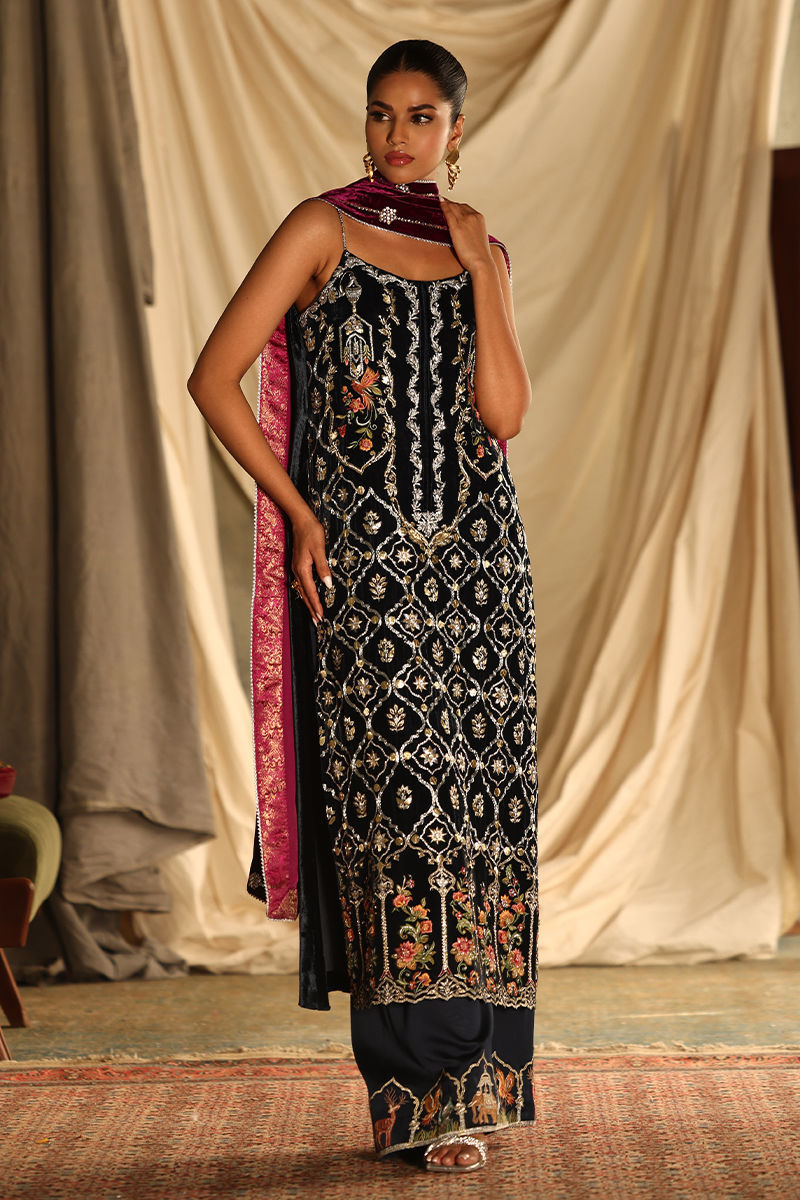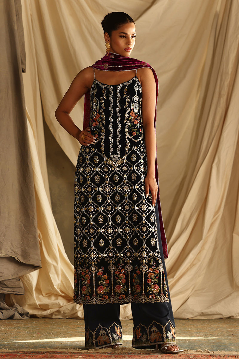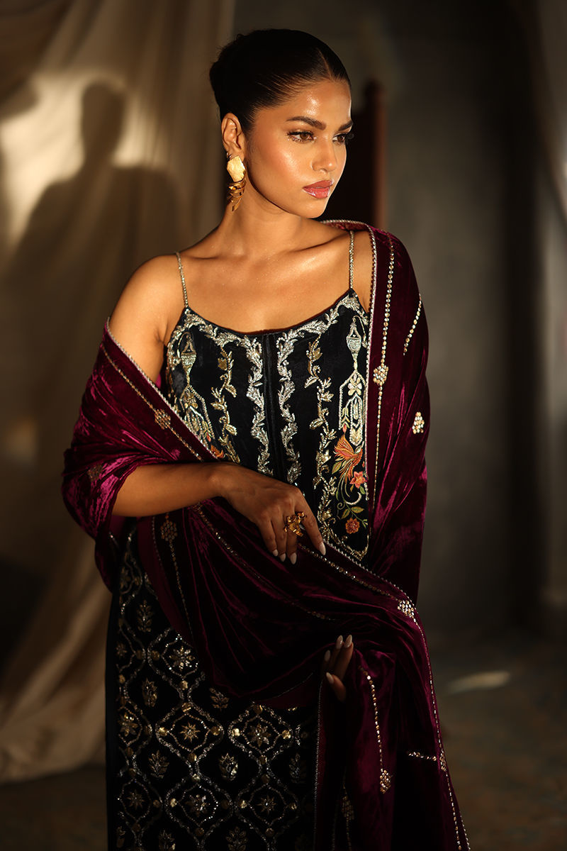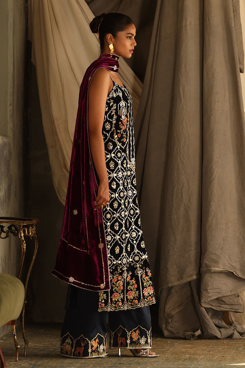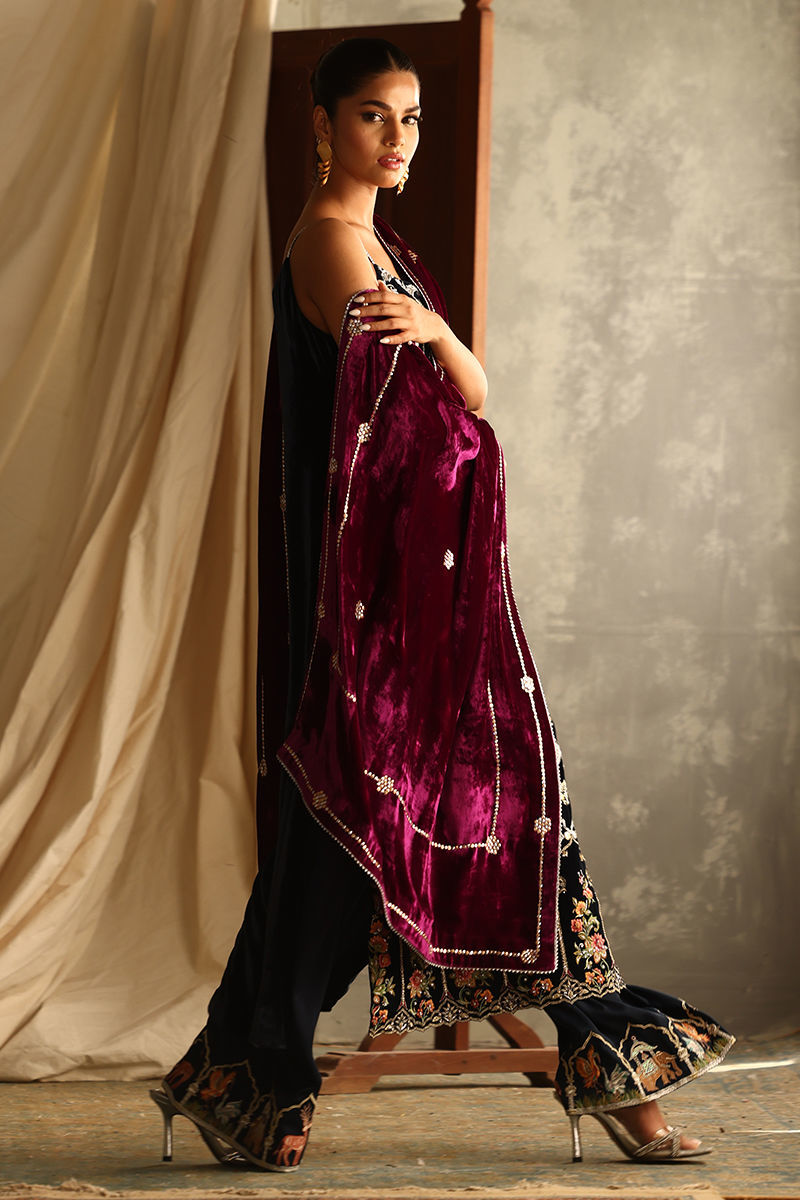 This luxurious midnight blue ensemble combines elegance with meticulous craftsmanship. The straight, long shirt, is crafted from pure velvet and adorned with intricate handwork featuring zardozi, kora, dabka, nakshi, cutdana, tikki stones, sequins, pearls, crystals, Resham threads, gota, and stones. Measuring 50 inches, it offers a regal silhouette with the option of adding style sleeves. Paired with 42-inch textured silk culottes, enriched with Resham embroidery, the outfit exudes subtle sophistication. A rich velvet shawl, embellished with handwork and bordered with four-sided lace and luxurious Banarsi detailing, completes the look with opulence.