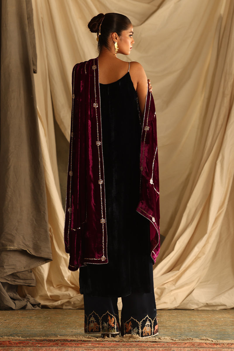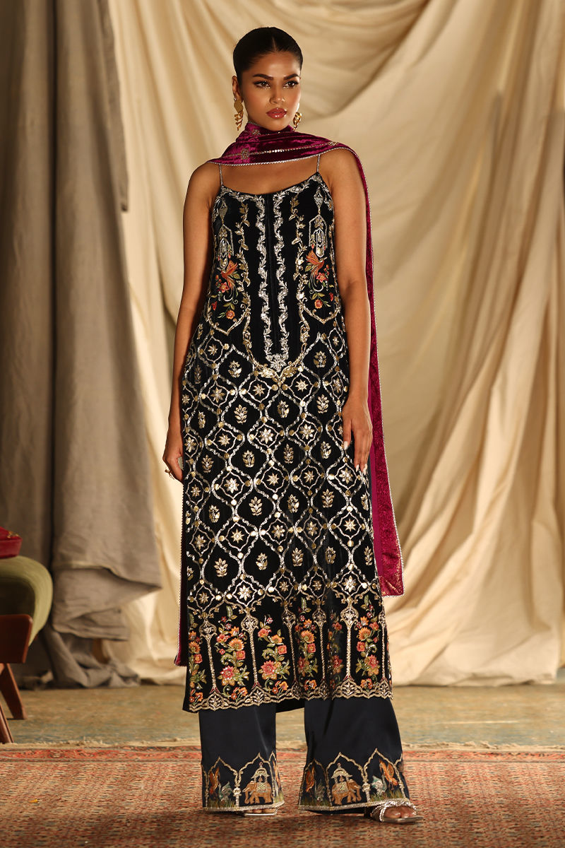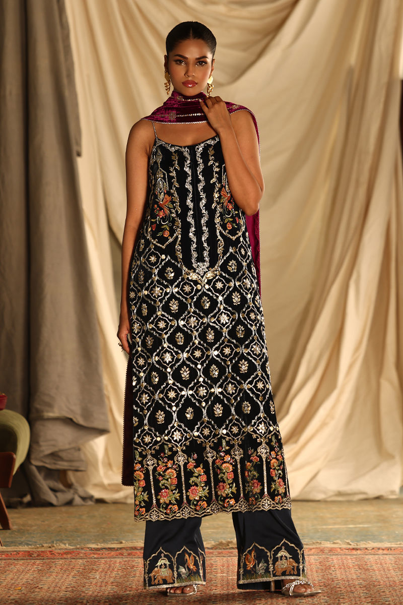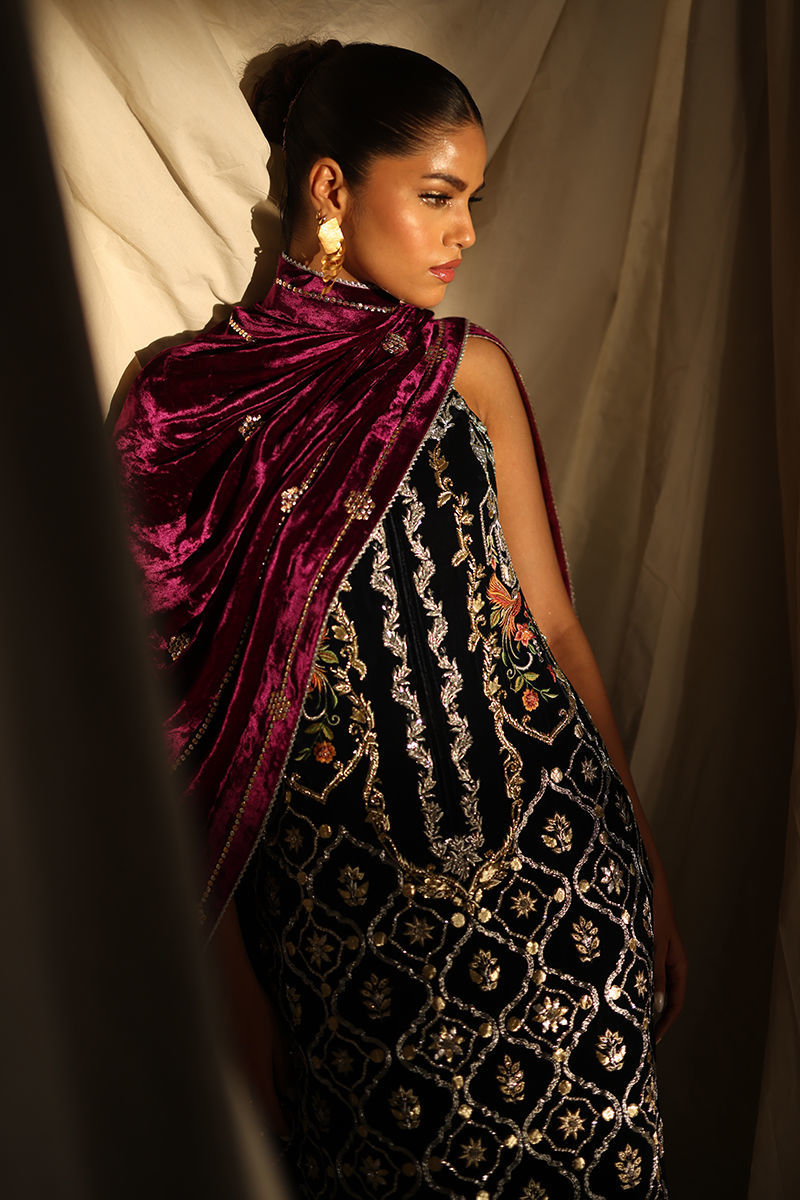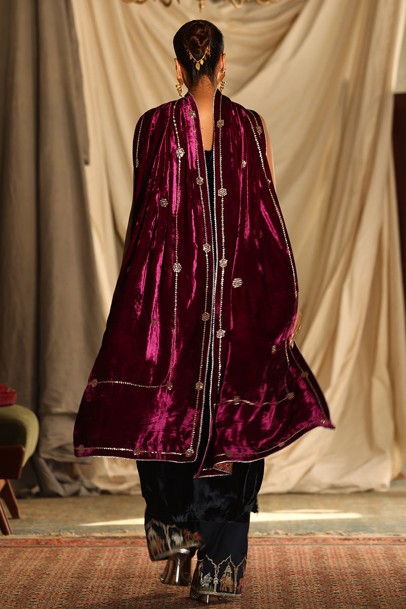 This luxurious midnight blue ensemble combines elegance with meticulous craftsmanship. The straight, long shirt, is crafted from pure velvet and adorned with intricate handwork featuring zardozi, kora, dabka, nakshi, cutdana, tikki stones, sequins, pearls, crystals, Resham threads, gota, and stones. Measuring 50 inches, it offers a regal silhouette with the option of adding style sleeves. Paired with 42-inch textured silk culottes, enriched with Resham embroidery, the outfit exudes subtle sophistication. A rich velvet shawl, embellished with handwork and bordered with four-sided lace and luxurious Banarsi detailing, completes the look with opulence.