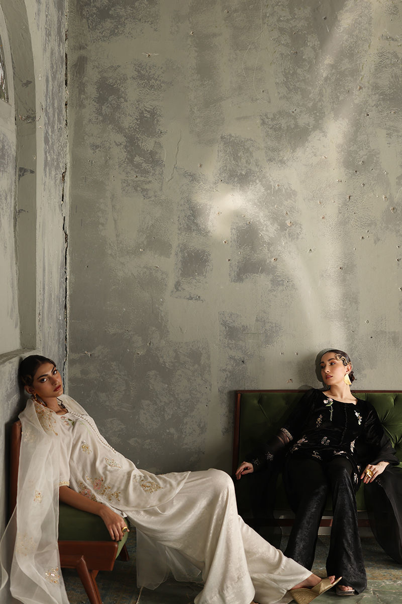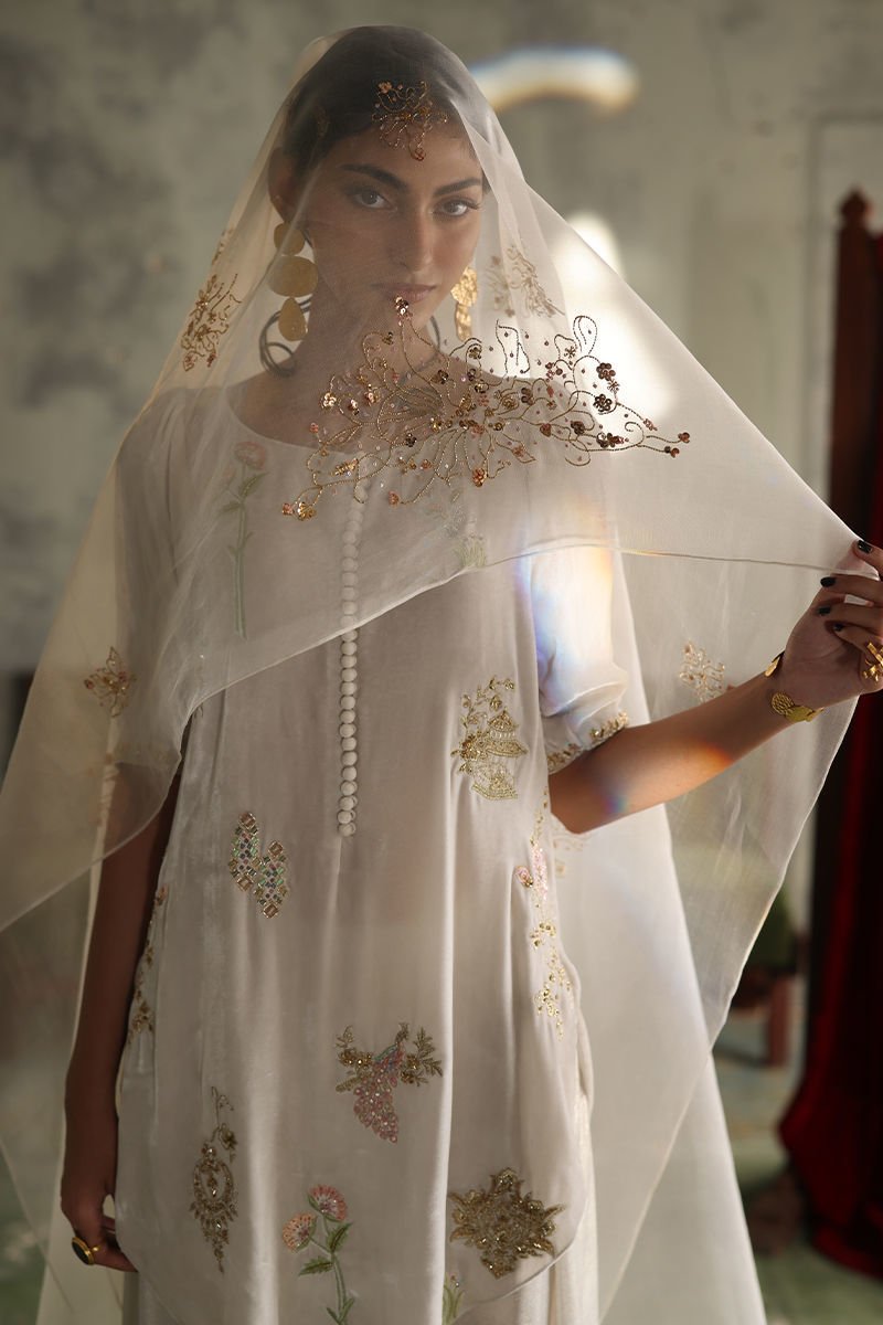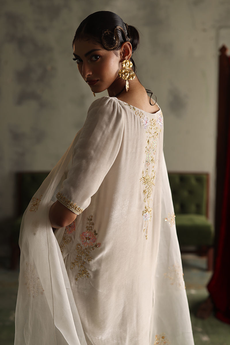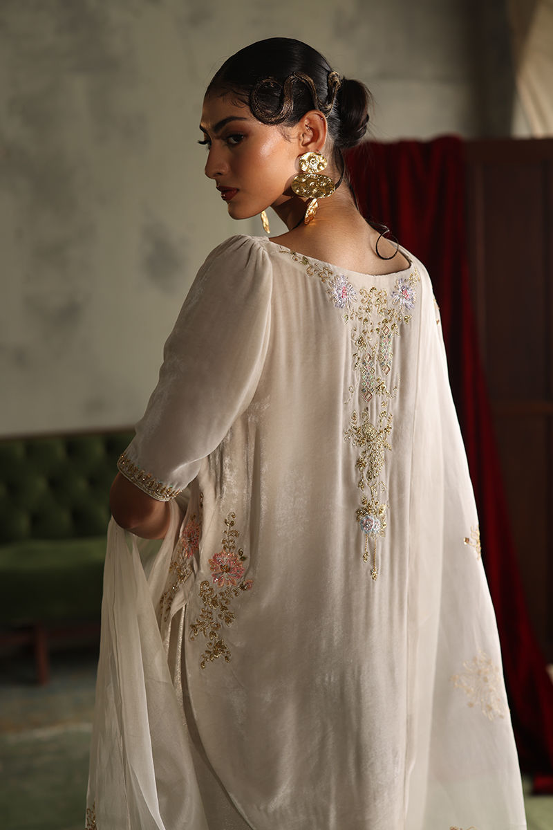 Color: Winter White Fabric: Pure Velvet Work Details: Embroidered and Embellished