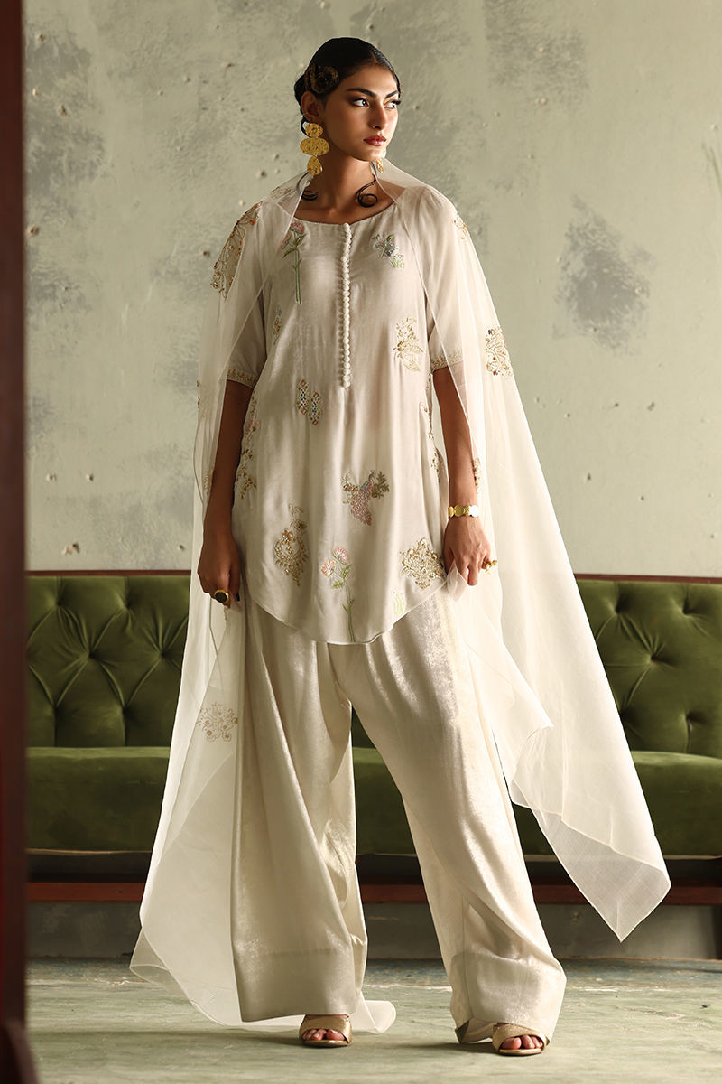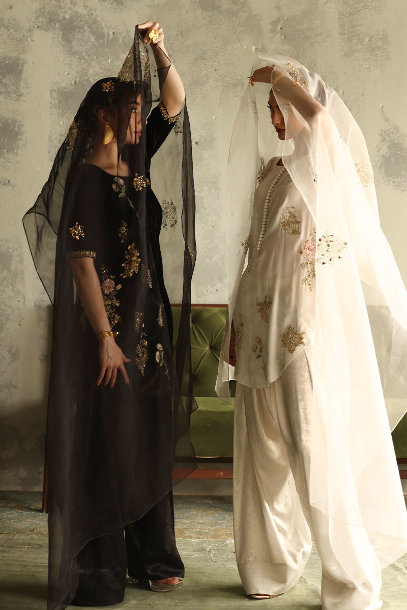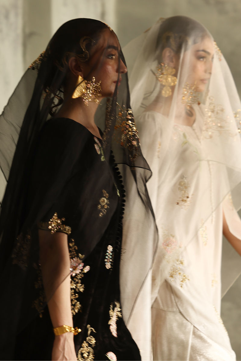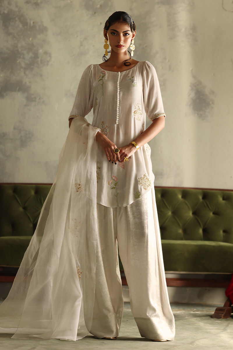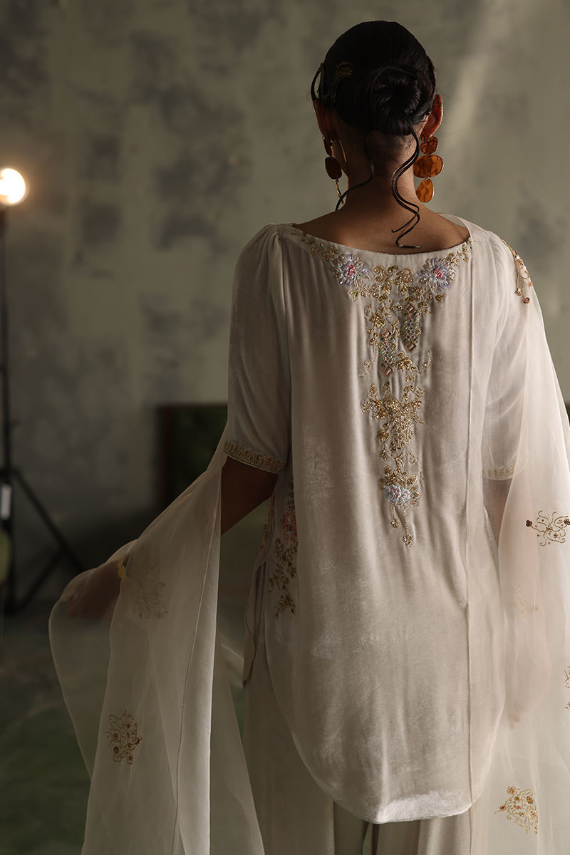 Color: Winter White Fabric: Pure Velvet Work Details: Embroidered and Embellished