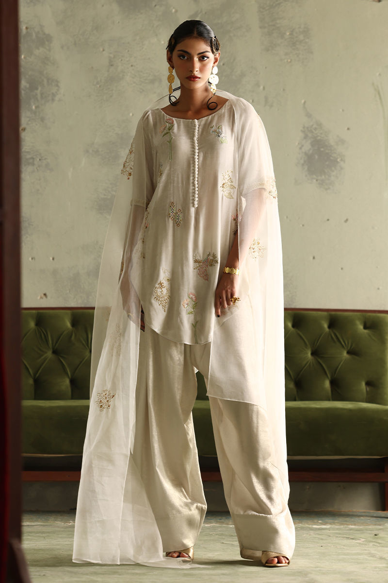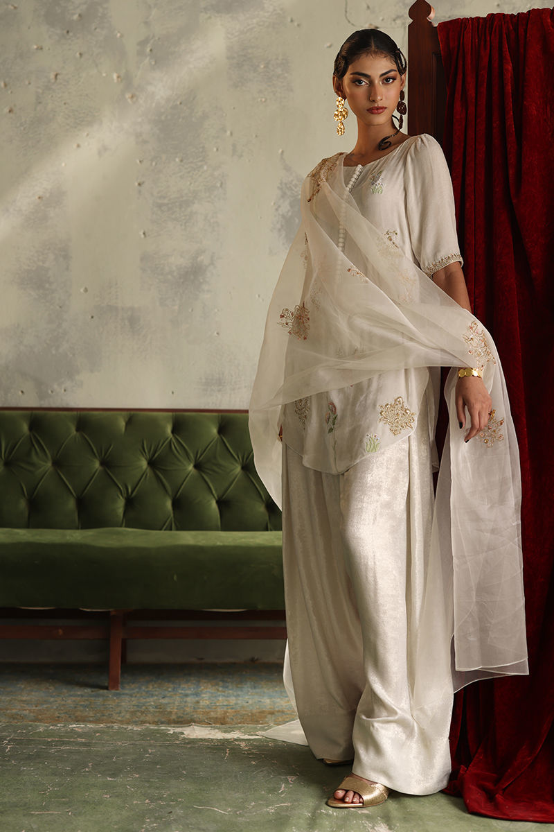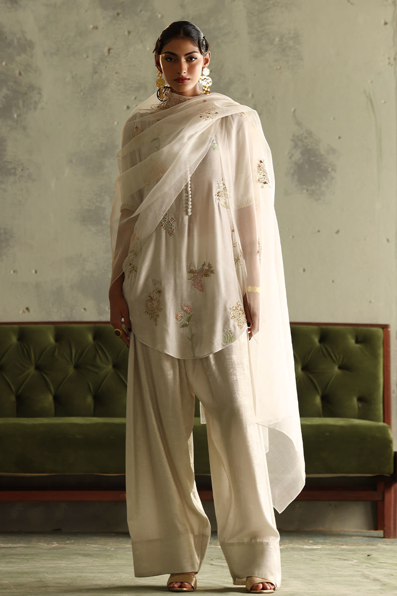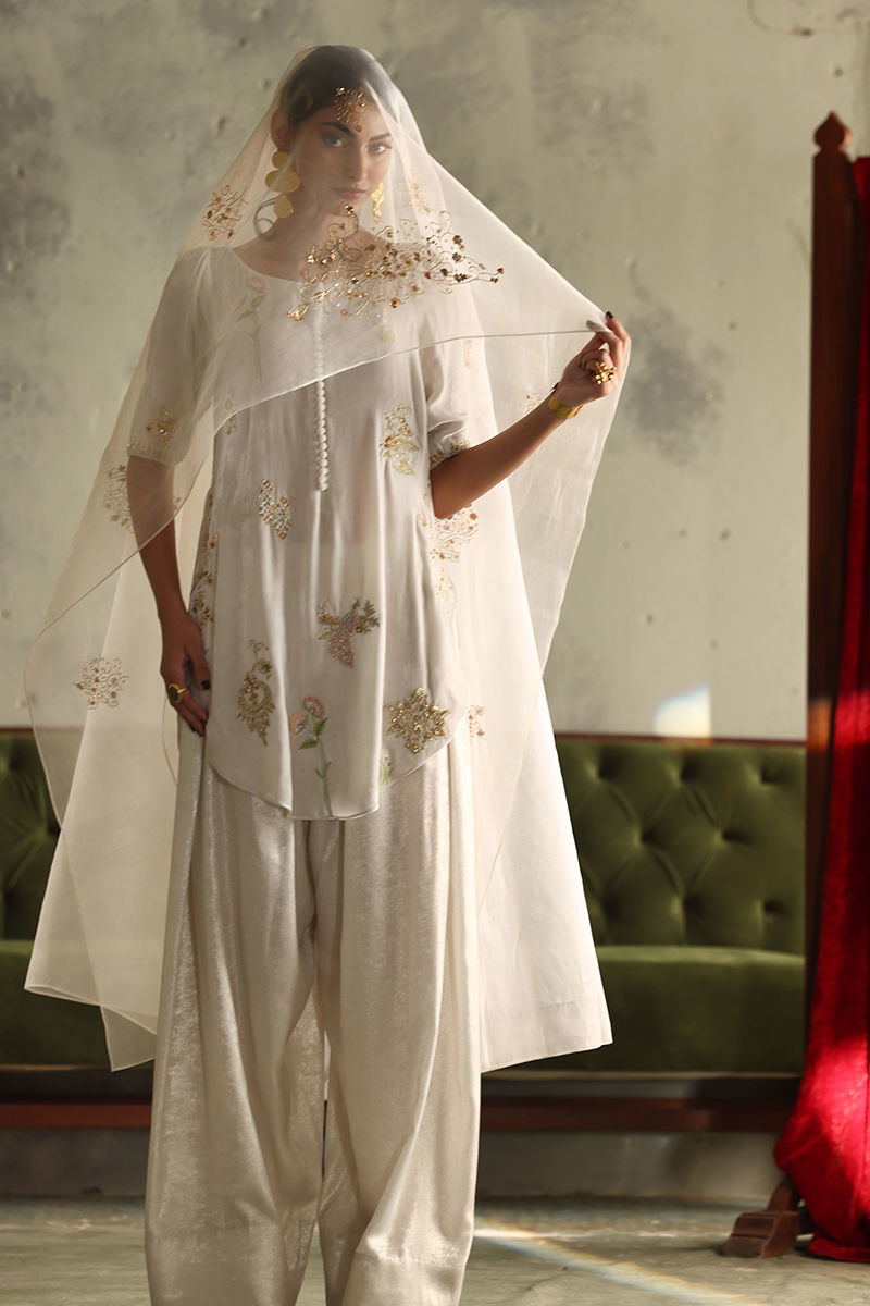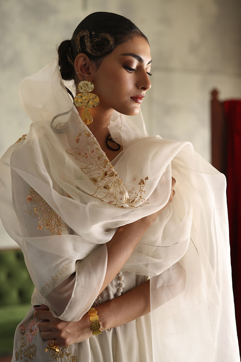 This stunning winter white ensemble radiates elegance and sophistication. The short shirt, is crafted from pure velvet with a 33-inch length, featuring intricate zari bunches accented with colored Resham, zardozi, sequins, cutdana, tikki stones, and naqshi for a luxurious textured finish. Paired with a 42-inch shimmer crepe shalwar, the outfit combines traditional charm with a hint of modernity. A pure organza dupatta, embellished with delicate handwork, completes the look, adding a soft, graceful layer to this timeless winter white set.