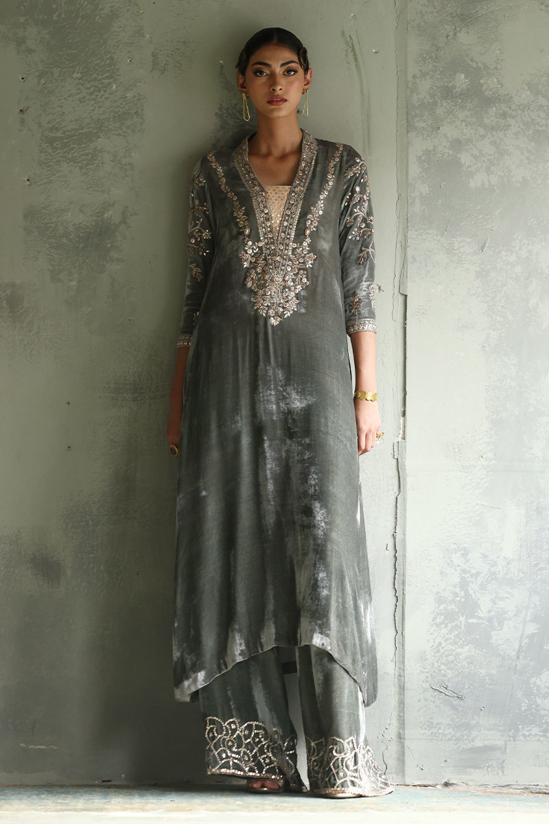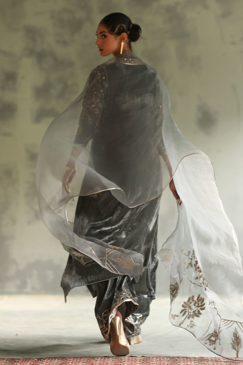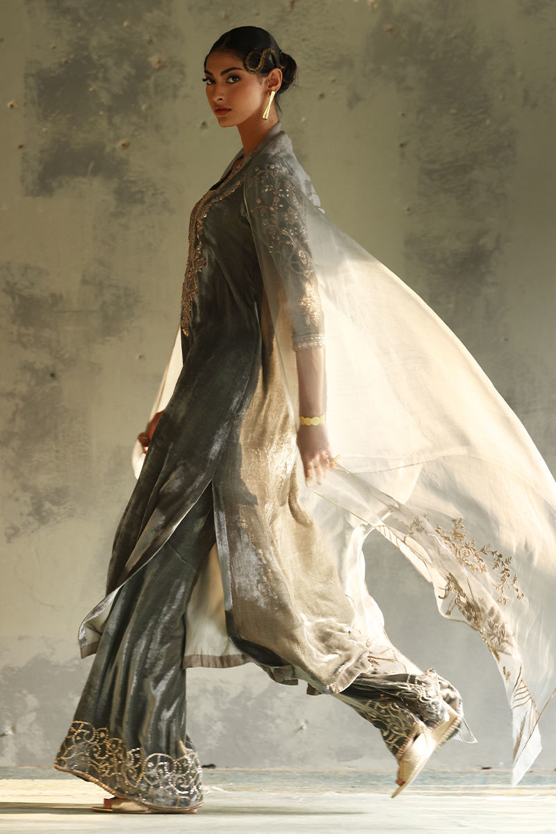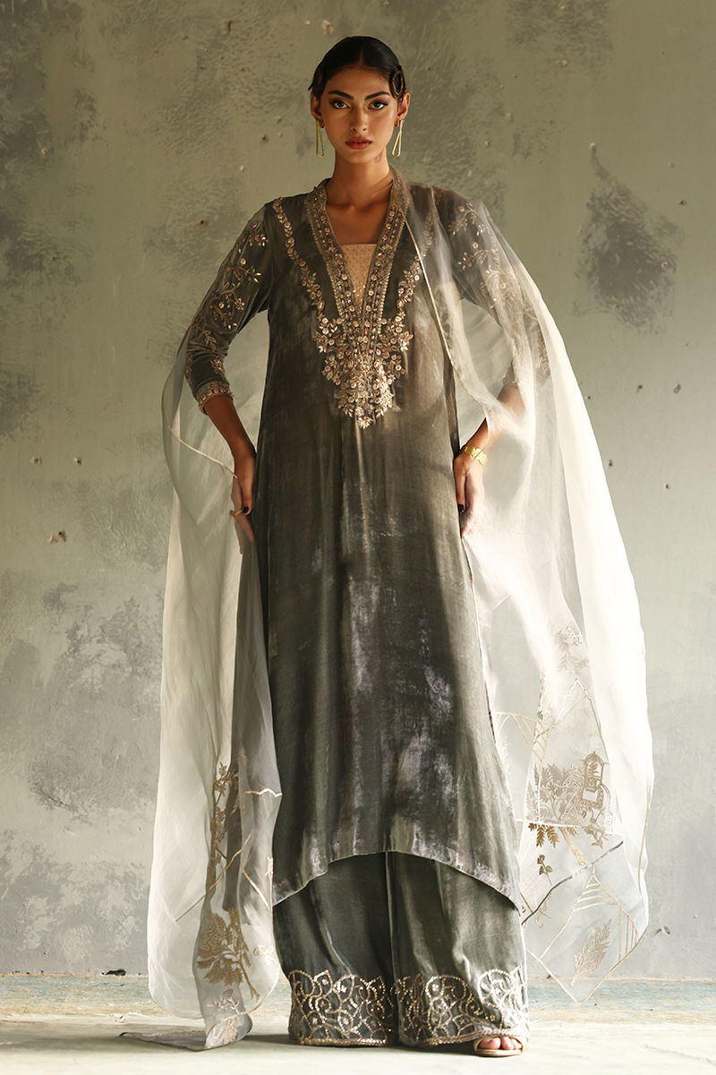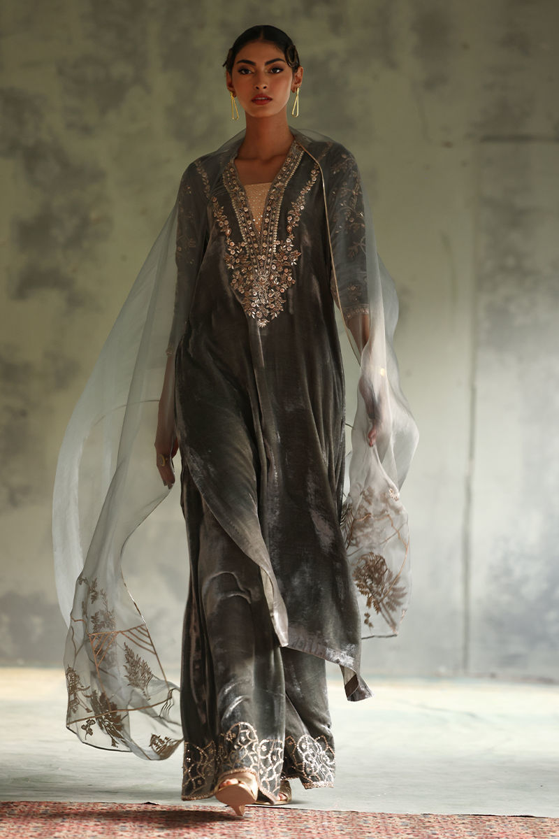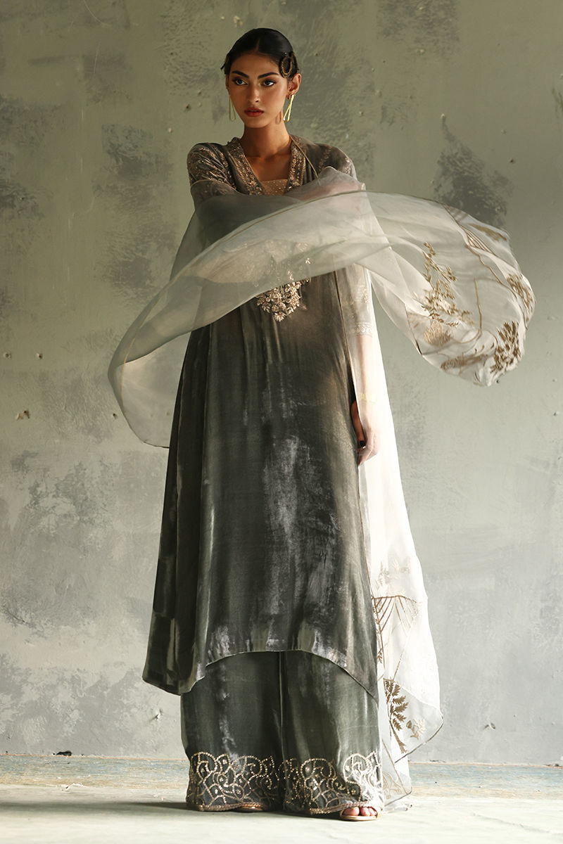 This sophisticated granite green ensemble combines elegance with luxurious craftsmanship. The A-line shirt, is made from pure velvet and flows gracefully at a 50-inch length. It features intricate zari embroidery on the neck and sleeves, highlighted by handwork details of gota, dabka, sequins, tikki stones, and naqshi, adding texture and opulence. The 42-inch velvet culottes are embellished with hand-sequined detailing at the hem, enhancing the ensemble's refined appeal. A pure organza dupatta, adorned with zari embroidery, completes the look, adding a light, ethereal touch to this beautiful set.
