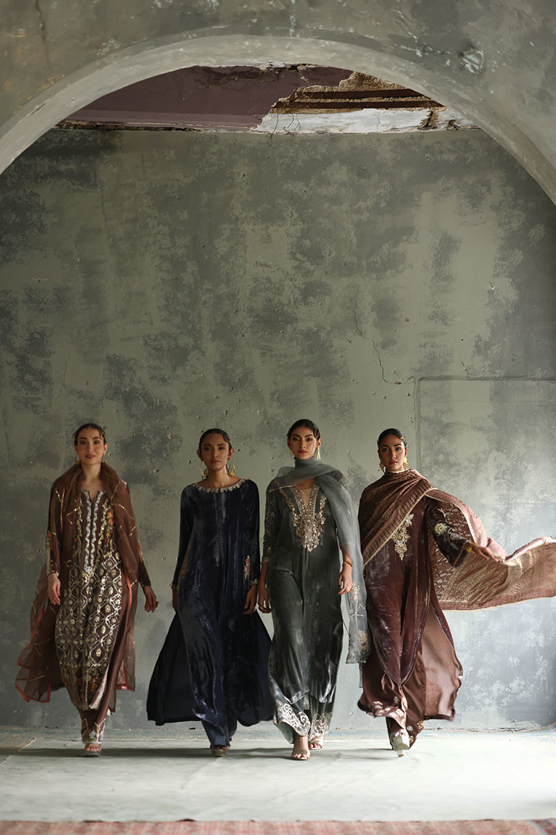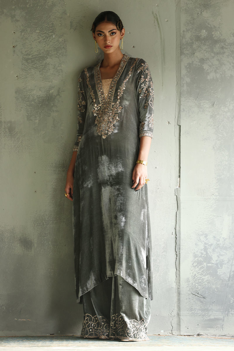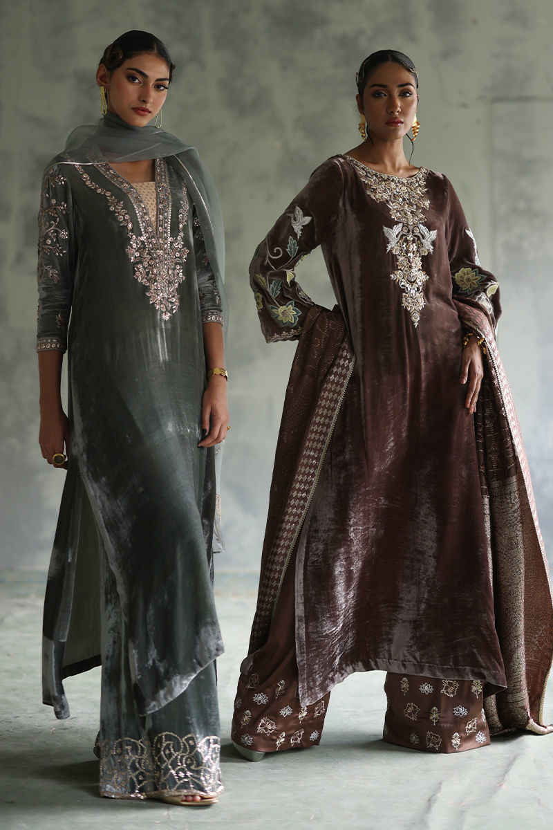 Color: Granite Green Fabric: Pure Velvet Work Details: Embroidered and Embellished