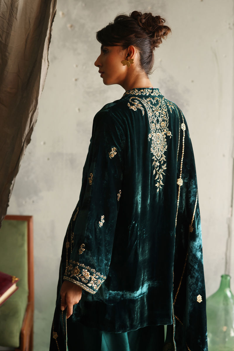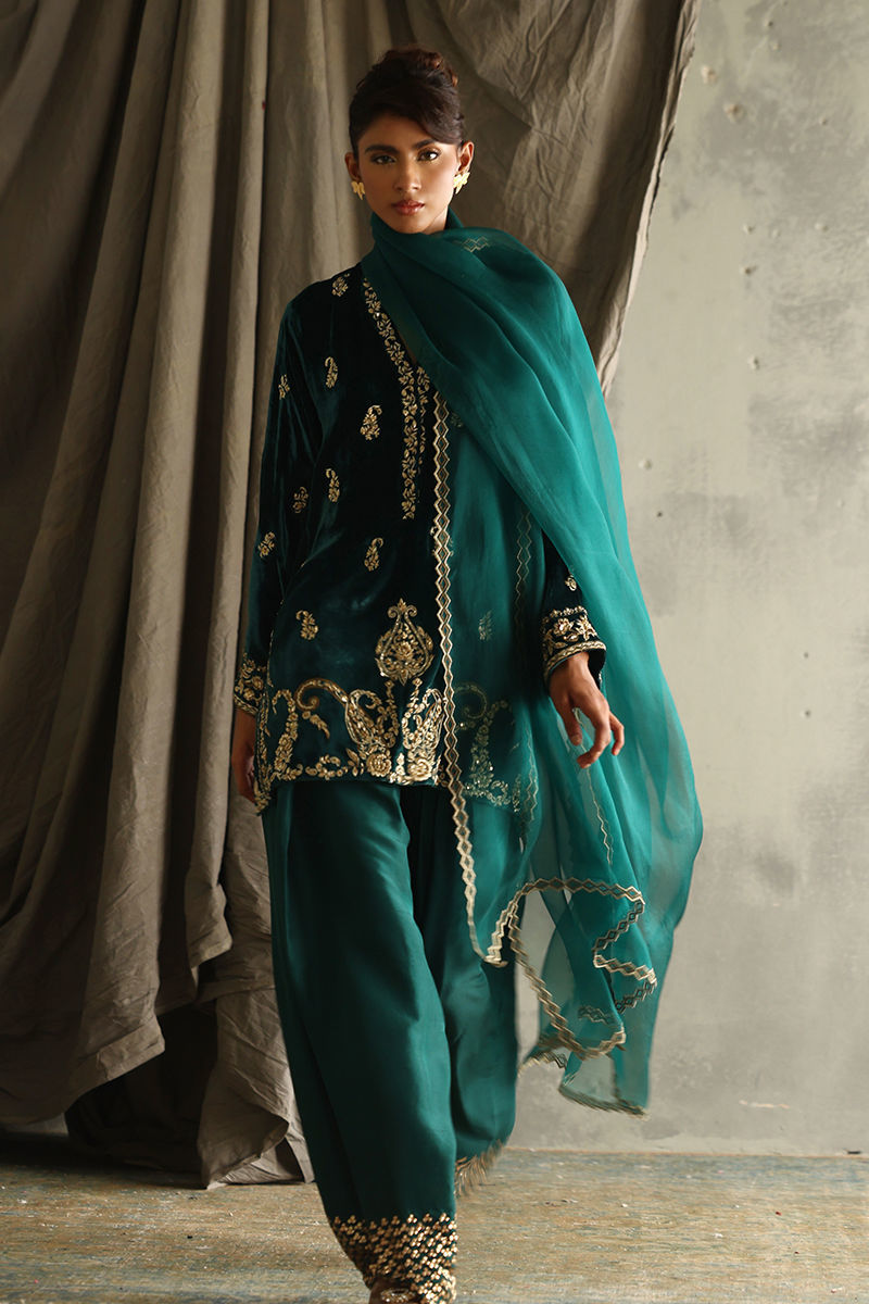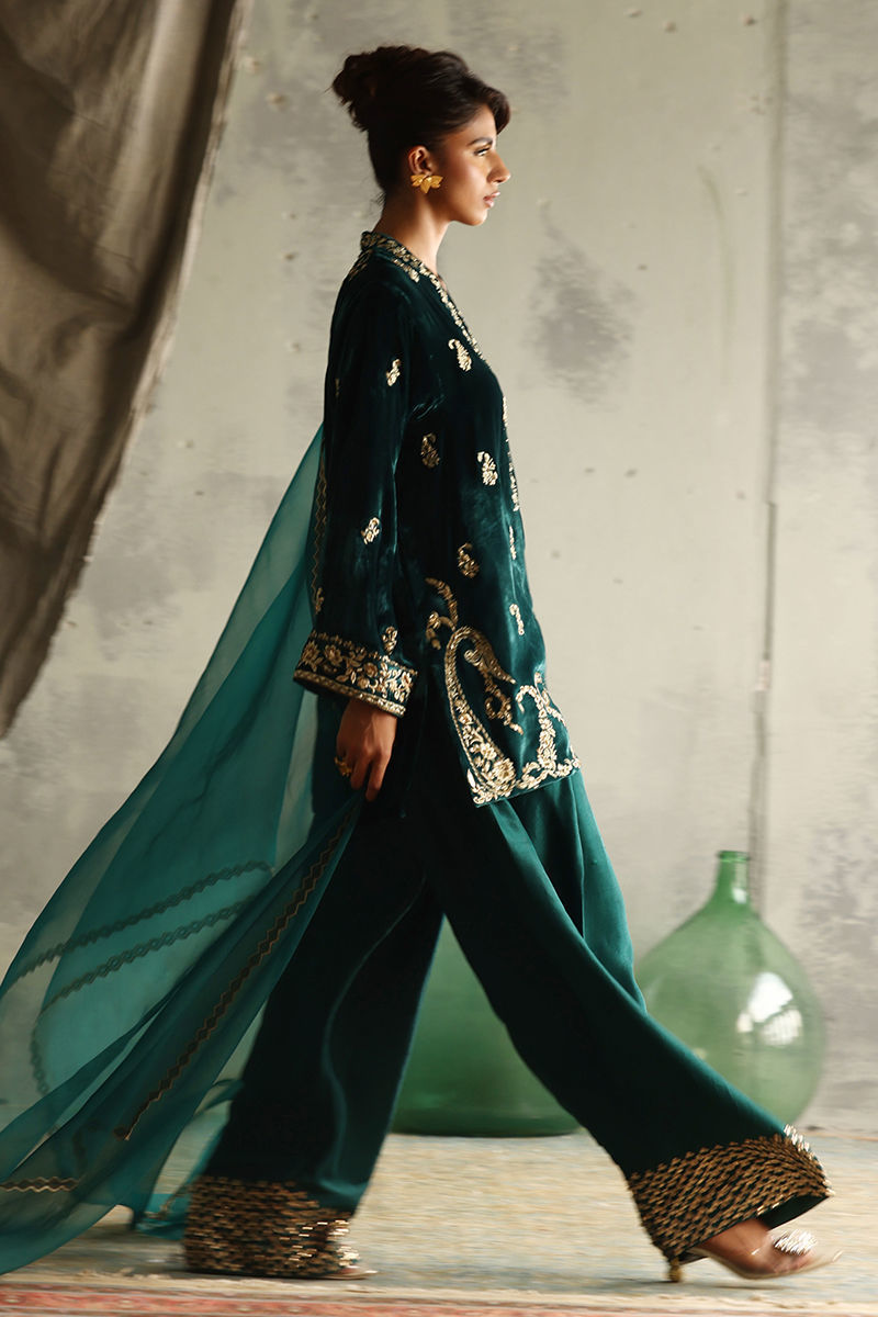 This stunning pine needle ensemble exudes timeless elegance and intricate craftsmanship. The short kurta, is crafted from pure velvet with a 33-inch length, featuring gold and antique zari embroidery across the front, back, and sleeves, complemented by exquisite handwork of kora, dabka, sequins, tikki stones, and naqshi. Paired with a 42-inch pure raw silk shalwar, the bottoms are adorned with hand-sequined embellishments at the hem, adding a sophisticated touch. The ensemble is completed with a pure organza dupatta, featuring four-sided zari scallop embroidery, and a pure velvet shawl, hand-embellished with sequins and finished with lace and Banarsi detailing for a truly luxurious finish.