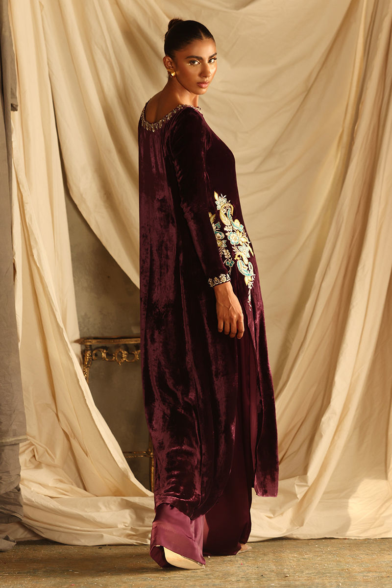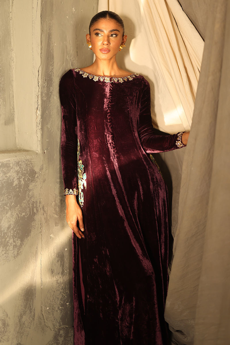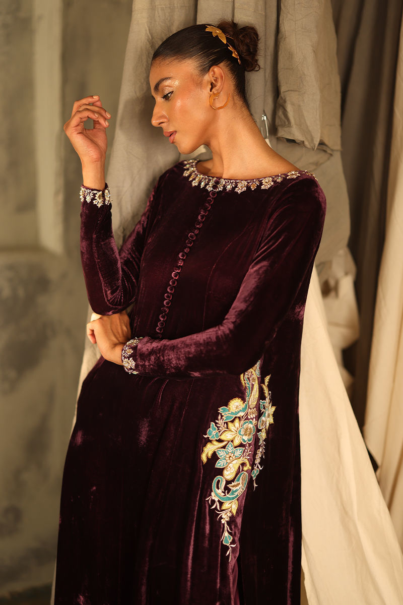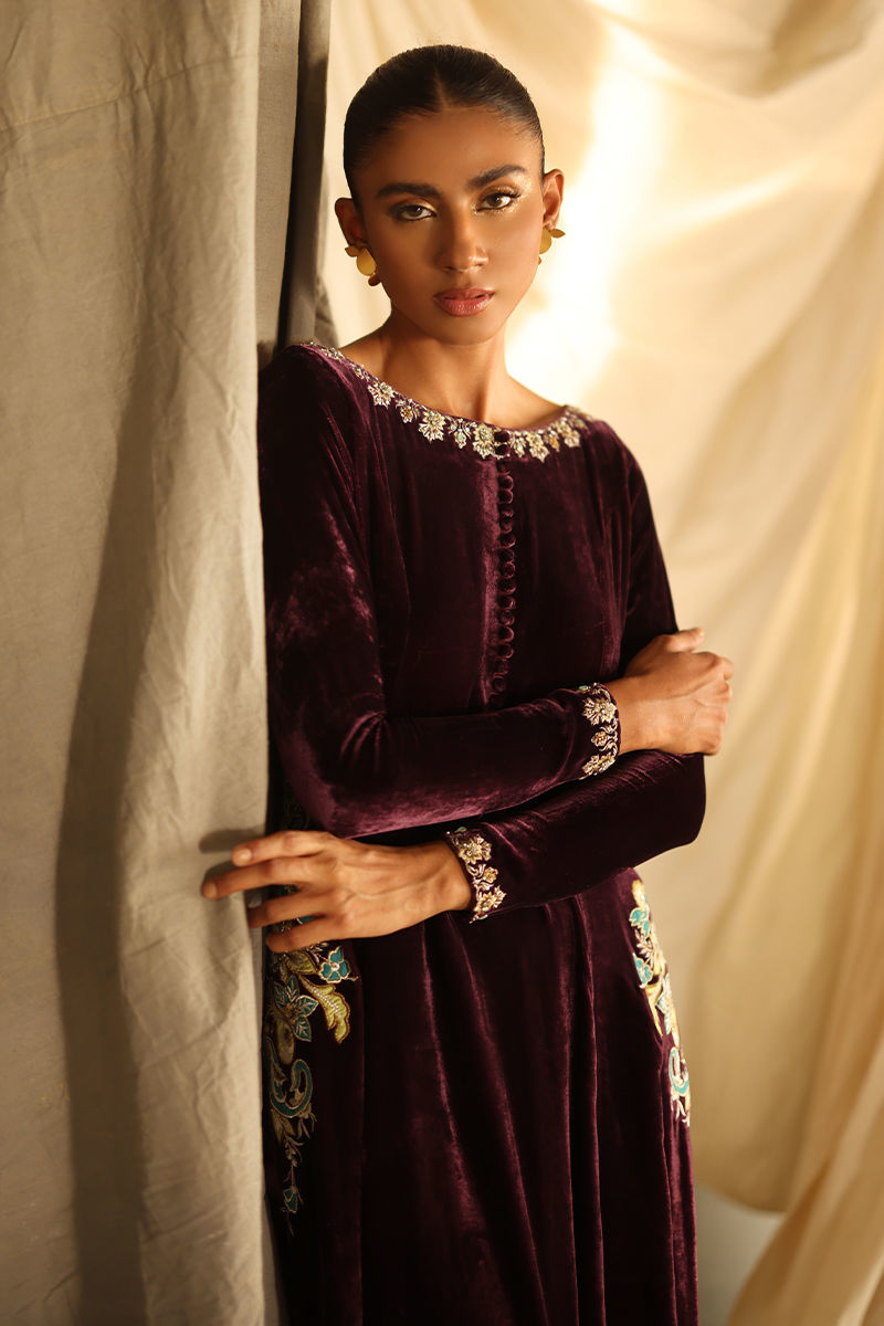 Color: Italian Plum Fabric: Pure Velvet Work Details: Embroidered and Embellished