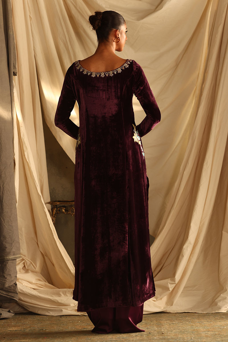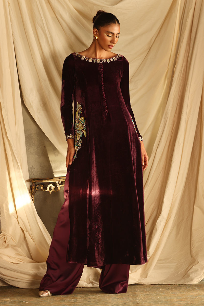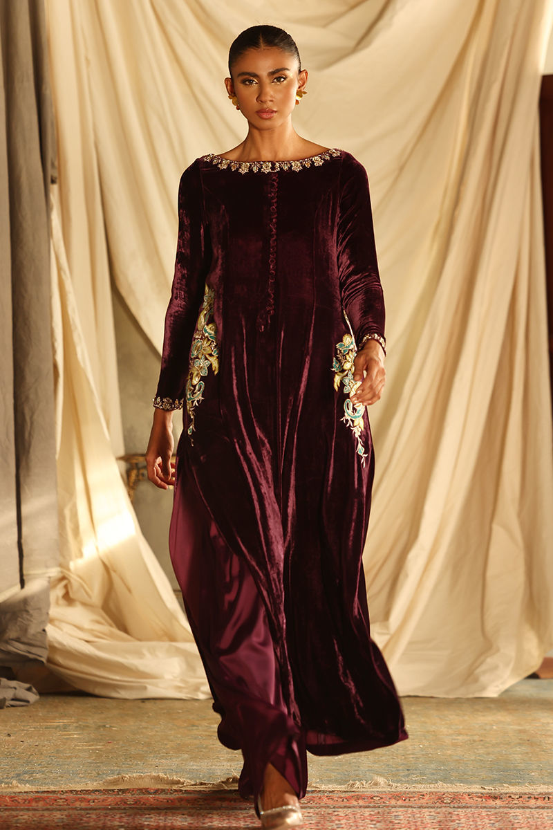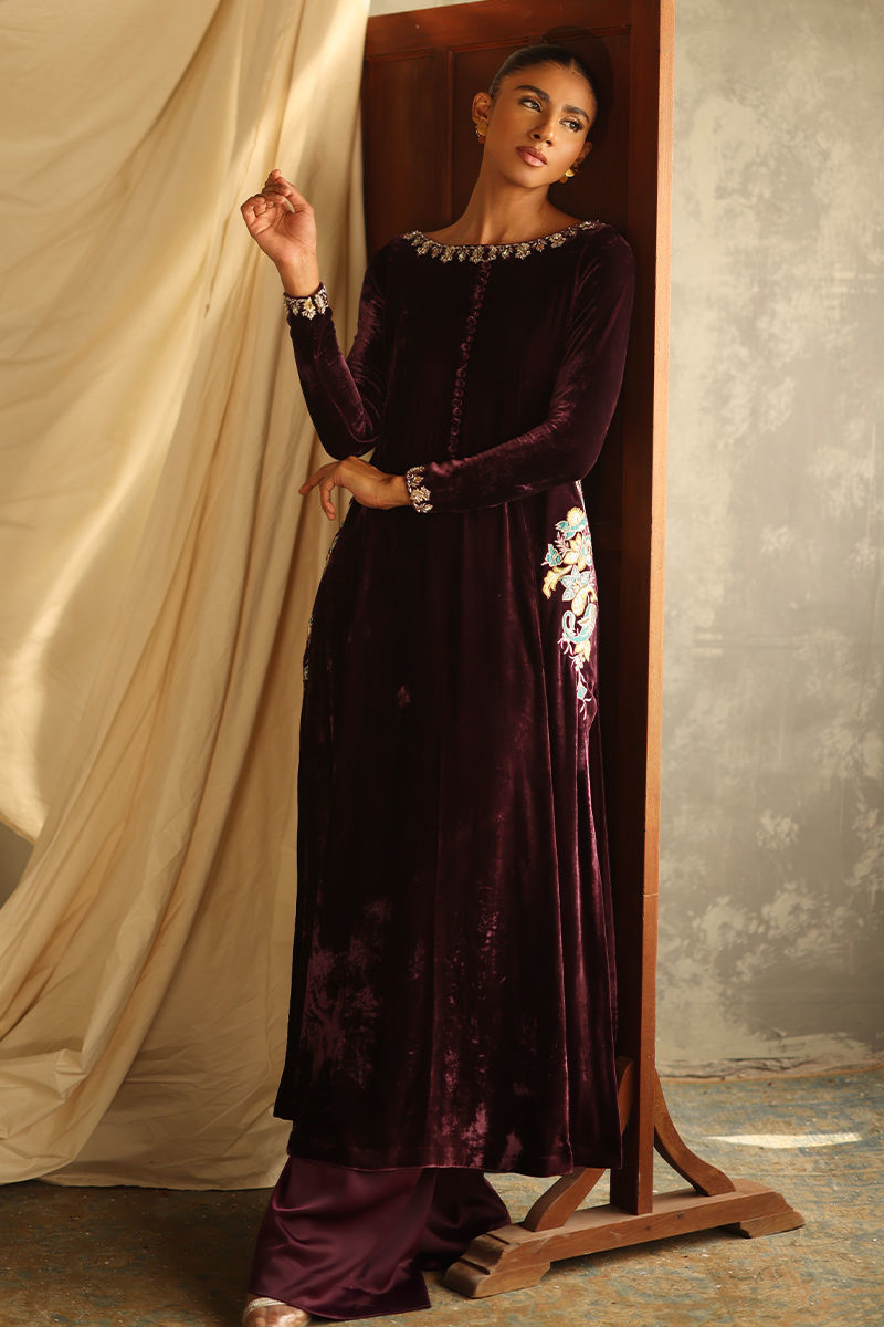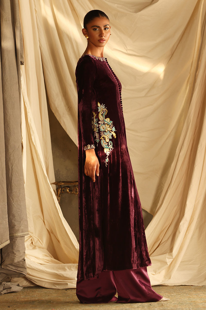 Color: Italian Plum Fabric: Pure Velvet Work Details: Embroidered and Embellished