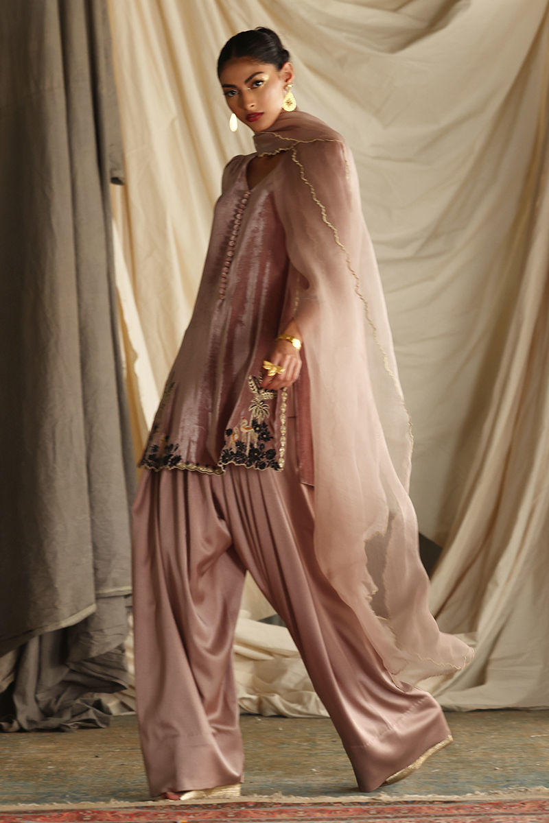 This elegant twilight mauve short shirt is a perfect combination of subtle luxury and intricate detailing. Made from pure velvet, the 33-inch shirt features gold and black zari embroidery on the daman and sleeves, creating a rich, textured look. Paired with a 42-inch shimmer crepe shalwar, the outfit exudes sophistication and grace. The look is completed with a pure organza dupatta, beautifully adorned with four-sided zari scallop embroidery, adding a light, delicate touch to this stunning ensemble.