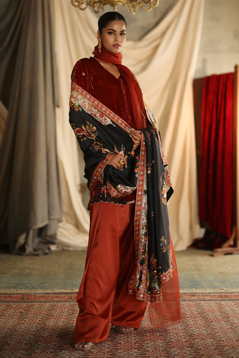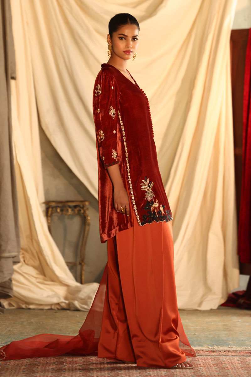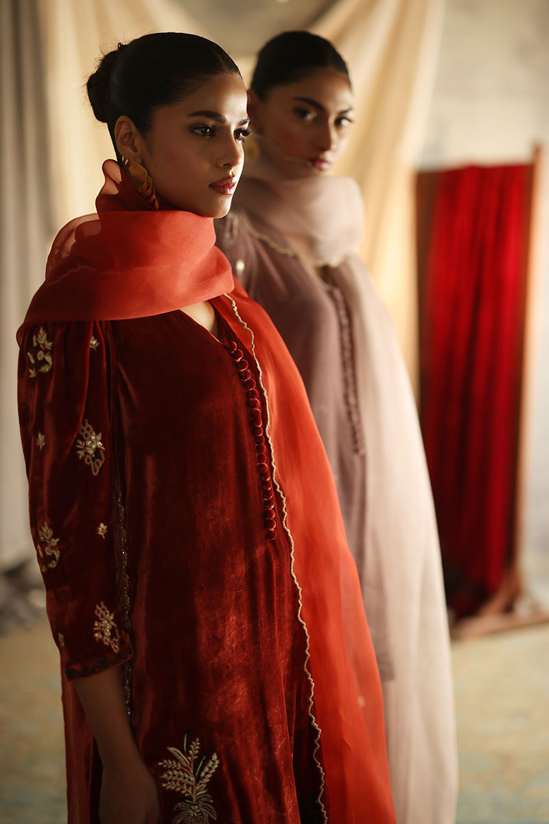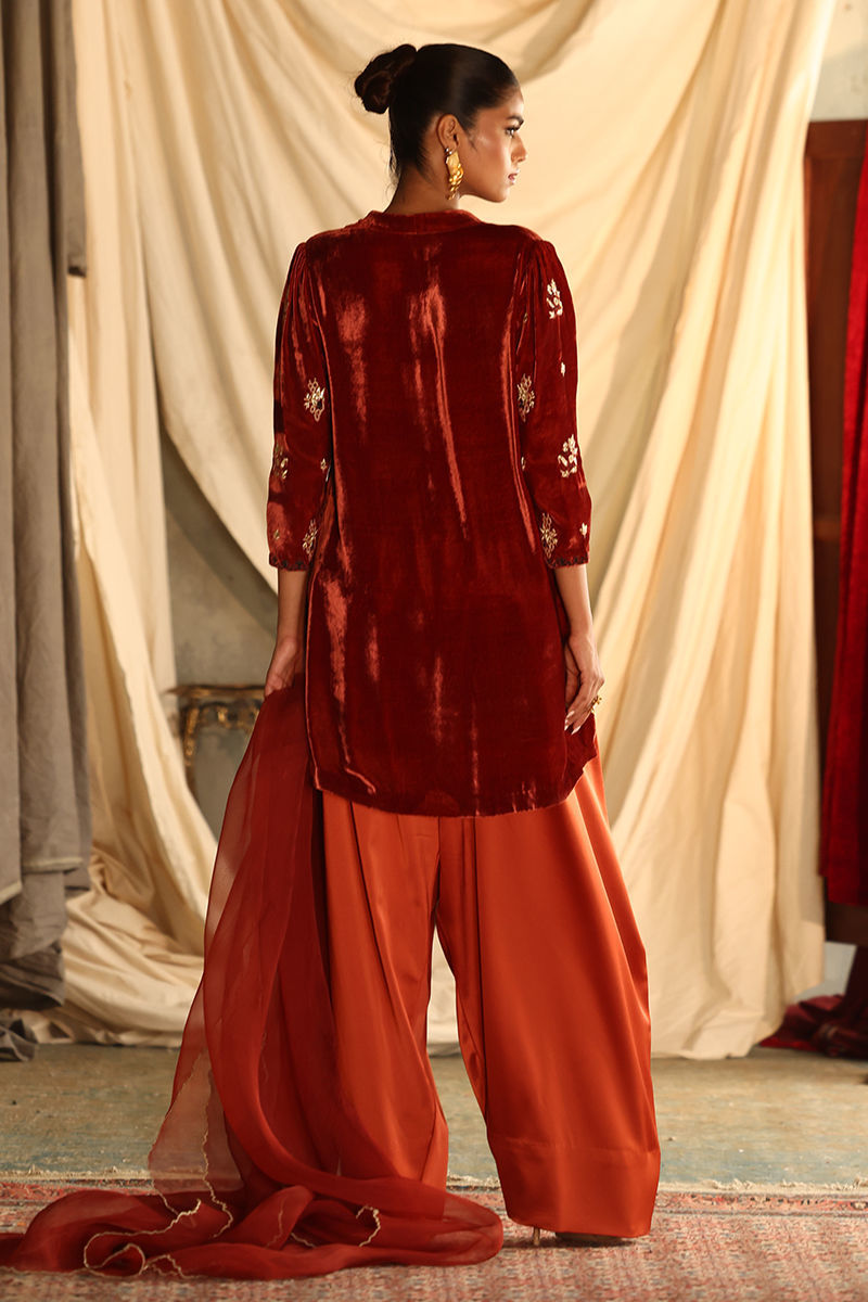 Color: Burnt Rust Fabric: Pure Velvet Work Details: Embroidered and Embellished