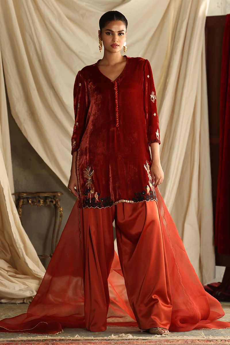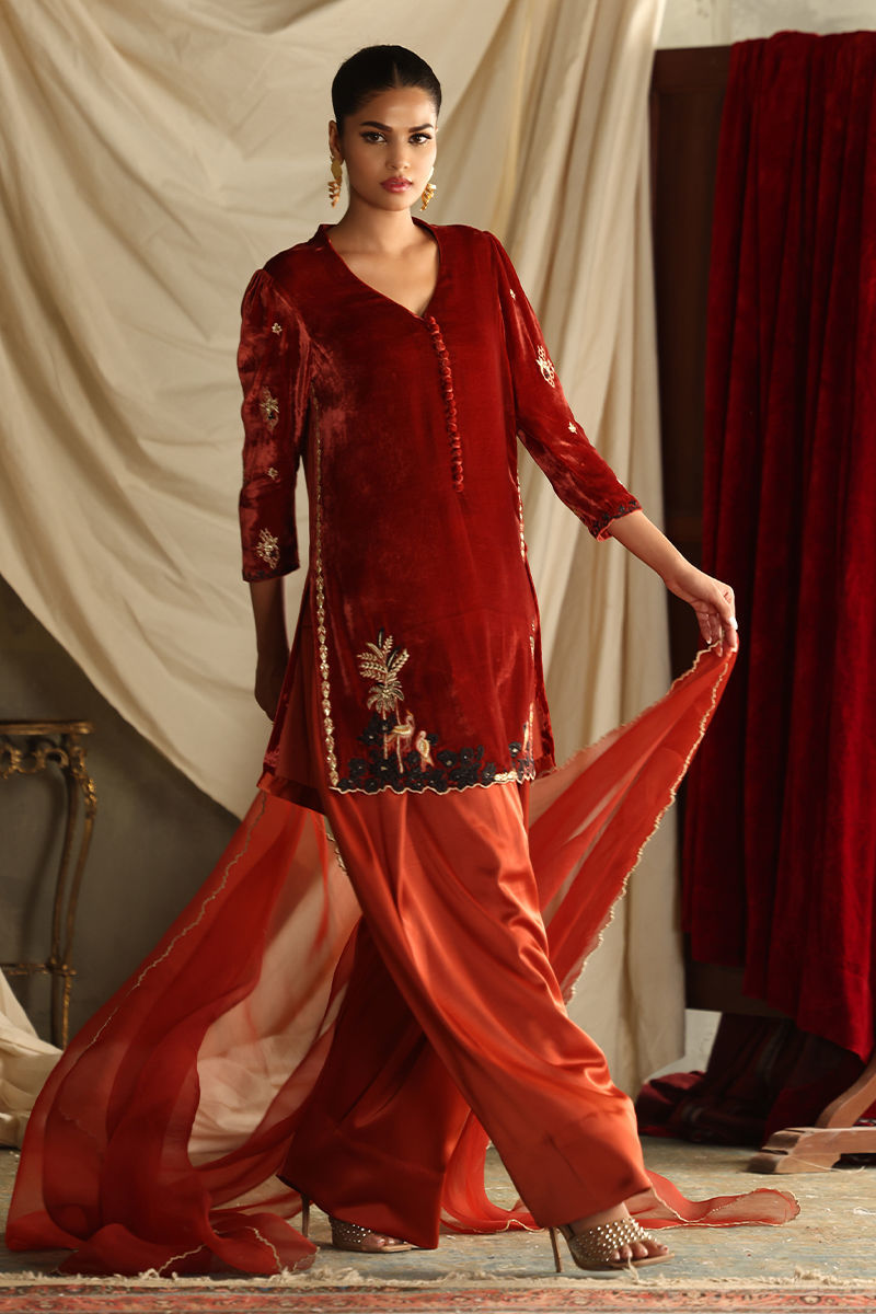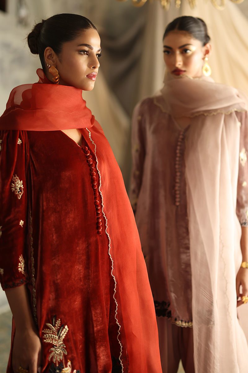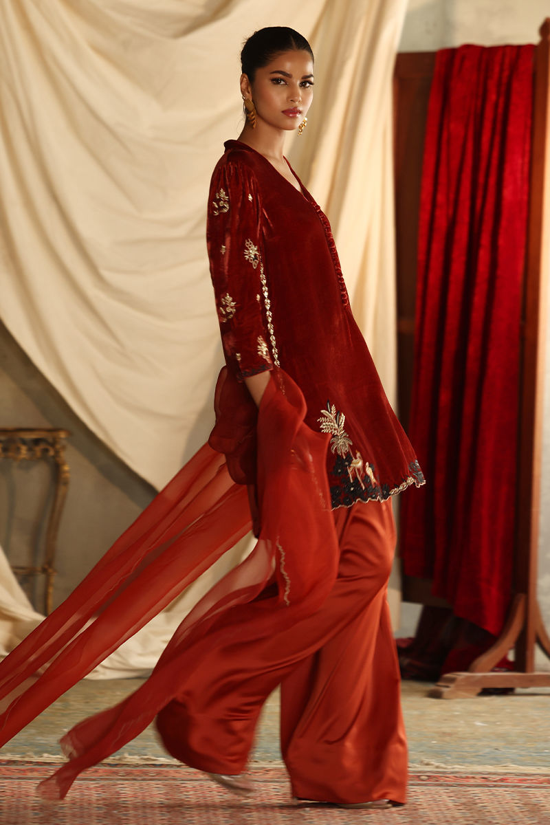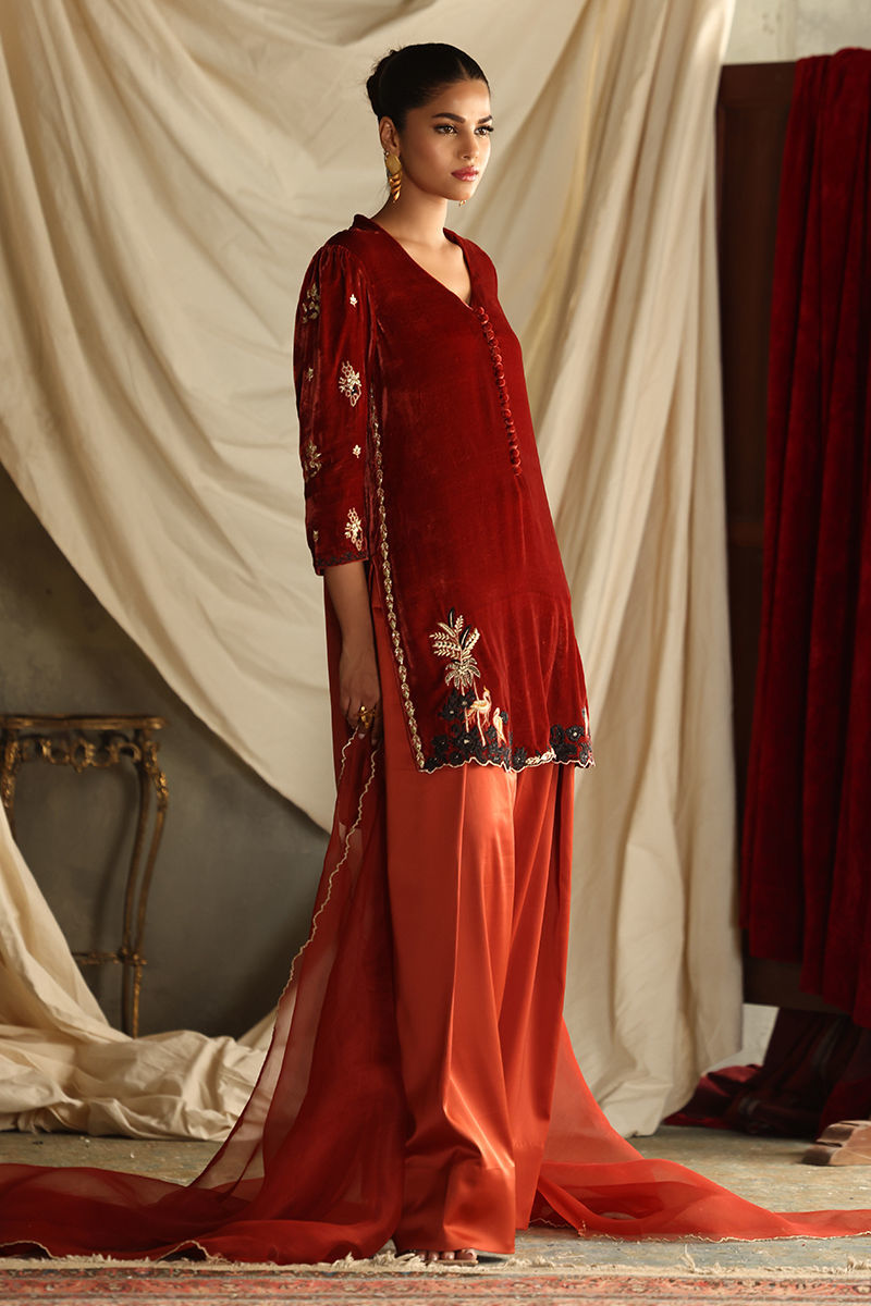 Color: Burnt Rust Fabric: Pure Velvet Work Details: Embroidered and Embellished