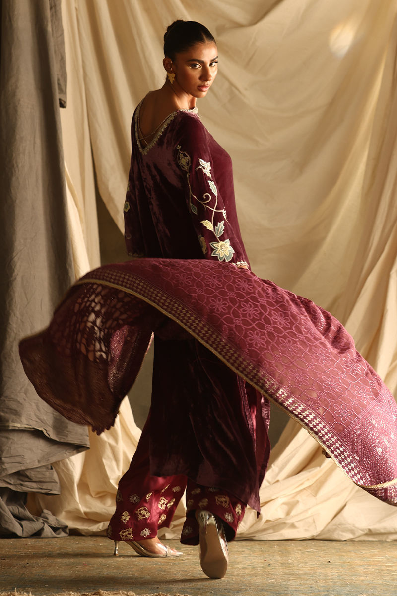 This elegant dusty T-pink slight A-line shirt, is crafted from pure velvet with a 50-inch length and features exquisite front neck embroidery in silver, gold, and rose gold zari, accented with tikki stones, kora, dapka, moti, nakshi, sequins, cutdana, and gota for a rich, detailed design. The back neck showcases similar handwork, while the sleeves are adorned with colored sheesha silk appliqué and gold, silver, and rose gold zari embroidery. Paired with satin crepe culottes with zari embroidery on the bottom and a 42-inch length, the ensemble is completed by a pure Banarsi dupatta, finished with delicate laces, combining opulence and elegance in one stunning look.