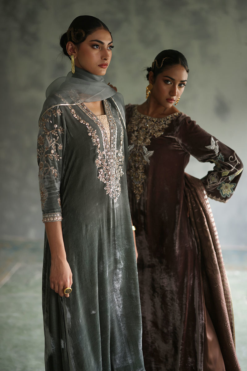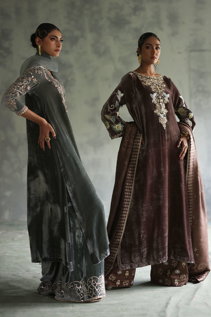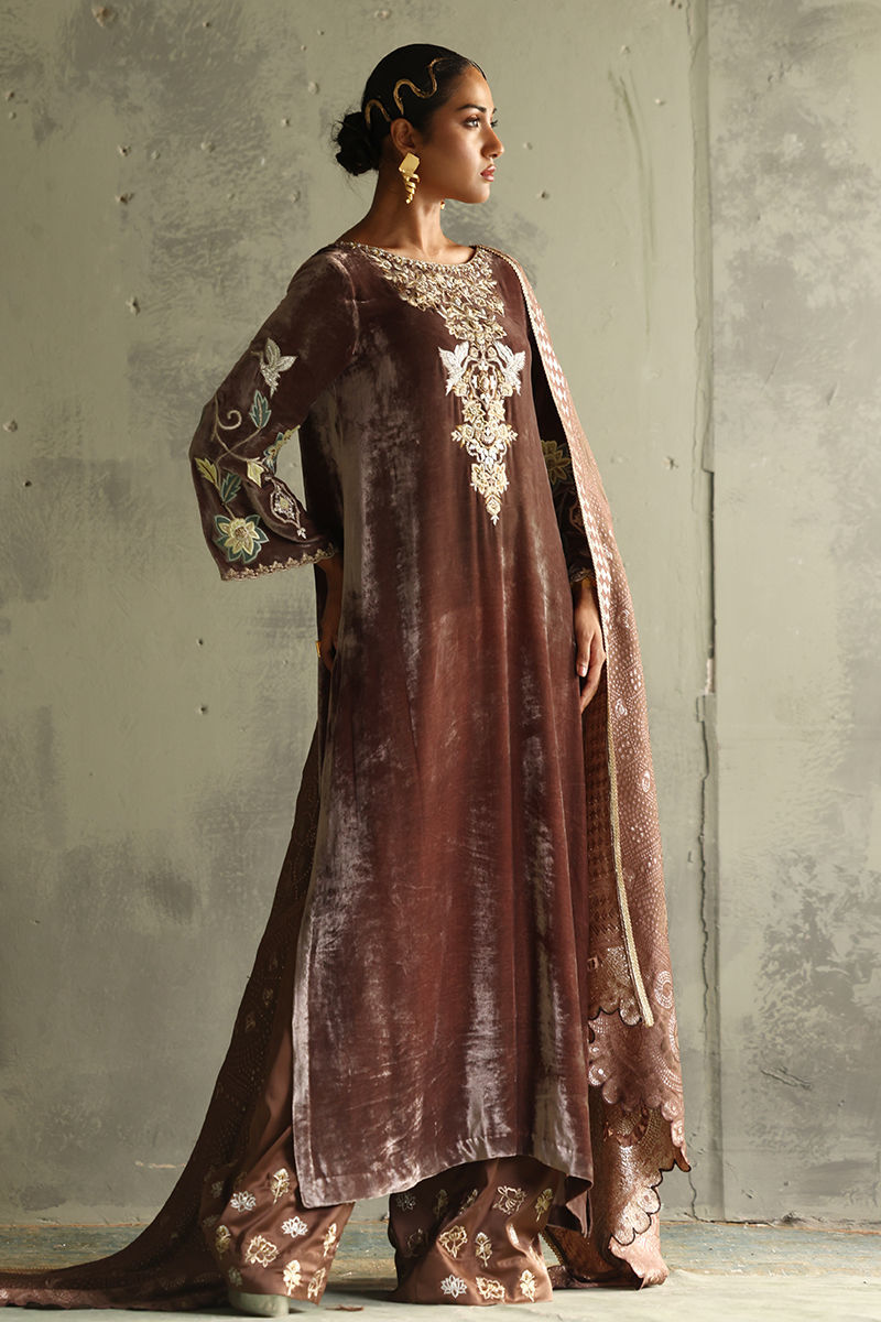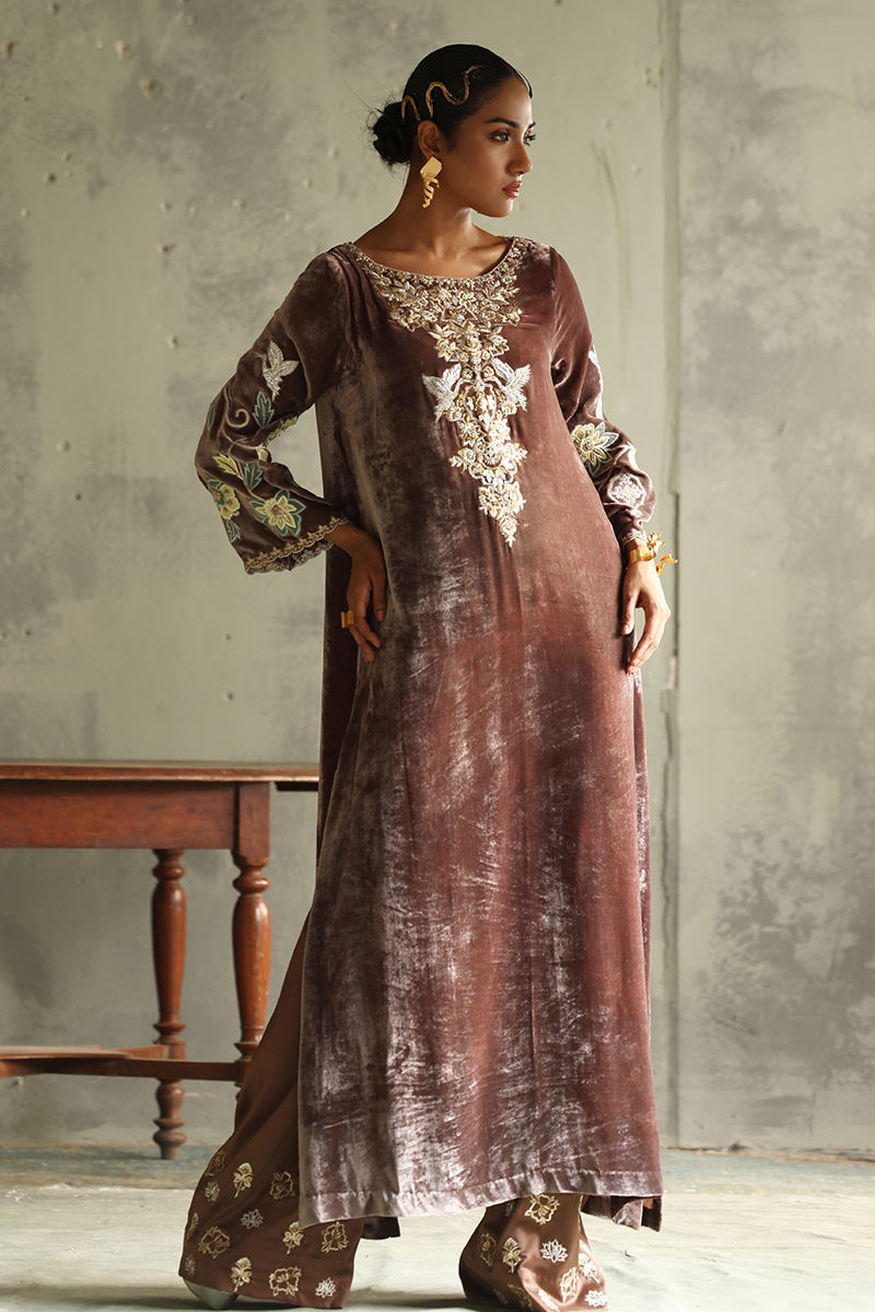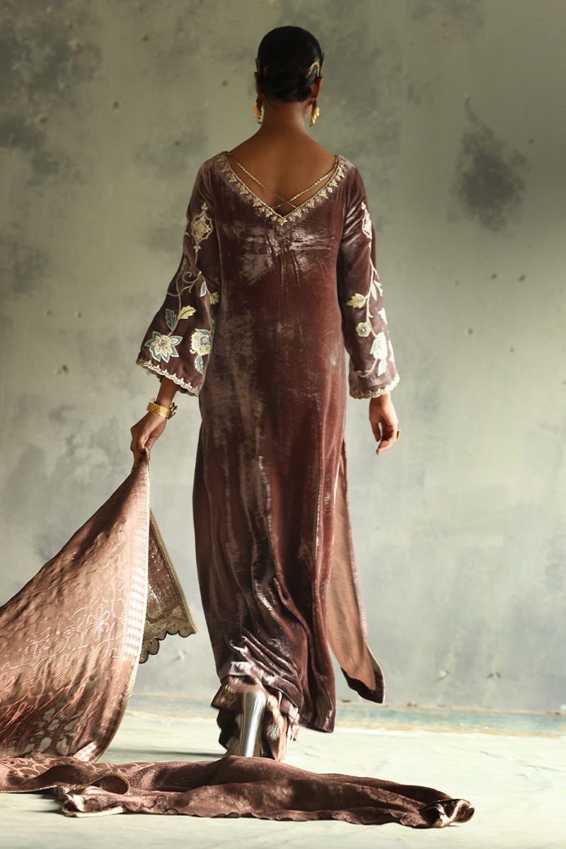 Color: Taupe Fabric: Pure Velvet Work Details: Embroidered and Embellished