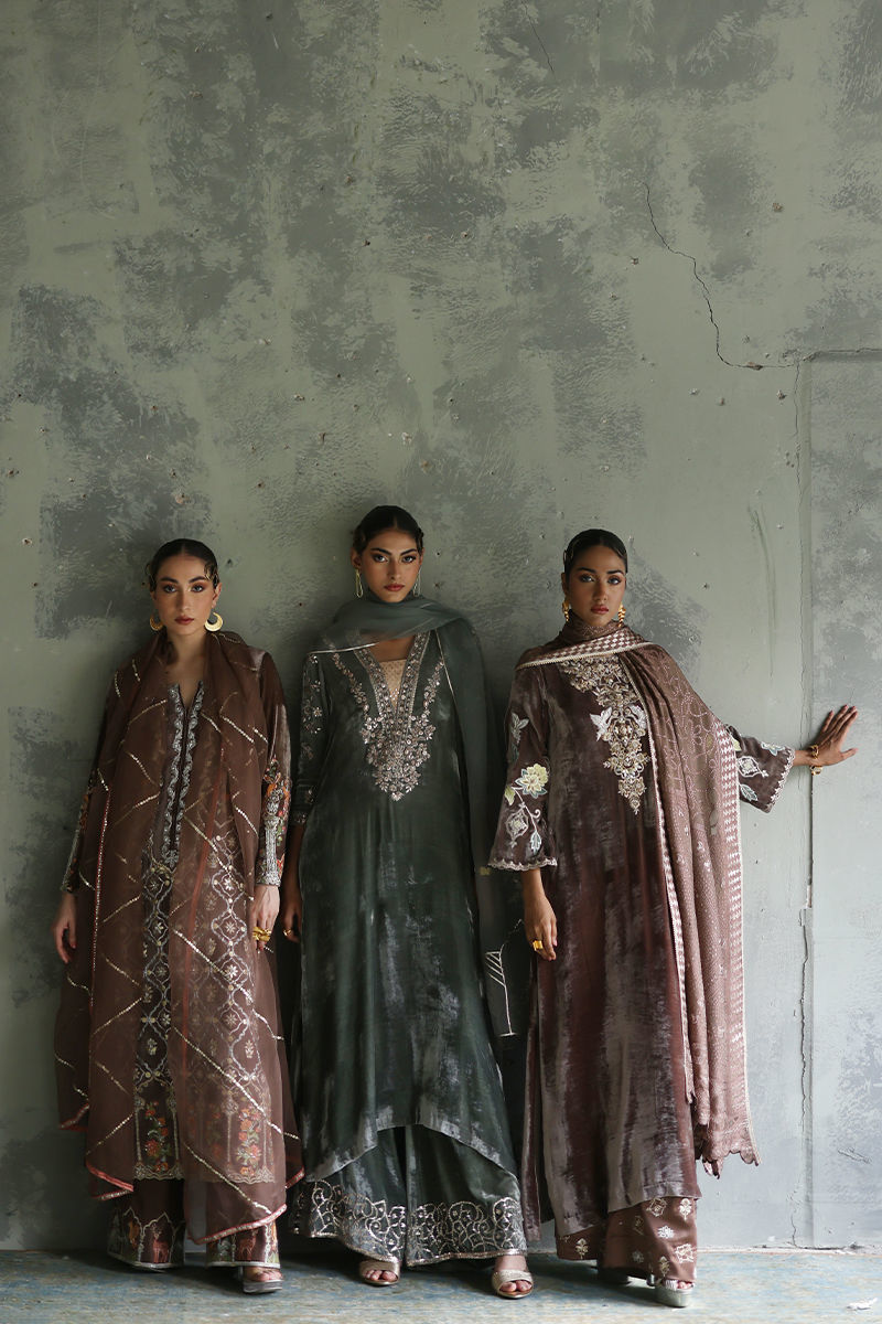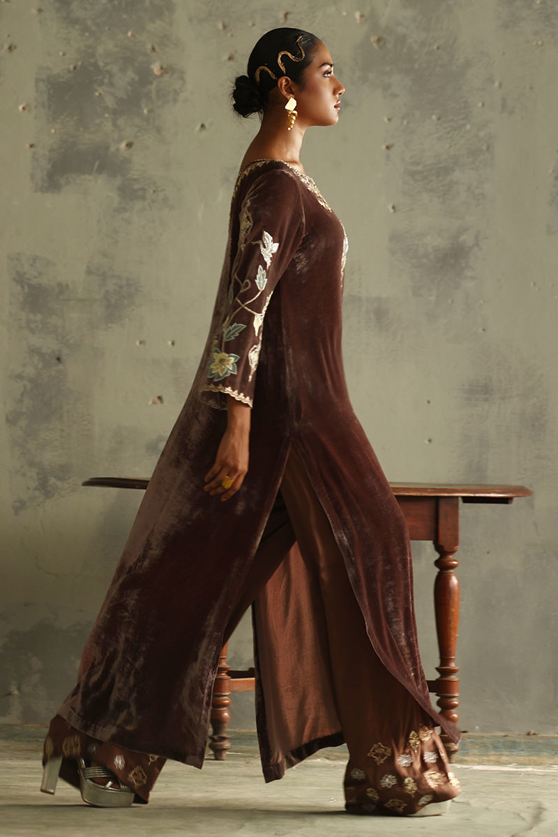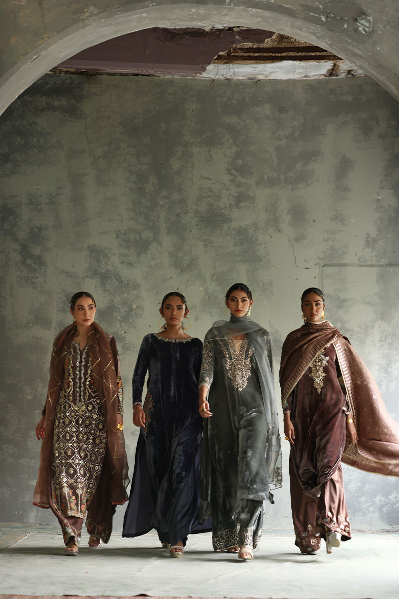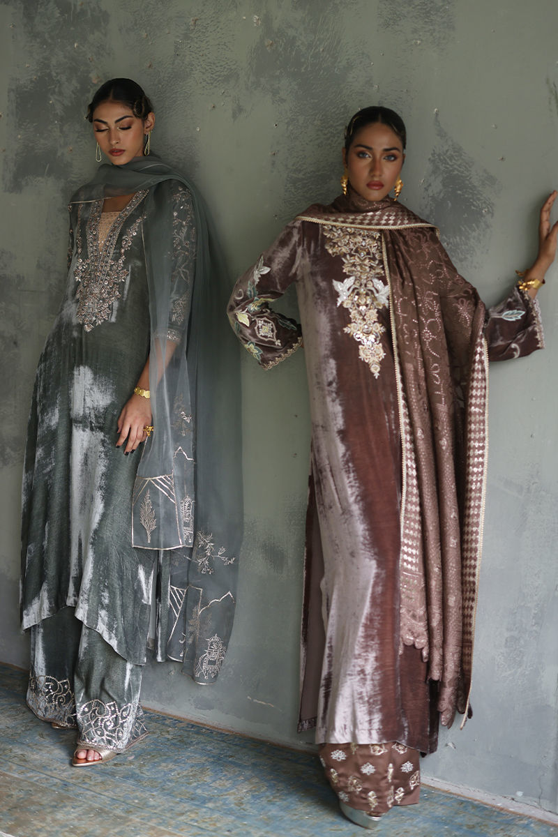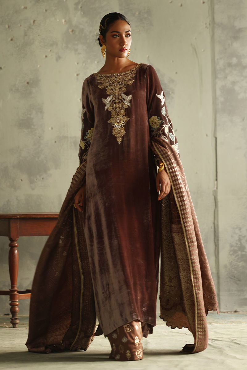 Color: Taupe Fabric: Pure Velvet Work Details: Embroidered and Embellished