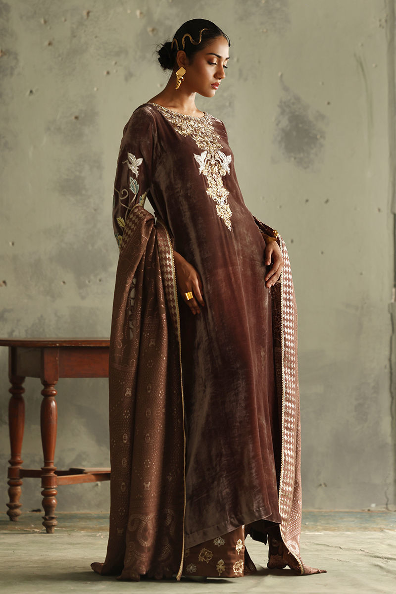 This exquisite taupe slight A-line shirt is made from pure velvet with a 51.5-inch length. The front neck is beautifully embroidered in silver, gold, and rose gold zari, featuring intricate handwork with tikki stones, kora, dapka, moti, nakshi, sequins, cutdana, and gota. The back neck continues this detailed handwork, while the sleeves are enhanced with colored sheesha silk appliqué and gold, silver, and rose gold zari embroidery. Paired with satin crepe culottes with zari embroidery at the bottom and a 42-inch length, the look is completed with a pure Banarsi dupatta, finished with elegant laces, offering a blend of modern sophistication and traditional opulence.