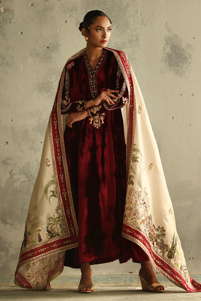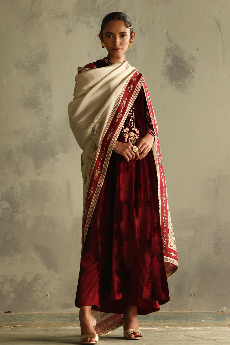 This luxurious maroon velvet prince panel shirt is crafted from pure velvet with a 52-inch length. It features intricate gold and antique zari embroidery, enhanced by exquisite handwork with cutdana, tikki stones, sequins, kora, dabka, and naqshi, creating a rich and detailed design. The 36-inch pants, made from texture silk, complement the shirt with a refined, modern touch. The ensemble is completed with a Shisha silk shawl, featuring intricate handwork of zardozi, gota, dhanak, and sequence flowers, adding a sophisticated and opulent finishing touch to this stunning set.