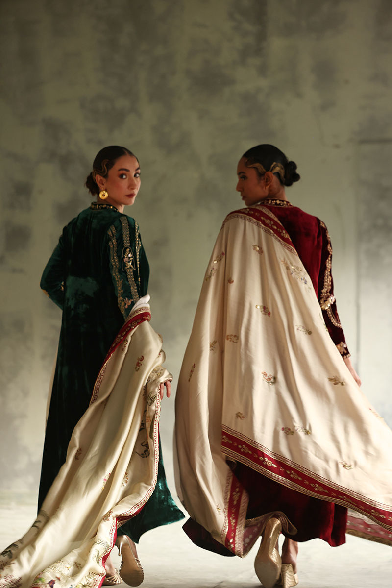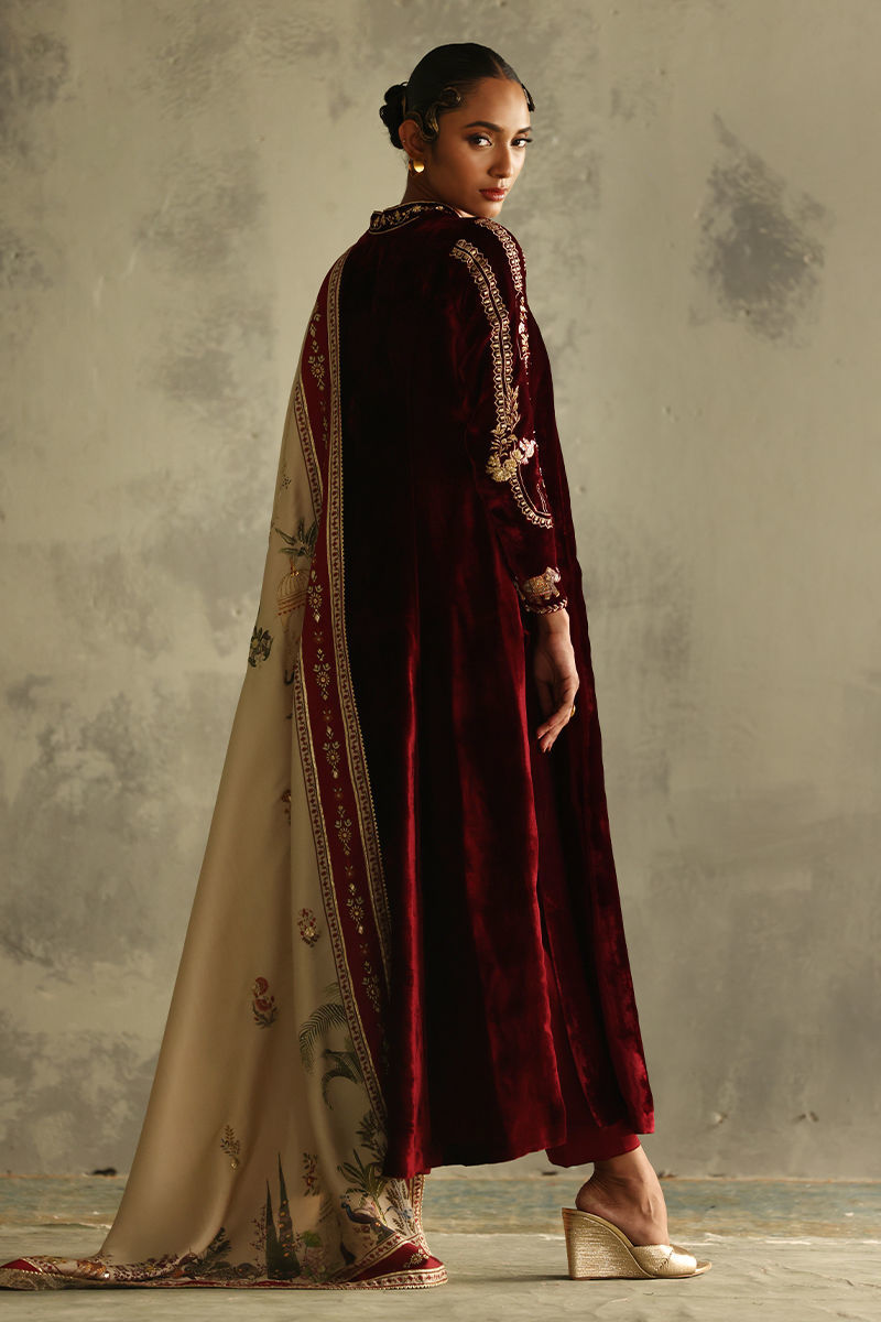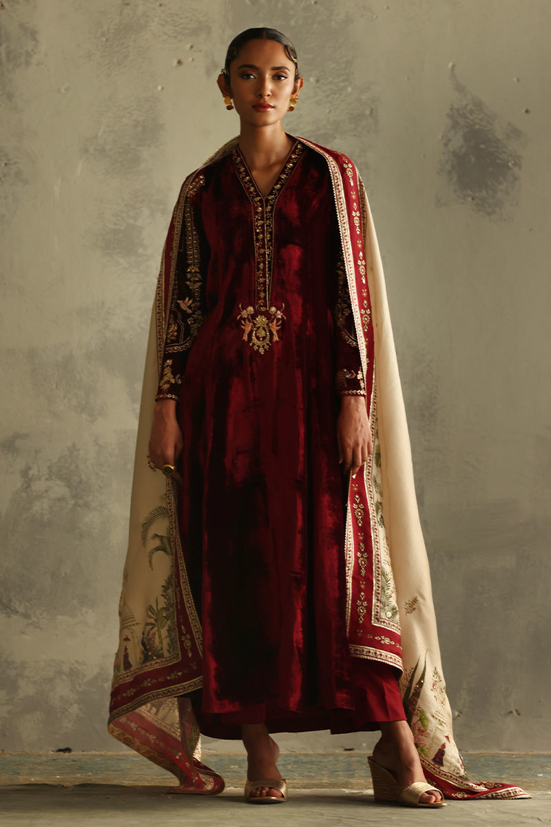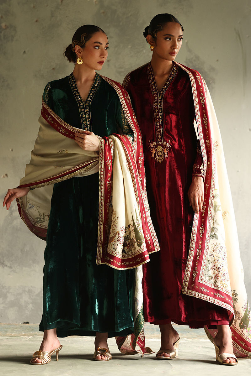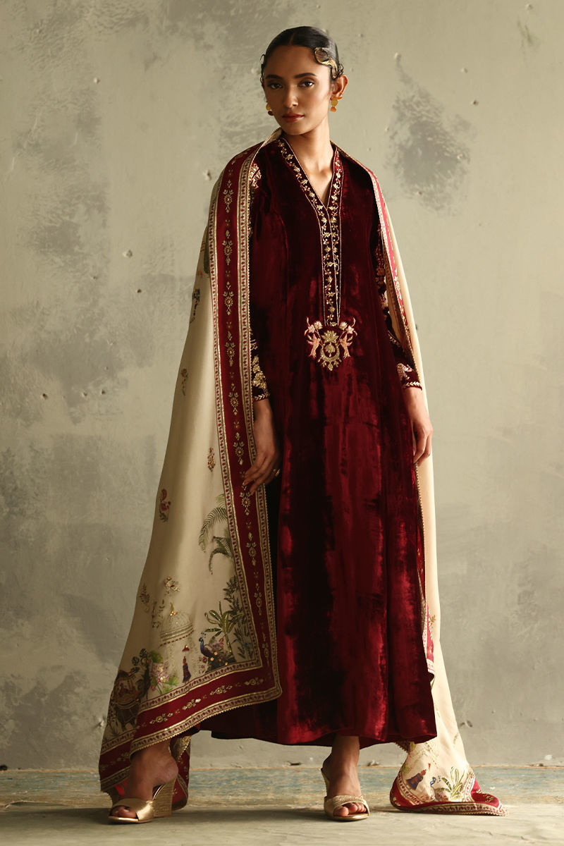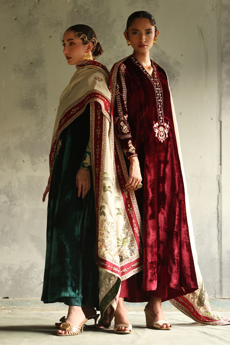 Color: Maroon Fabric: Pure Velvet Work Details: Embroidered and Embellished