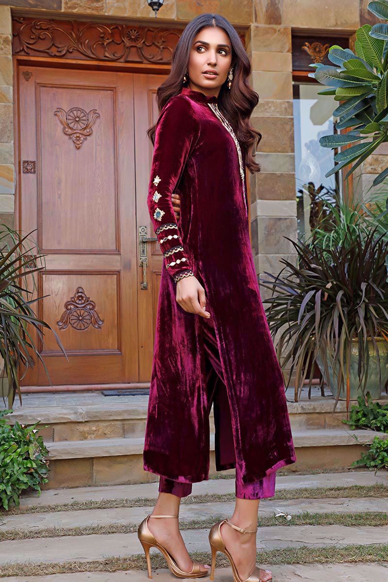 A charismatic, long plum color pure velvet shirt with mirror ornaments on button extension and sleeves. The band collar best suits the outfit. Complementing pure velvet pants can be purchased separately