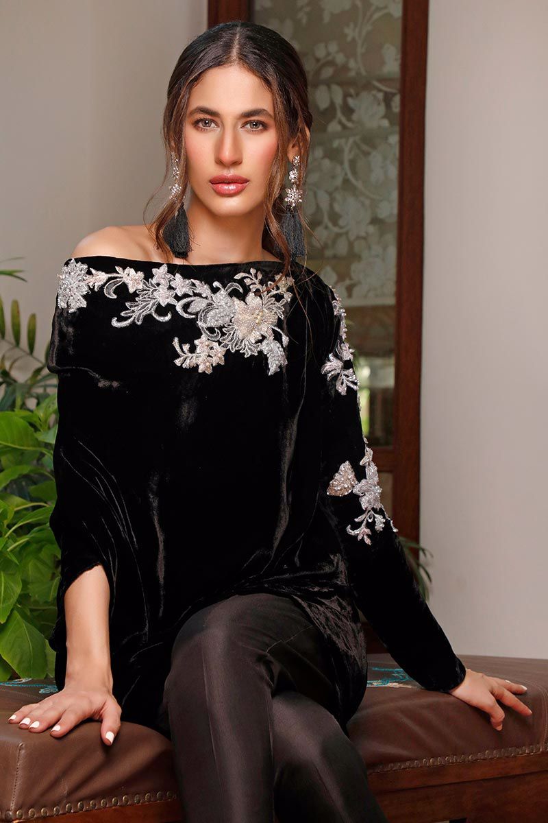 A trendy short, asymmetrical black pure velvet shirt. The off shoulder enchanting at its best with pearls, resham and stone embellishment. Can be paired with rawsilk pants