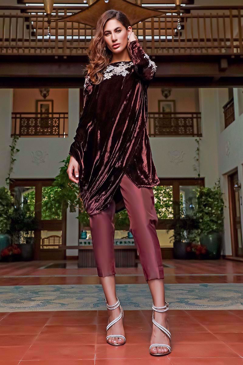 A trendy short, asymmetrical brown pure velvet shirt. The off shoulder enchanting at its best with pearls, resham and stones embellishment. Can be paired with raw silk pants