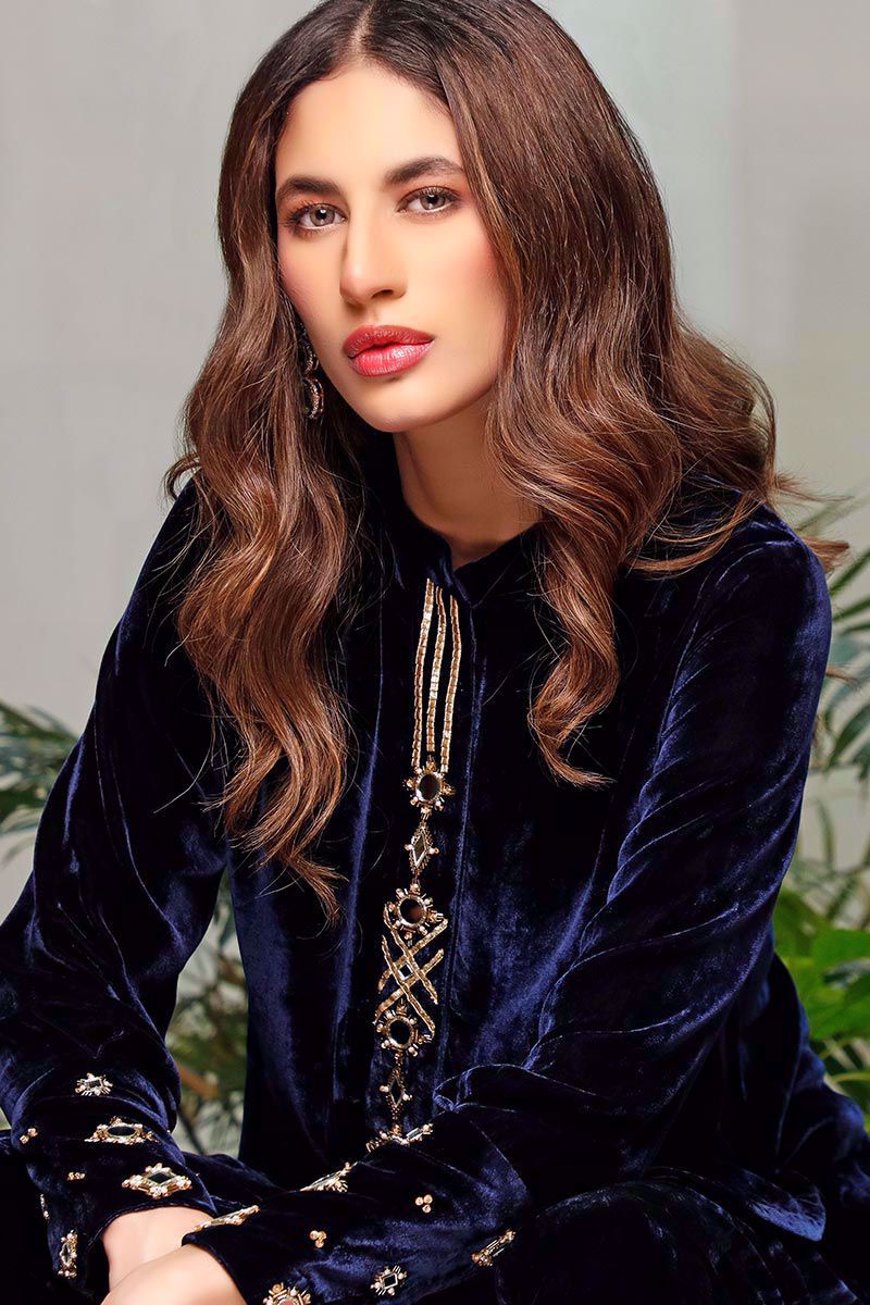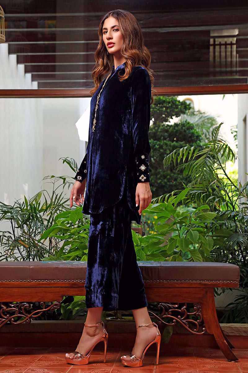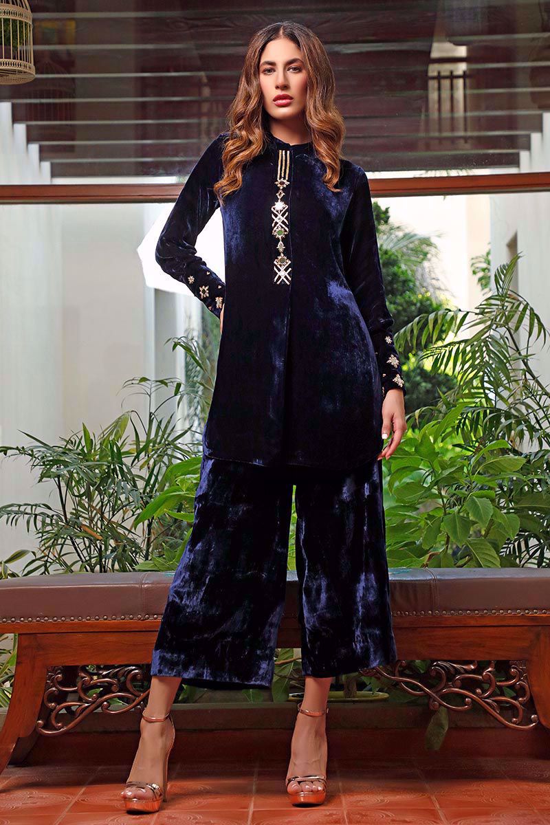 Color: Navy Blue Fabric: Velvet Work Details: Embroidered
