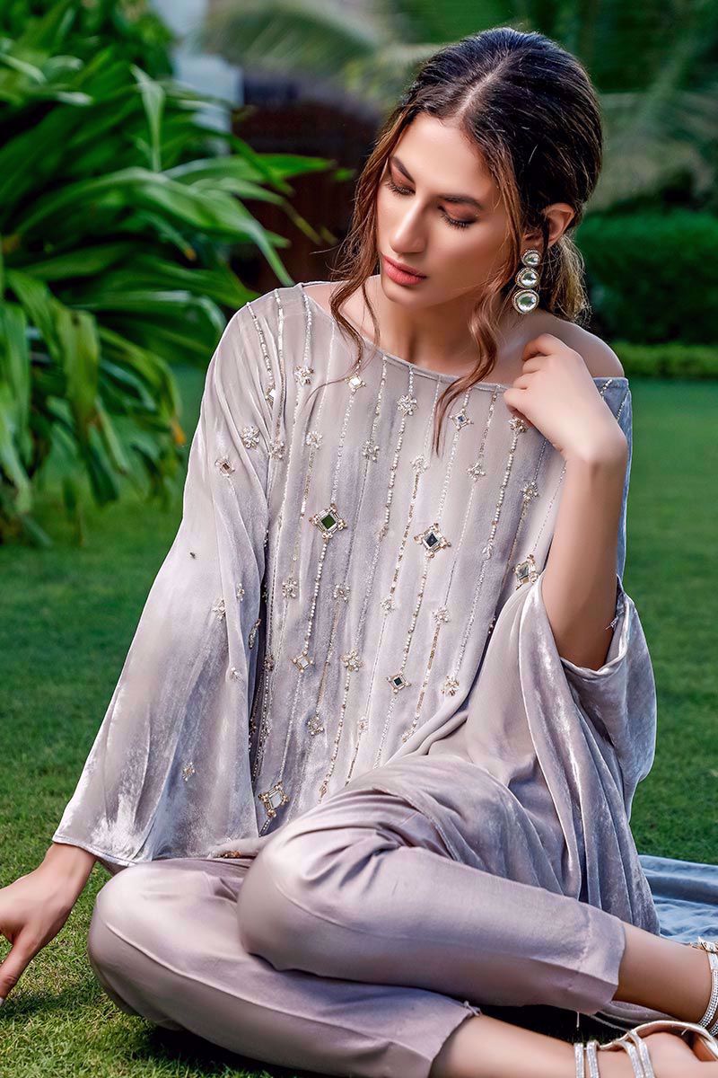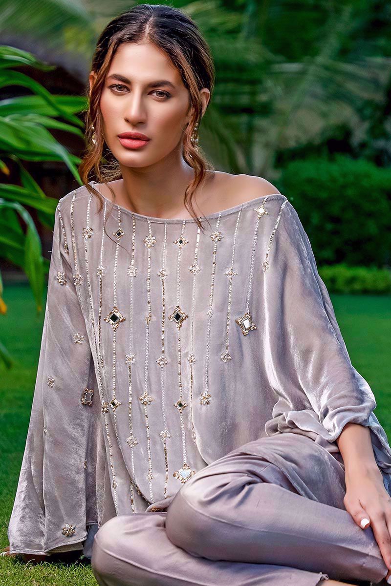 A masterfully tailored asymmetrical top in Grey velvet with off shoulder silhoutte. The mirror beaded embroidery uplifts the outfit giving it a shiny sparkle. Can be paired with pure raw silk pants.
