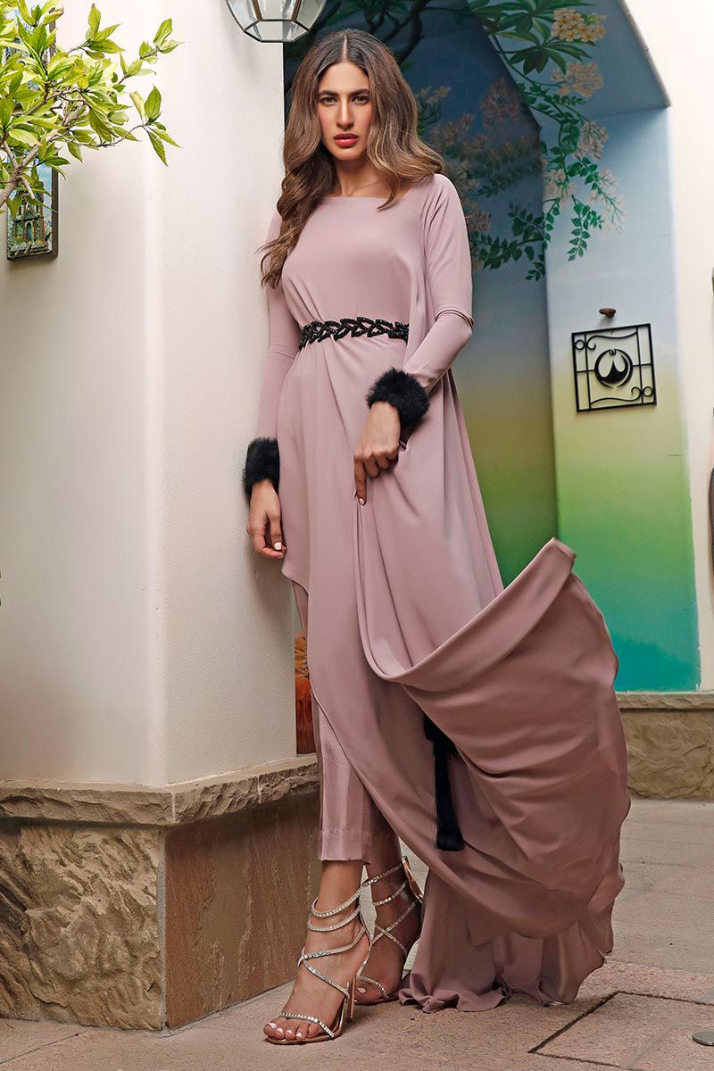 An exquisite asymmetrical, nude color semi georgette ensemble including fur cuff and embellished belt. The style is put together with same color pure raw silk pants which can be bought separately
