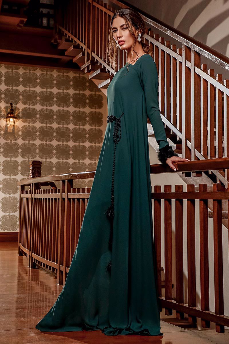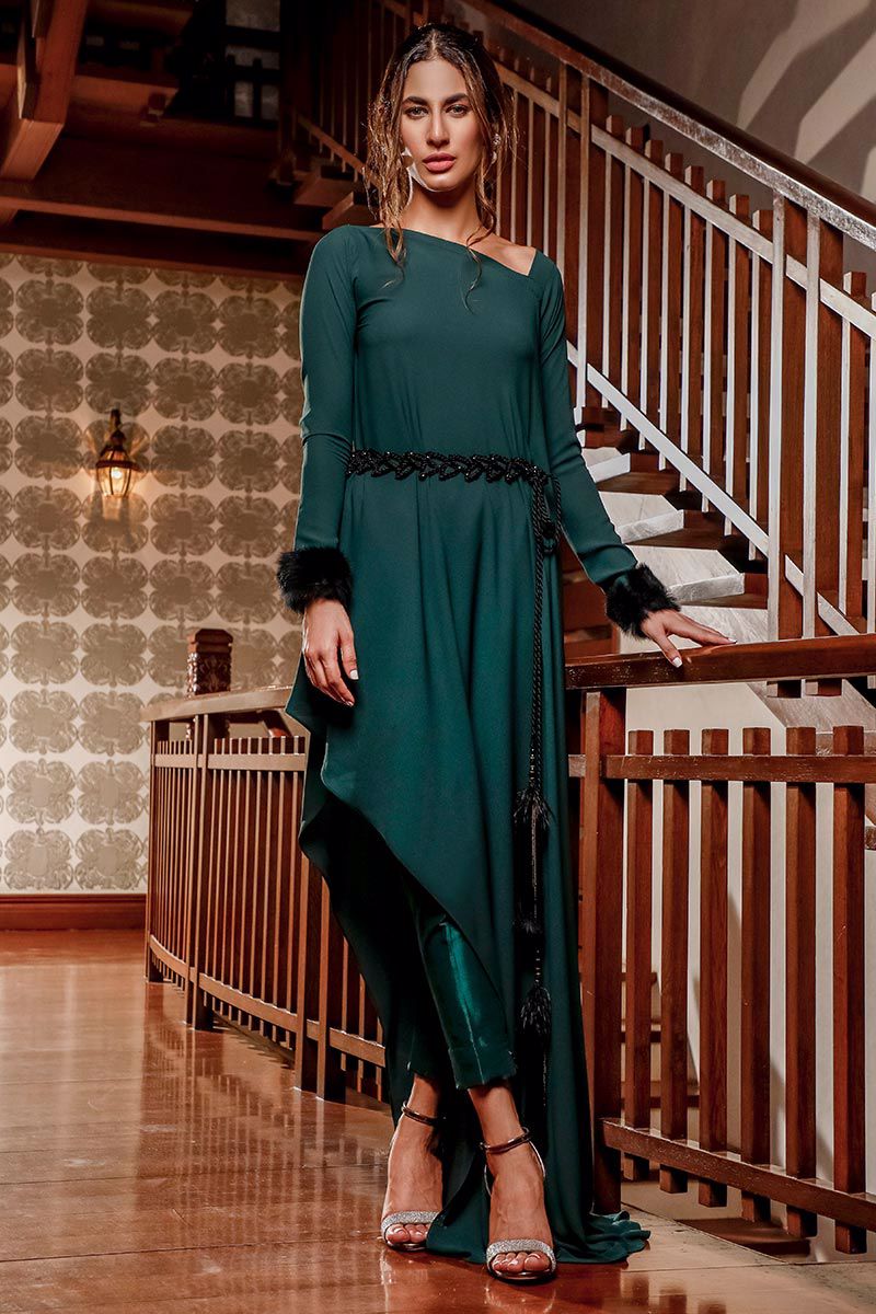 An exquisite asymmetrical, Emerald Green semi georgette ensemble including fur cuff and embellished belt. The style is put together with raw silk pants, to be purchased separately.