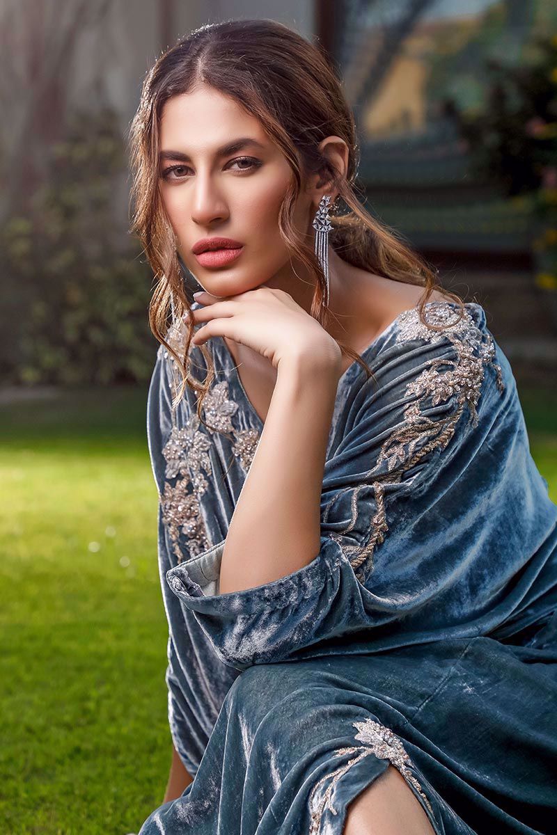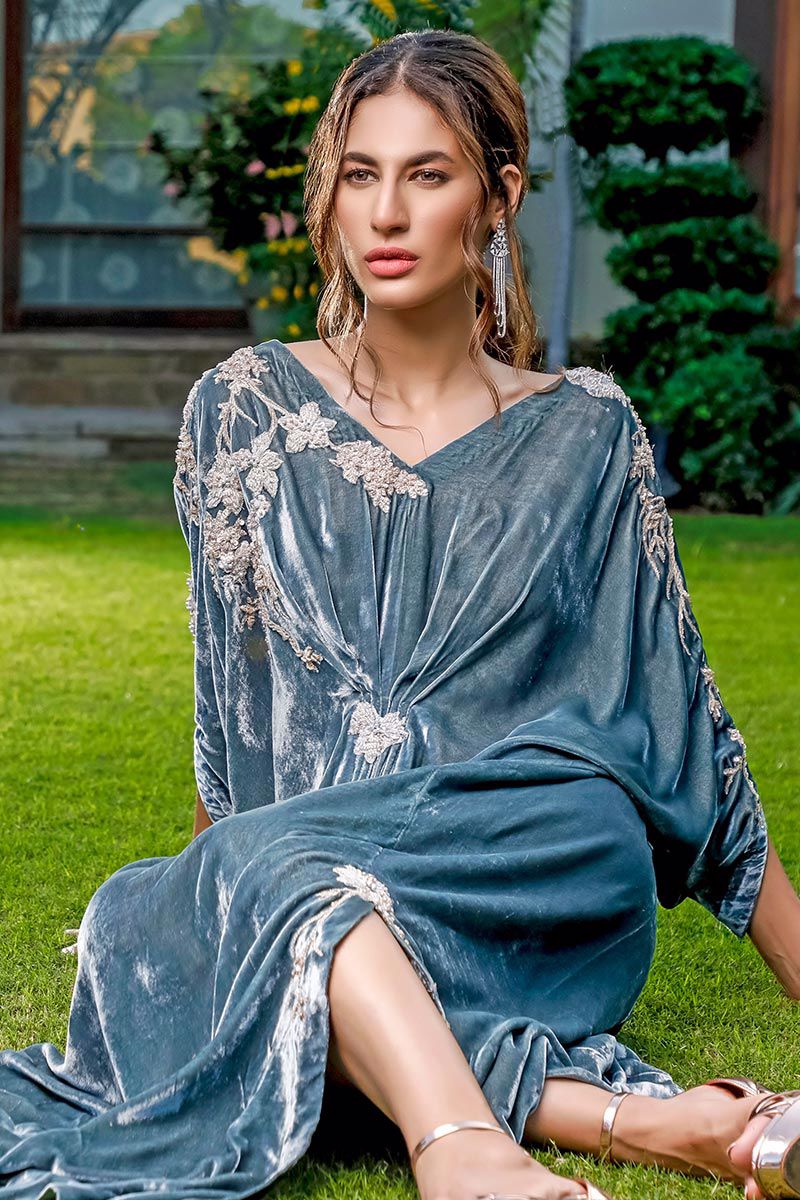 An ultra-modern pure velvet grey color kaftan with contemporary V-neckline crafted with 3D jeweled flowers, resham, stones, zari and pearls. Pleats on the waist gives the body a perfect hour glass shape.