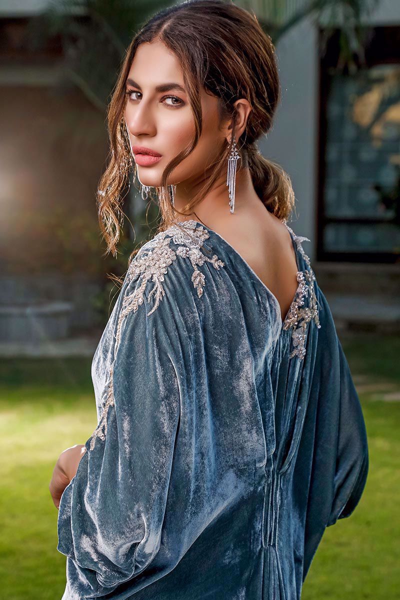 Color: Grey Fabric: Velvet Work Details: Embroidered
