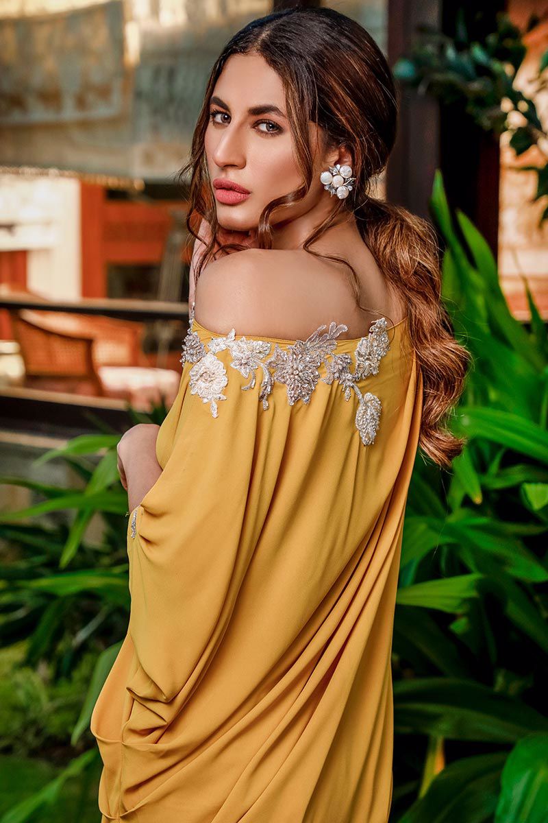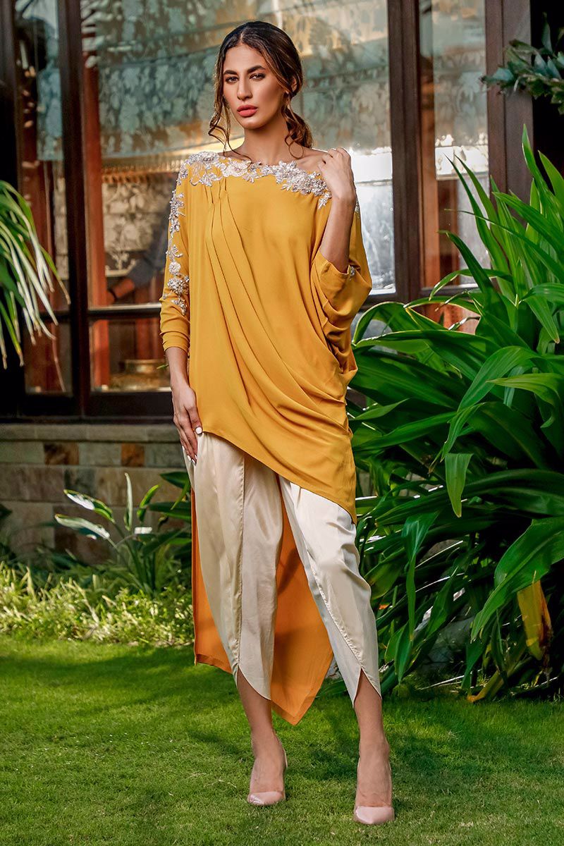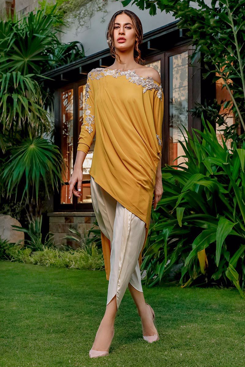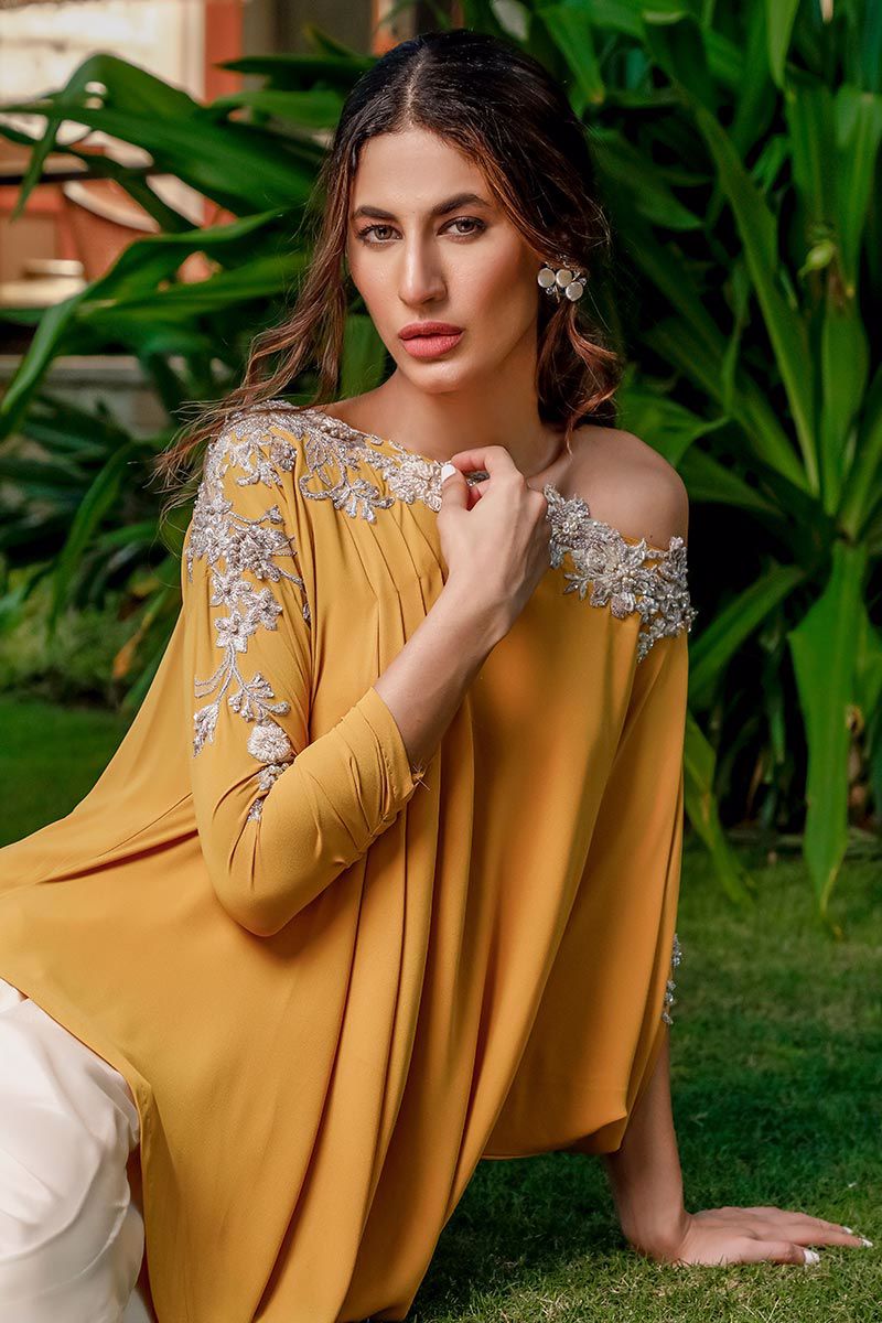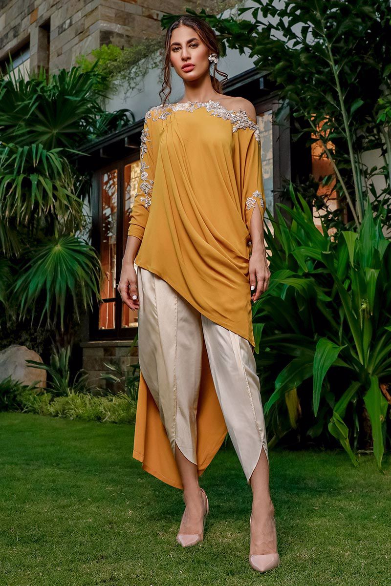 A gorgeous semi georgette mustard hi-low top with beautiful embellishment over the off shoulder neckline with resham, pearls, stones and crystals. Can be paired with ivory color tulip shalwar.