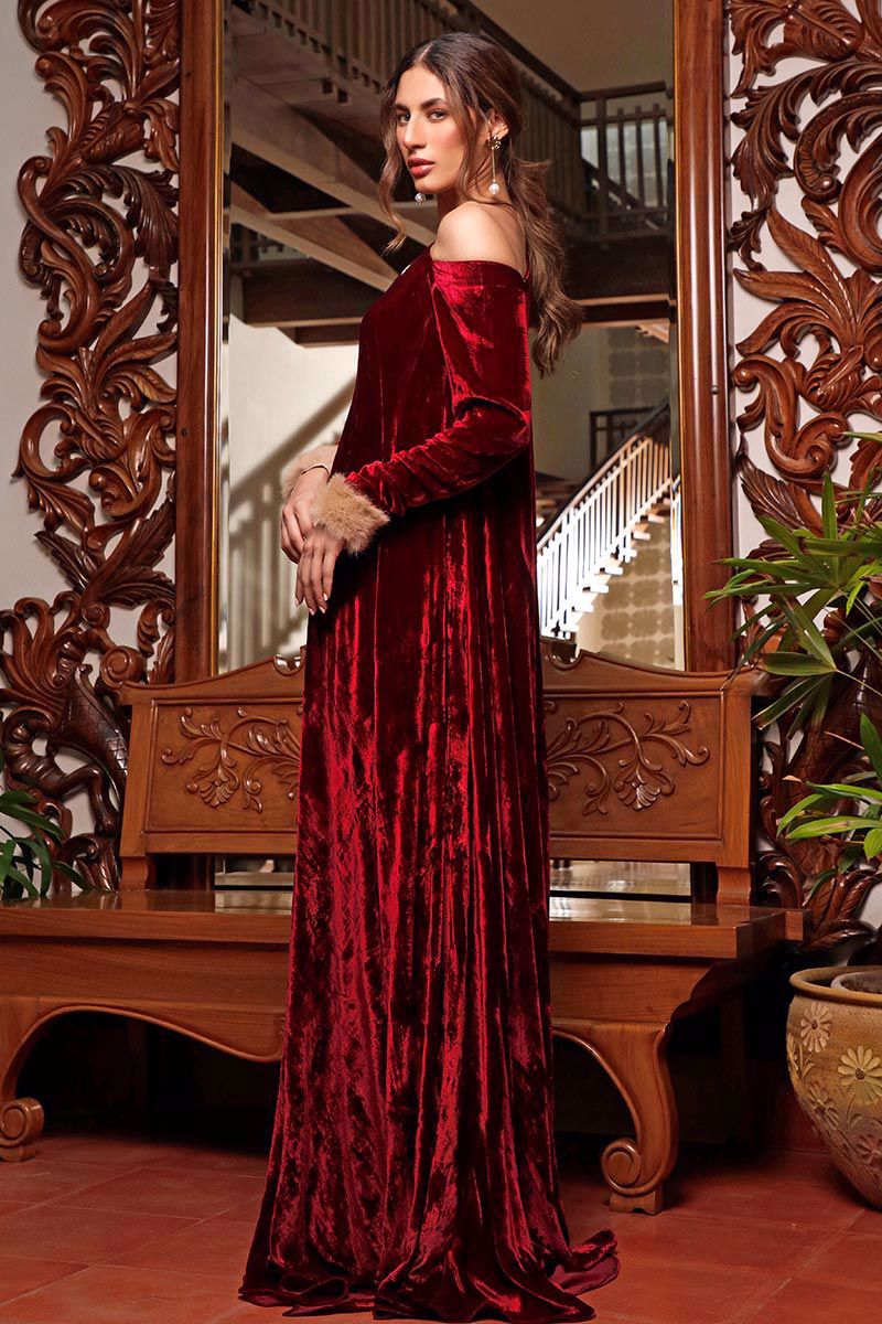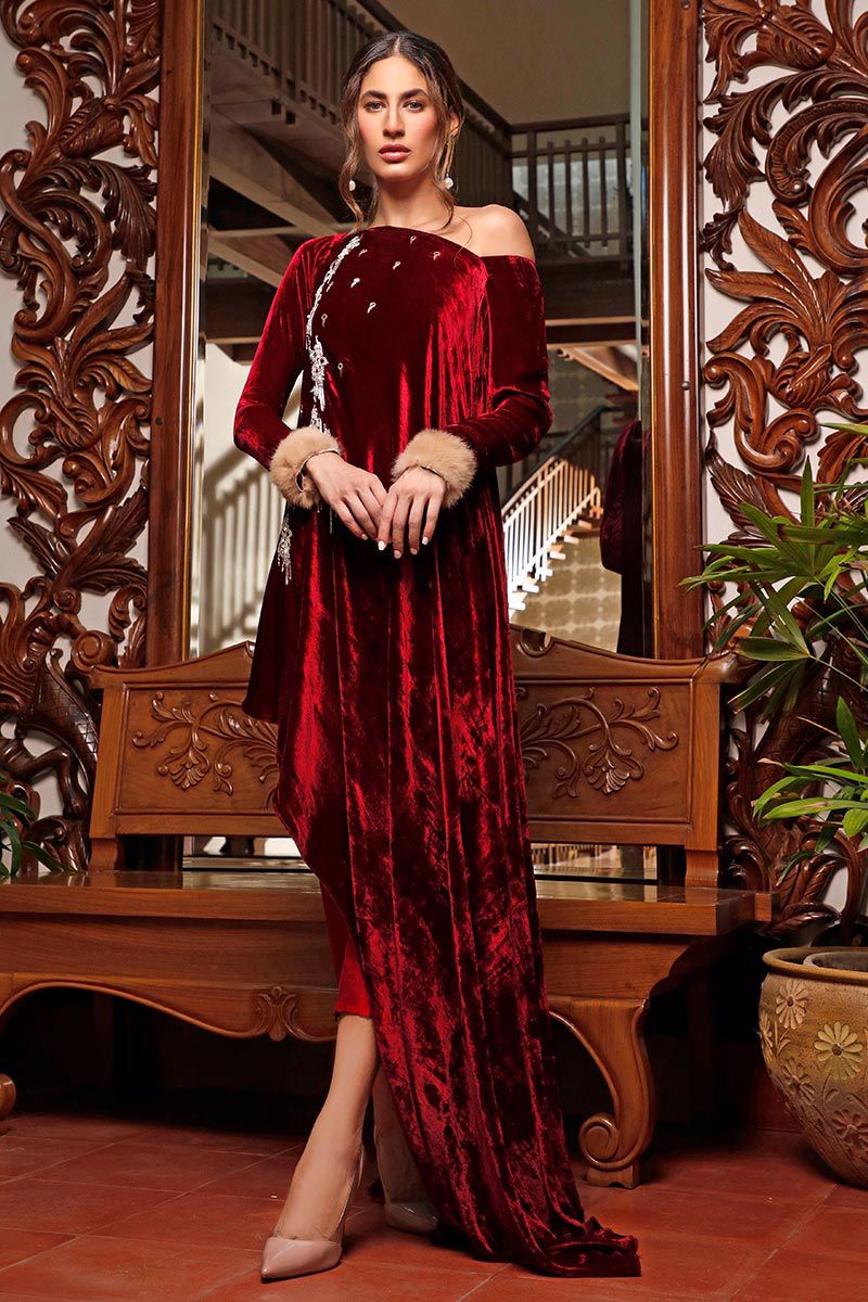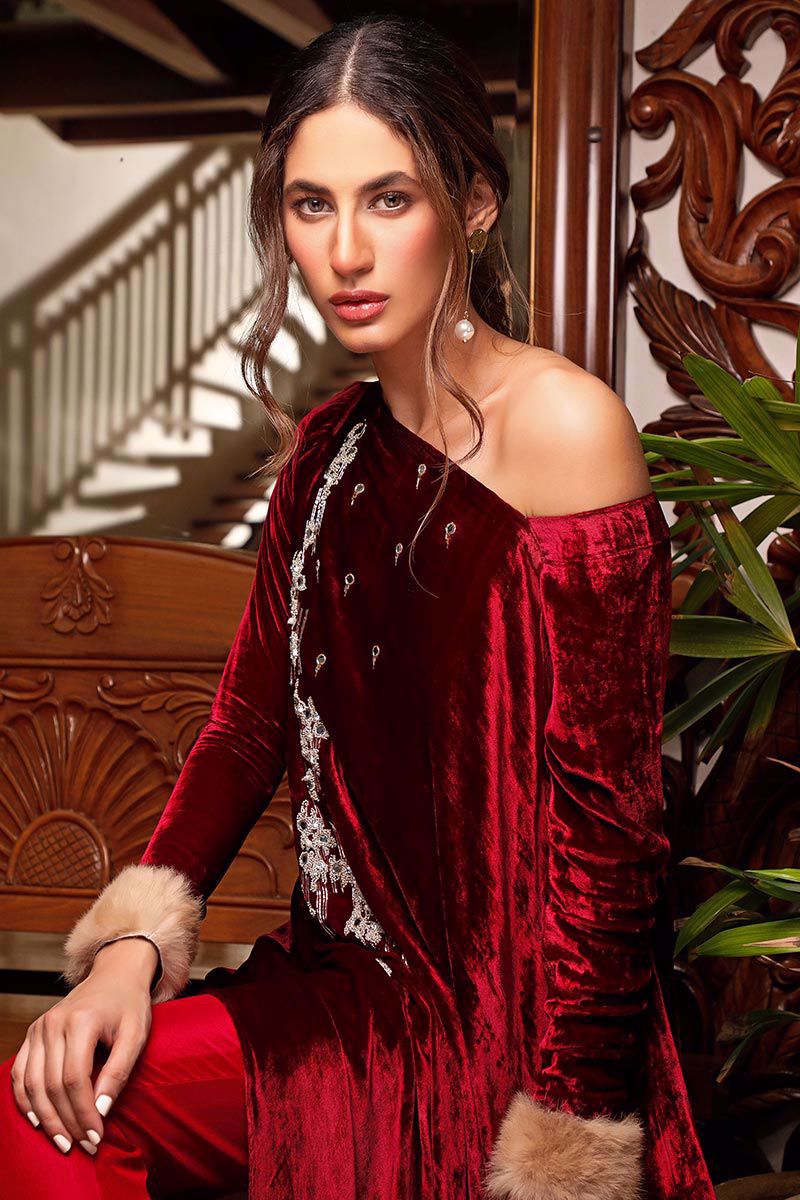 Color: Rose Red Fabric: Velvet Work Details: Embroidered