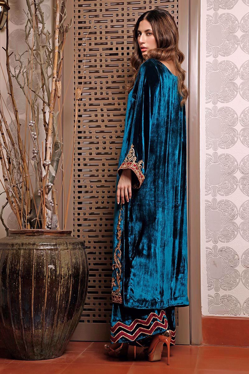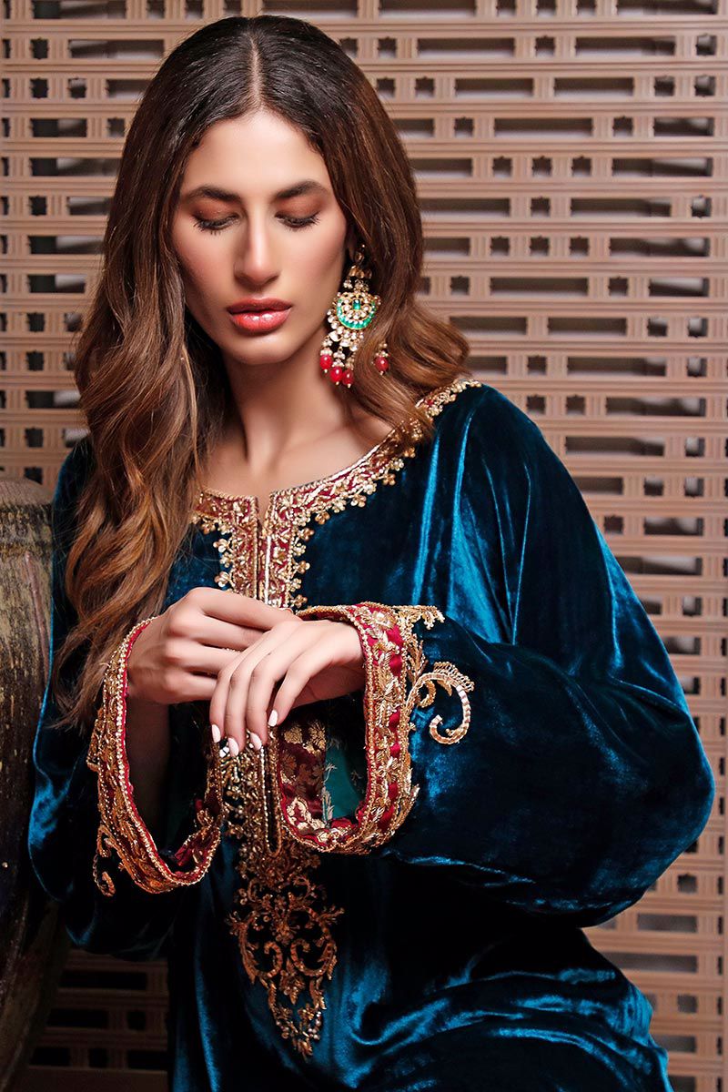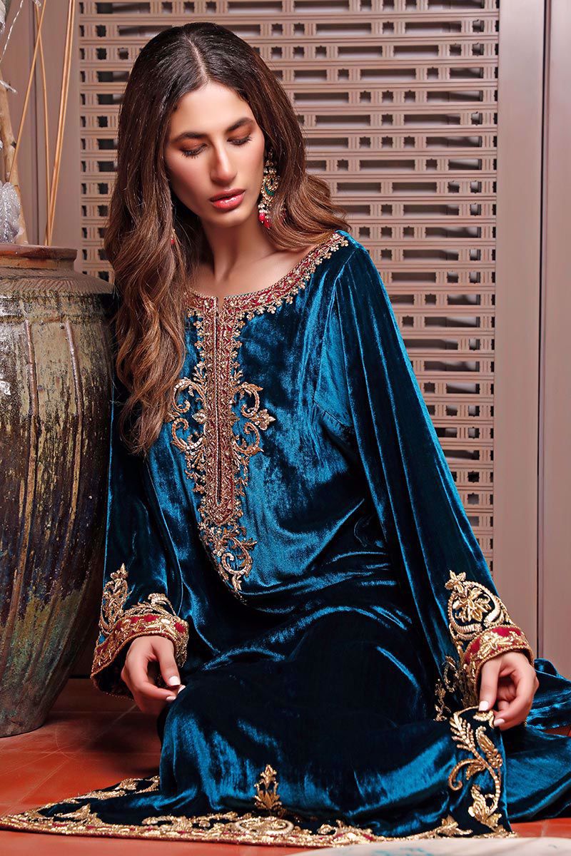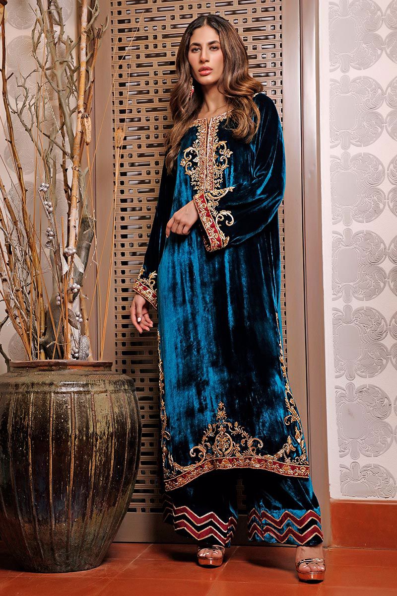 Color: Teal Fabric: Velvet Work Details: Embroidered