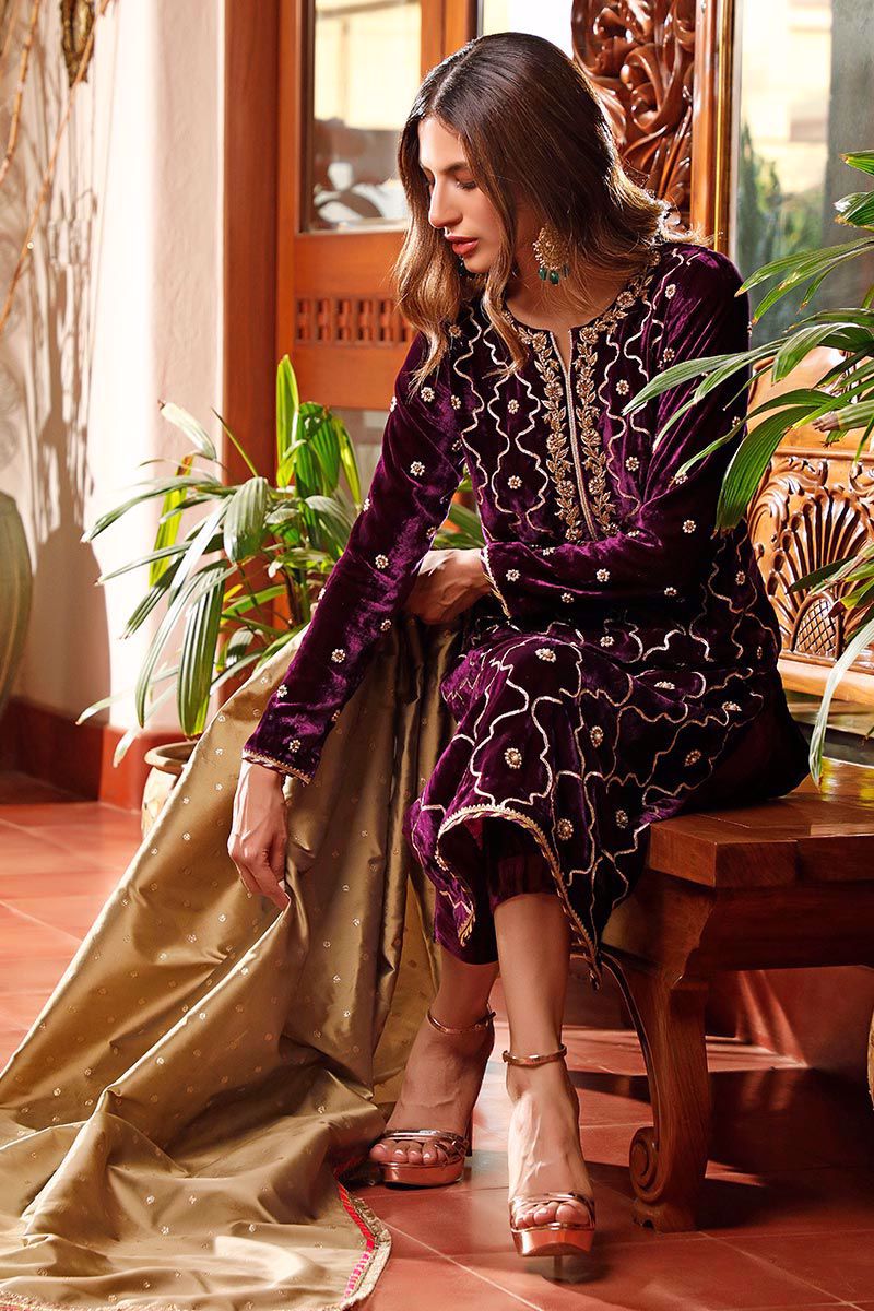 A classic long purple velvet shirt with dainty zardozi, dabka, kora and naqshi handwork around the neckline with an overall persian motif jal made of gota. Perfectly paired with straight velvet pants and beige gold banarsi dupatta (to be bought separately)