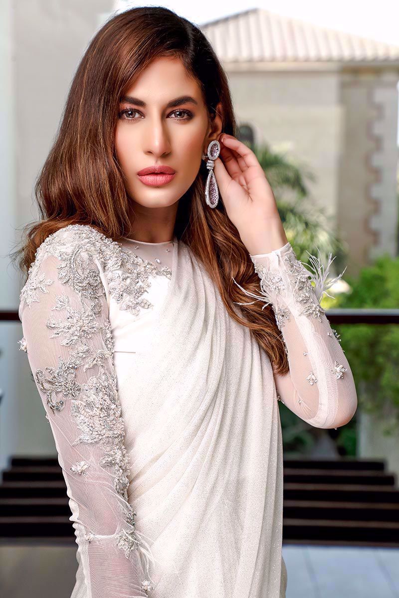 A sophisticated ivory saree gown comprising of pure georgette and moonlight fabric. The bodice is incorporated with sheer net in yoke and sleeves with adornments of pearls, stones, resham, kora, dabka and feathers.